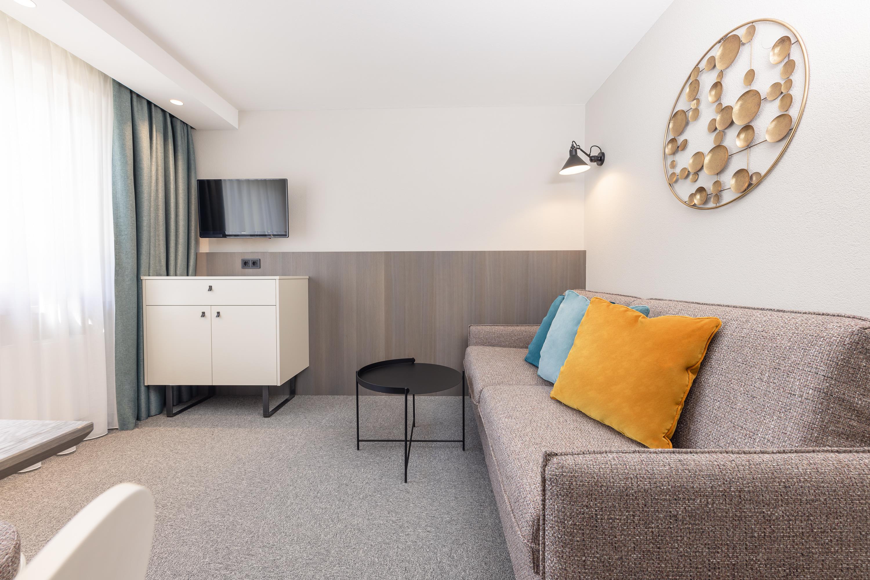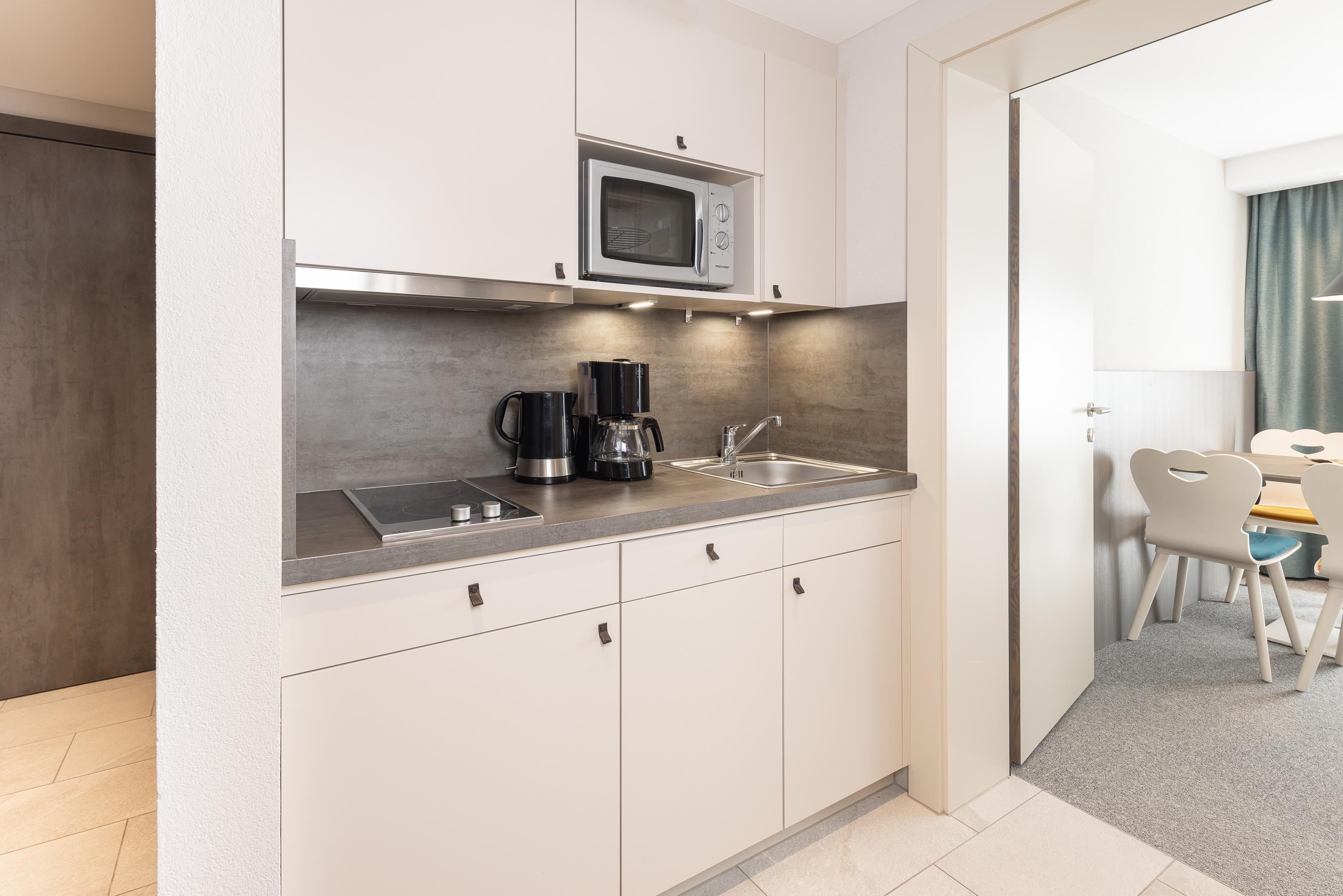 Appartement 5 mit ca. 40 m² im 1. Obergeschoss; Eingangsbereich mit Garderobe; Küche mit 2-Platten-Herd, Mikrowelle, Spülmaschine, Filterkaffeemaschine, Teekocher, Toaster, Geschirr, Kochutensilien uvm.; 1 Badezimmer mit Dusche/WC; 1 Schlafzimmer mit Doppelbetten; Wohnraum mit Essplatz und 2 zusätzlichen Schlafmöglichkeiten; Südbalkon zum Relaxen.