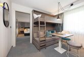 Appartement 10 mit ca. 30 m² im 2. Obergeschoss: kleiner Vorraum mit Küche (2-Platten-Herd, Mikrowelle, Spülmaschine, Filterkaffeemaschine, Teekocher, Toaster, Geschirr, Kochutensilien usw.); 1 Badezimmer mit Dusche/WC; 1 Schlafzimmer mit Doppelbett; Wohnraum mit Essplatz und 1 zusätzlichen Schlafmöglichkeit; Appartement ohne Balkon.