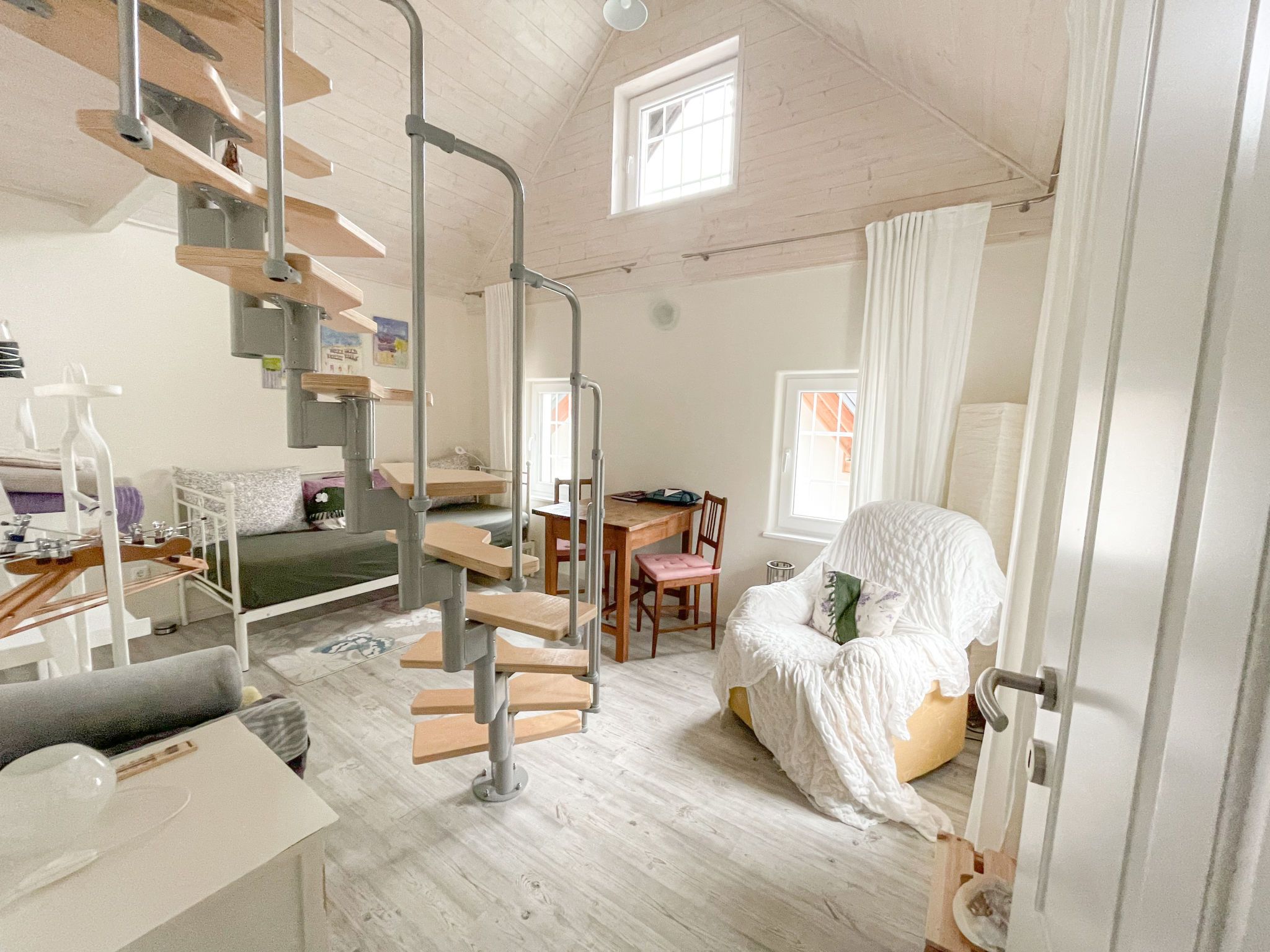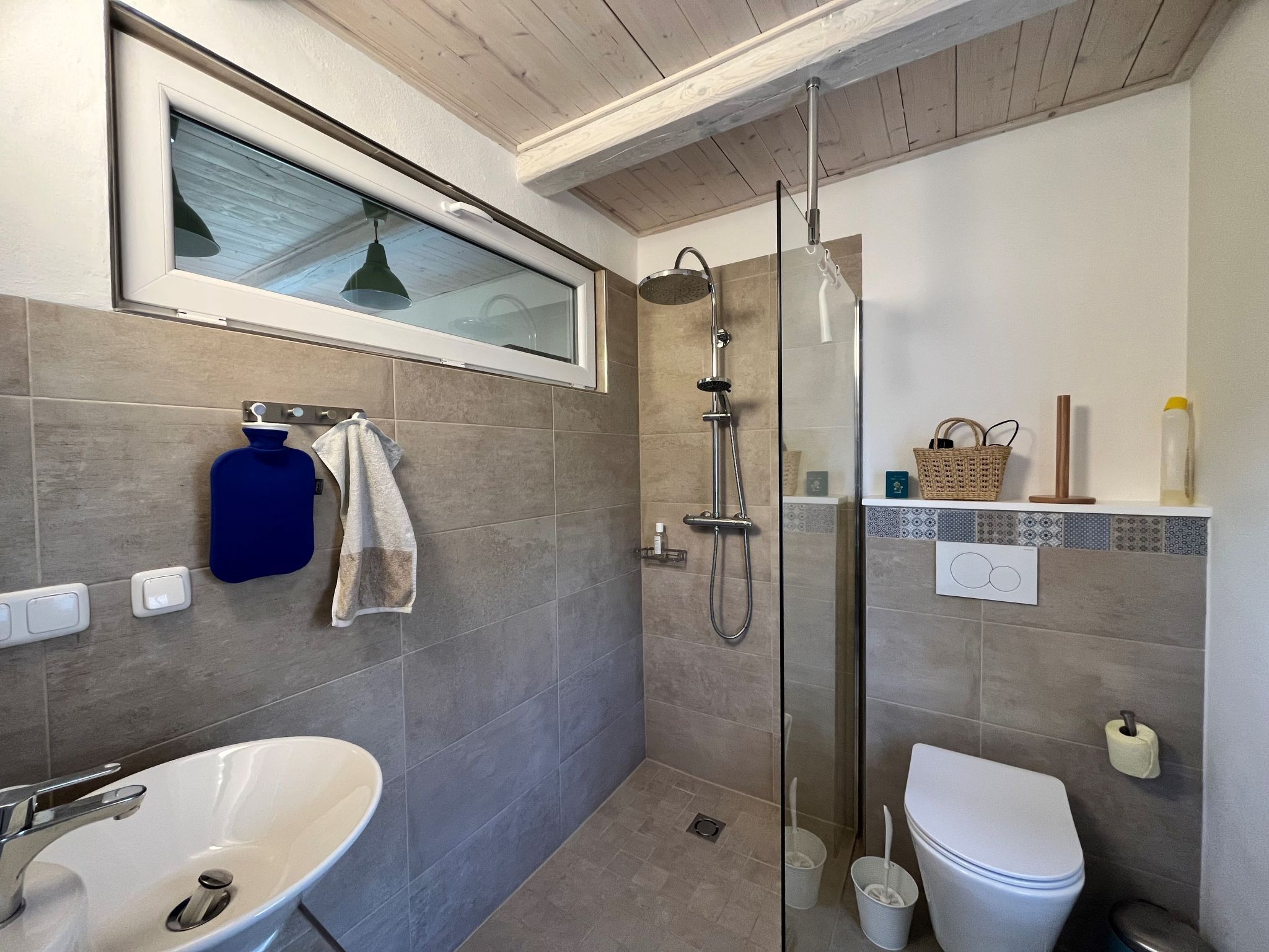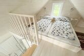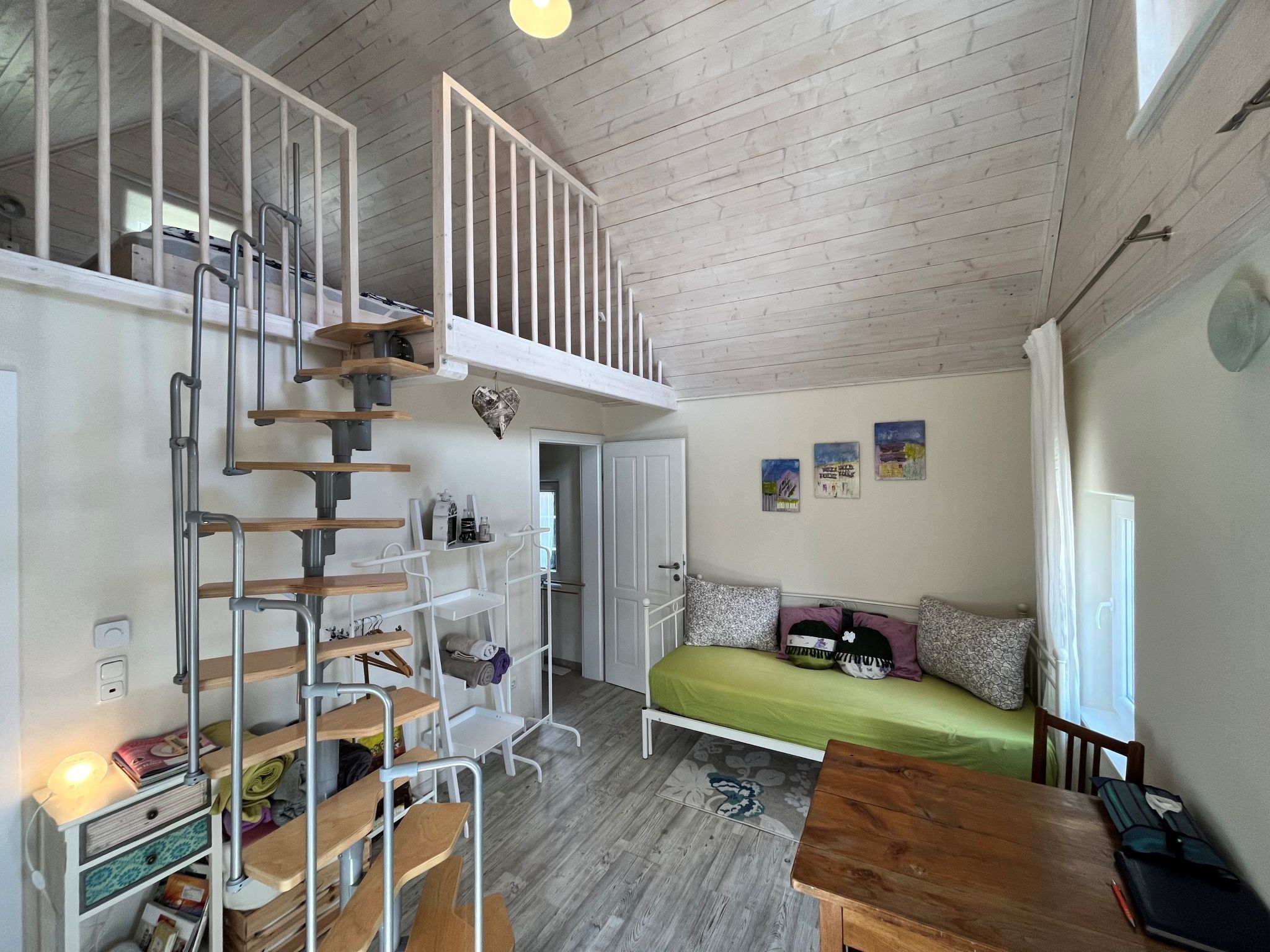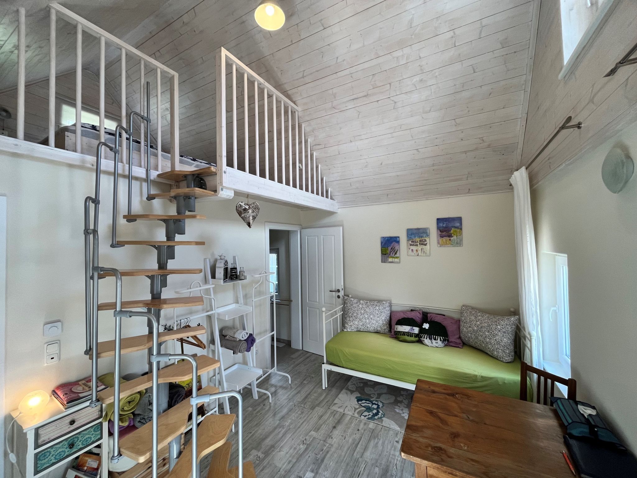 1-Zimmer-Haus 33 m2, im erhöhten Erdgeschoss. Objekt geeignet für 2 Erwachsene. Teilweise abgeschrägt, renoviert im Jahre 2021, geschmackvoll und gemütlich eingerichtet: Wohn-/Esszimmer mit Esstisch und Dusche/WC. Abgeschrägte Galerie mit 1 Doppelbett. Kochnische im Eingang (Mini-Backofen, 2 Induktionskochplatten, Wasserkocher). Parkettboden. Zur Verfügung: Babybett bis 2 Jahre, Haartrockner. Internet (WLAN, gratis). Bitte beachten: Nichtraucher-Haus. Maximal 1 Haustier/Hund erlaubt. Anstelle eines abgeschlossenen Schlafzimmers befinden sich manche Schlafplätze in einem offenen Bereich (Galerie, Nische etc.).