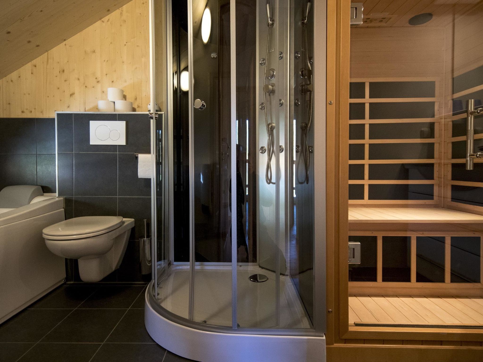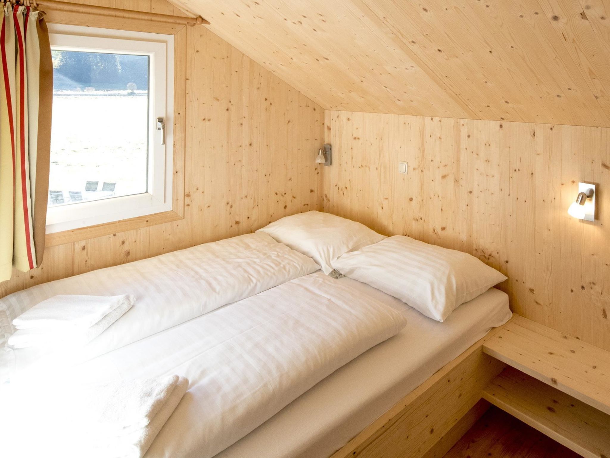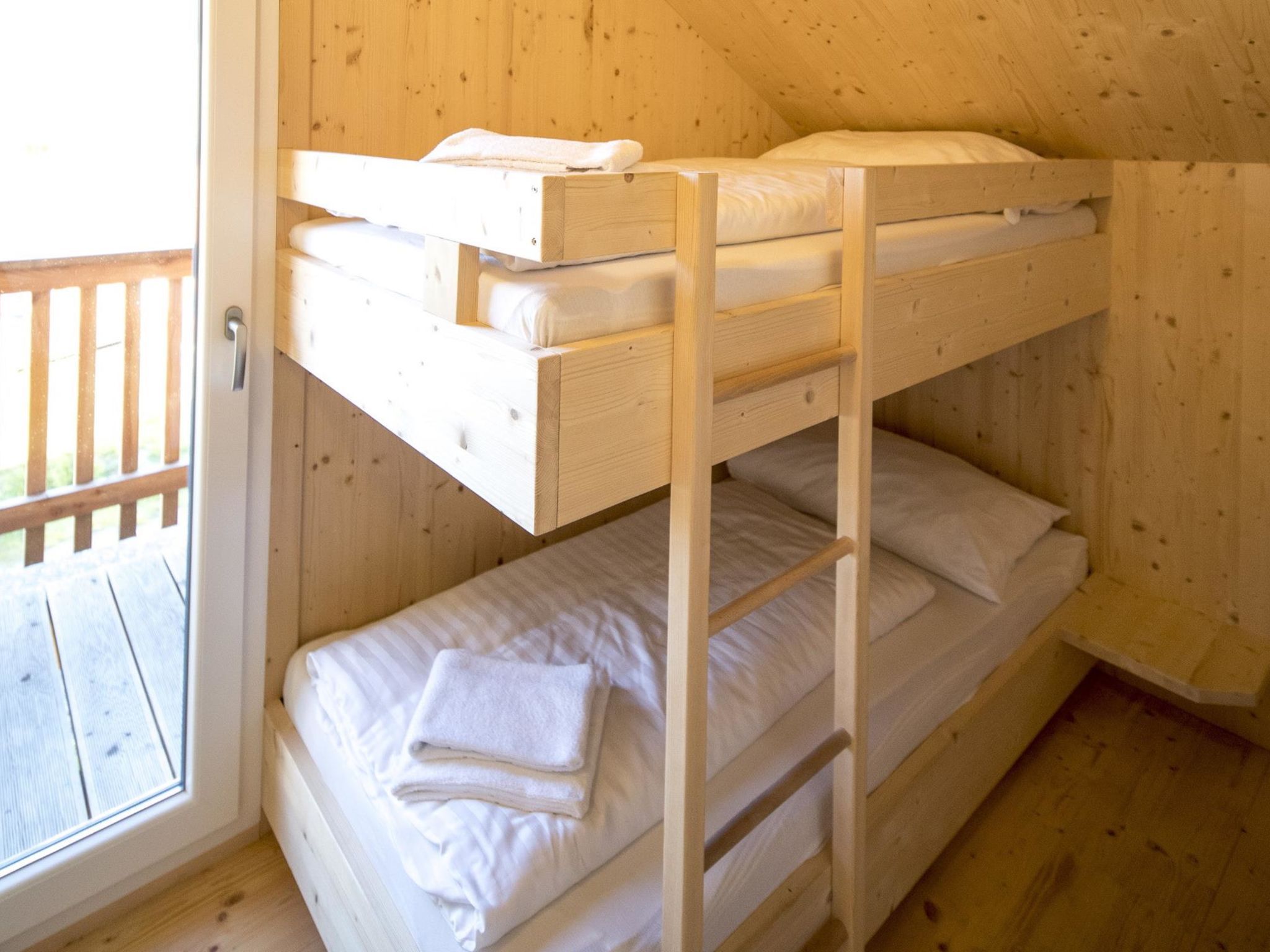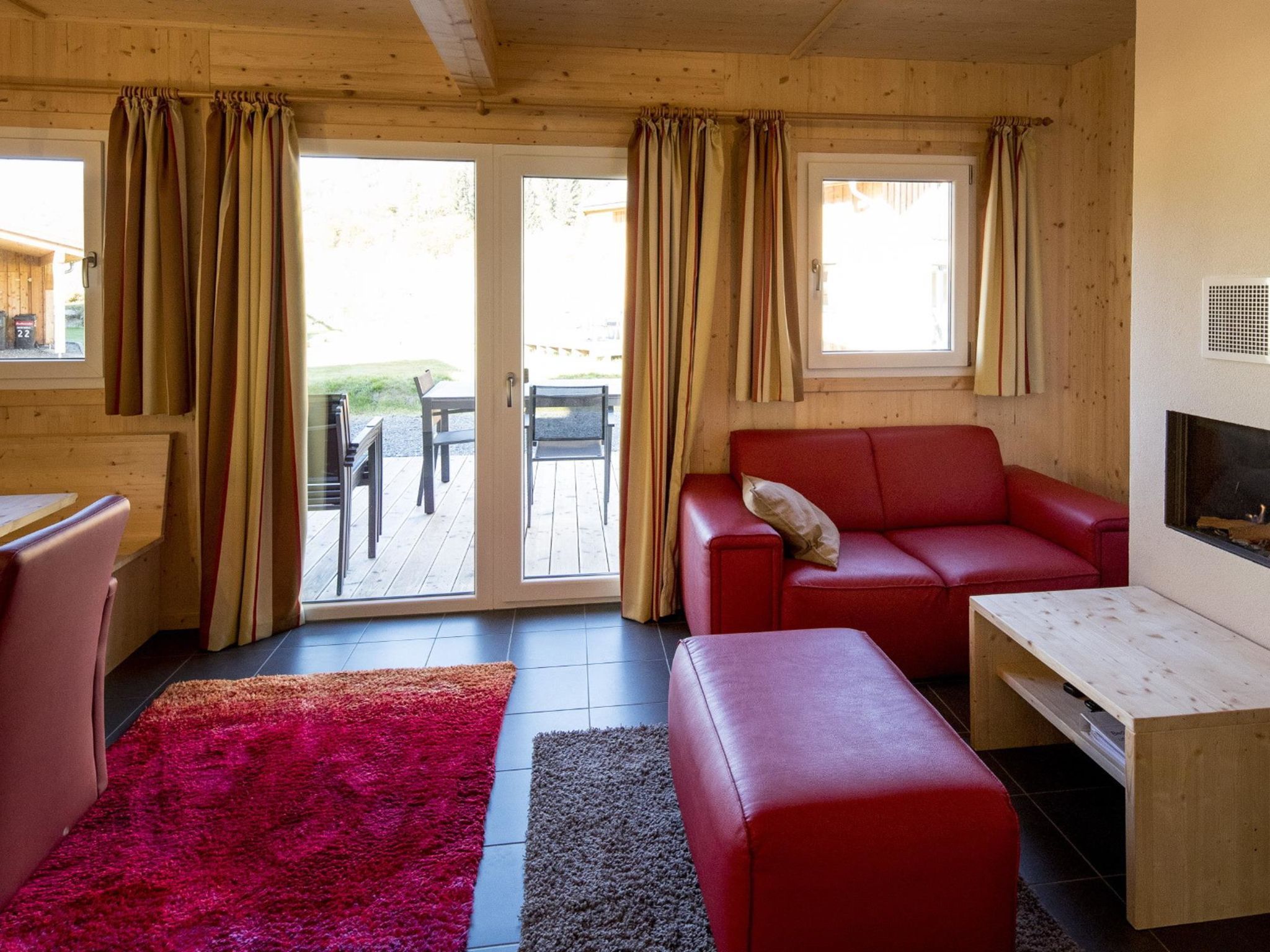 Typ 70, 4-Zimmer-Chalet 70 m2. Geräumig, geschmackvoll eingerichtet: Wohn-/Esszimmer mit Esstisch und Sat-TV (Flachbildschirm). Offene Küche (Backofen, Geschirrspüler, 4 Glaskeramikplatten, Mikrowelle, elektrische Kaffeemaschine). Sep. WC. Obergeschoss: 2 Doppelzimmer. 1 Zimmer mit 1 x 2 Etagenbetten. 2 Duschen/WC, Sauna. Terrasse. Terrassenmöbel. Schöne Sicht auf die Landschaft. Zur Verfügung: Internet (Wireless LAN, gratis). Bitte beachten: Nichtraucher-Unterkunft. Beim Mietobjekt handelt es sich um ein Typenhaus bzw. Um eine Typenwohnung. Die Sauna ist eine Infrarotkabine.