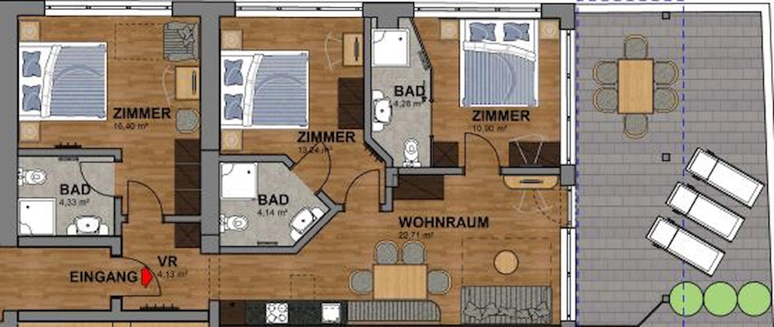 Top 1 mit ca. 80 m²: gut ausgestattete Wohnküche mit Backrohr, Microwelle, Geschirrspül- und Kaffeemaschine, großer Esstisch, Kabel TV, Wireless-Lan-Access, 3 Doppelzimmer mit Kleiderschrank,Spiegel und Kabel TV, 3 Badezimmer mit Dusche/WC und Terrasse.