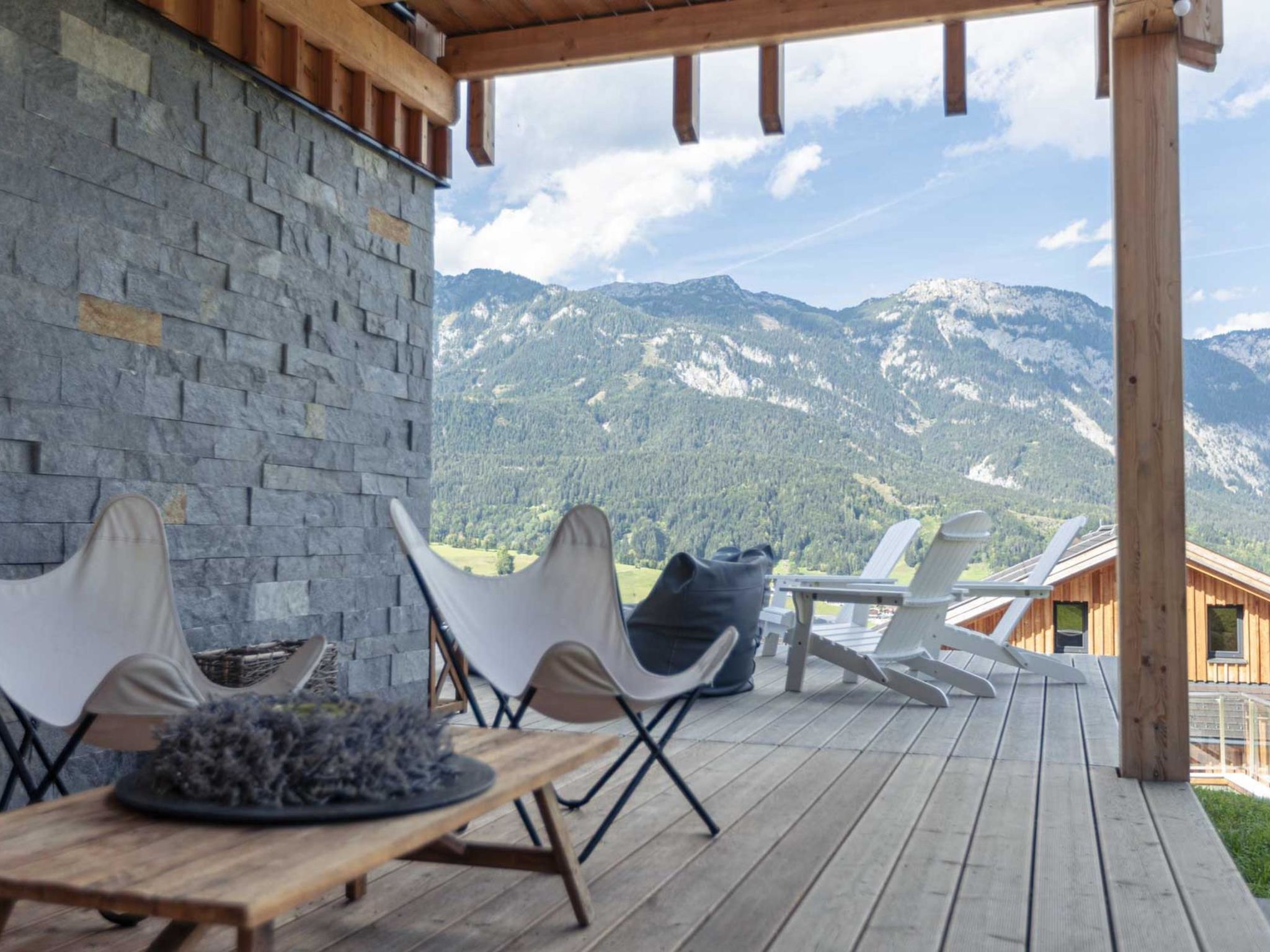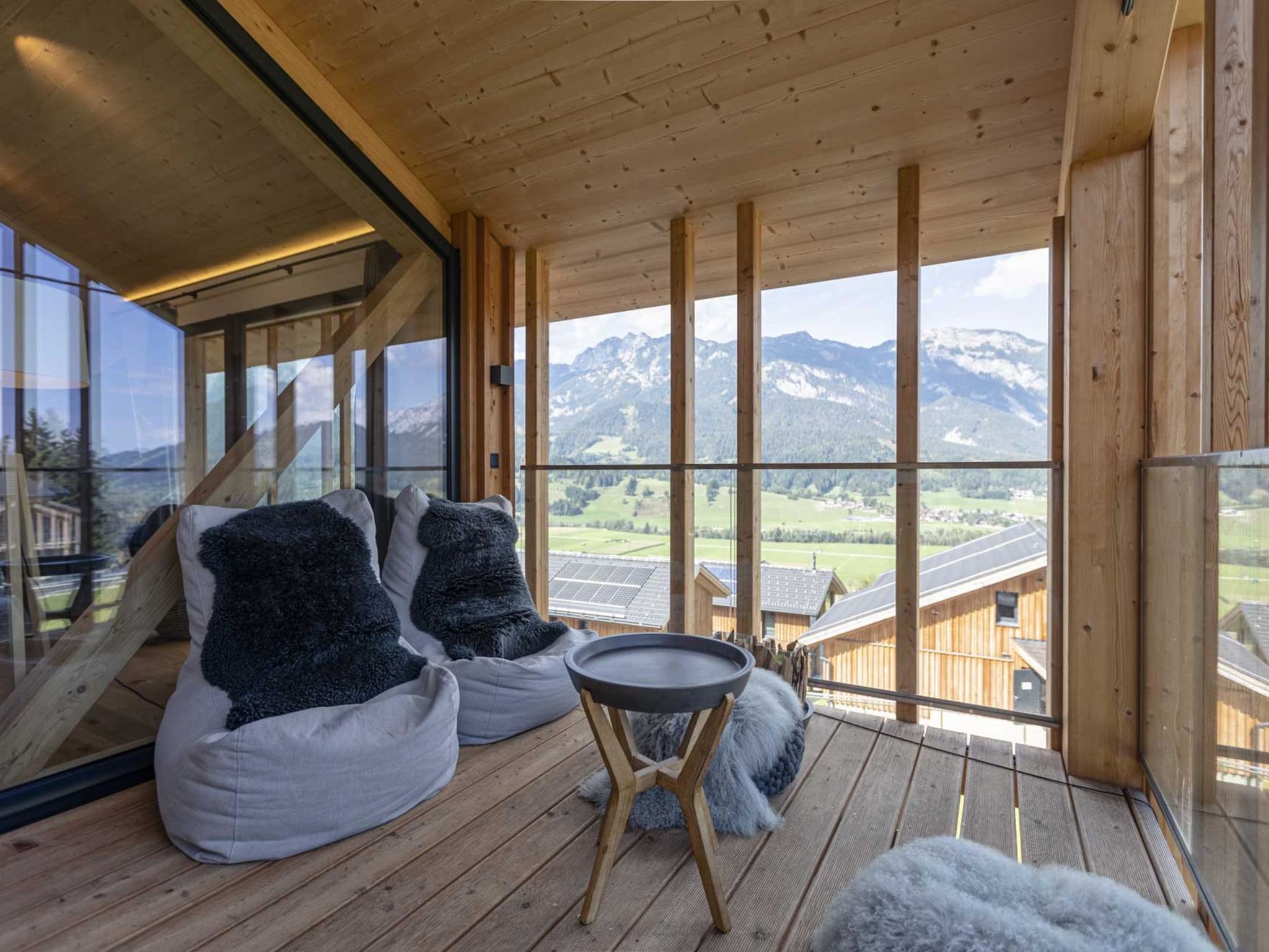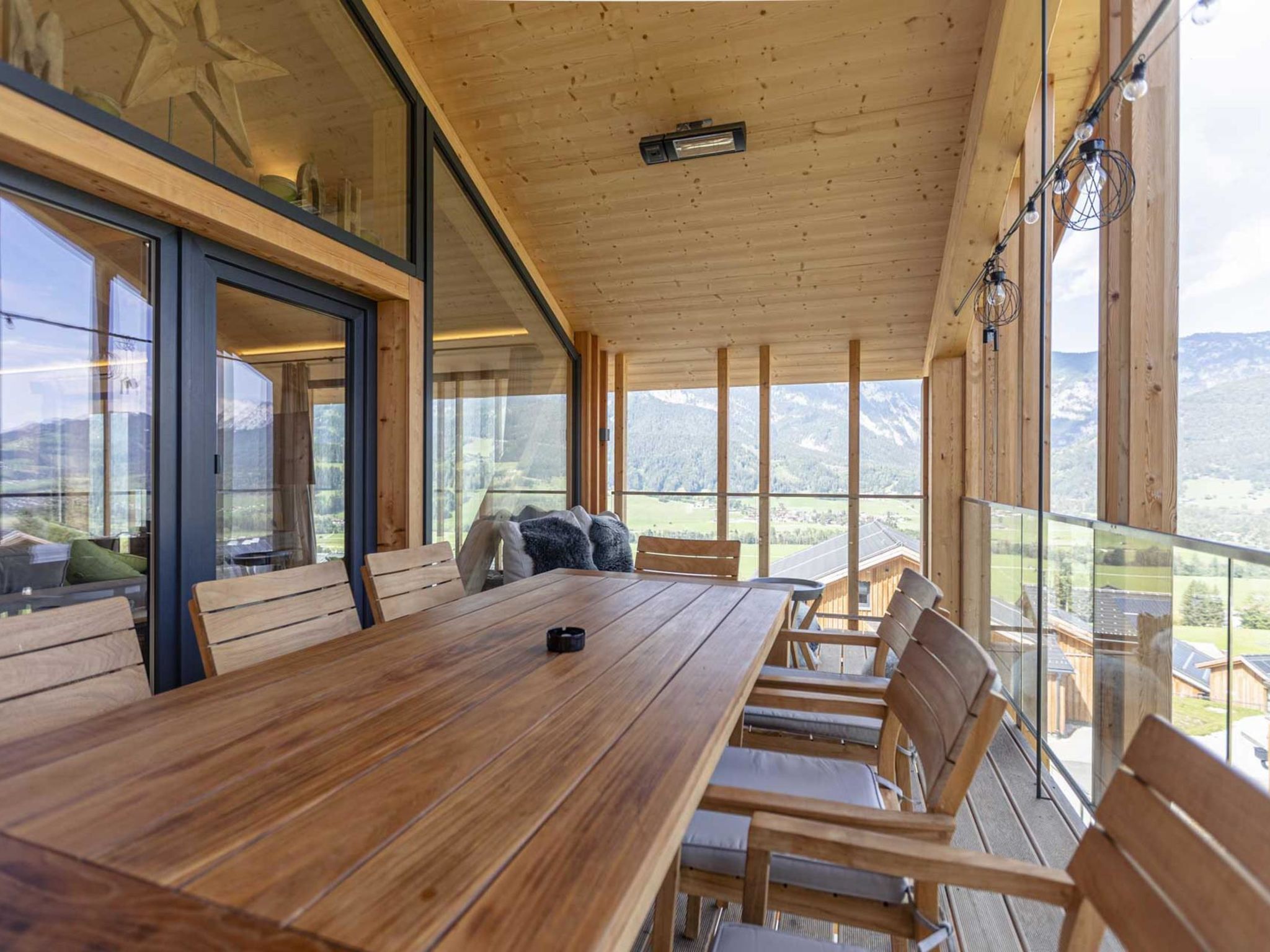 Premium mit 5 Schlafzimmern, Sauna &Pool, 6-Zimmer-Chalet 150 m2. Hell, komfortabel und luxuriös eingerichtet: Wohn-/Esszimmer mit Schwedenofen, Esstisch, Sat-TV, Flachbildschirm und G-Heizofen. 4 Doppelzimmer, jedes Zimmer mit Dusche/WC. 1 Doppelzimmer. Offene Küche (Backofen, Geschirrspüler, 4 Glaskeramikplatten, Toaster, Wasserkocher, Mikrowelle, elektrische Kaffeemaschine). Bad/WC, sep. WC, Hydromassage-Dusche, Sauna. Balkon. Balkonmöbel. Sehr schöne Panoramasicht auf die Berge. Zur Verfügung: Internet (Wireless LAN, gratis). E-Ladestation. Bitte beachten: Nichtraucher-Unterkunft. Beim Mietobjekt handelt es sich um ein Typenhaus bzw. Um eine Typenwohnung. Das Chalet Dachstein verfügt über einen eigenen beheizten Aussenpool.