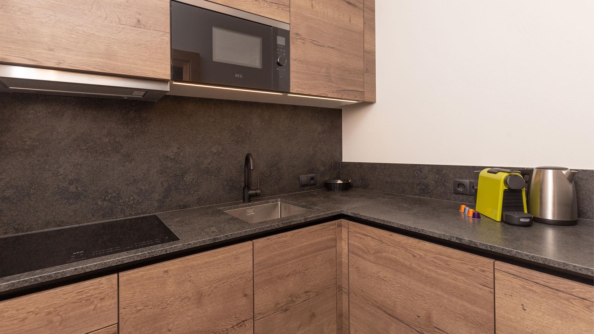 Ausstattung der Küche: Induktionskochfeld, Mikrowelle, Geschirrspüler, Kühlschrank mit Tiefkühlfach, Kaffeemaschine (Kapseln), Wasserkocher, usw.
