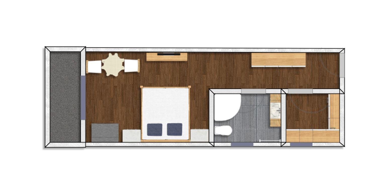 Komplett neu und modern ausgestattetes Appartement mit ca. 30 m². Es verfügt über ein Doppelzimmer mit Sofa und Essbereich. Eine voll ausgestattete abgetrennte Küche, Vorraum und ein Badezimmer mit Dusche und teilweise separatem WC.