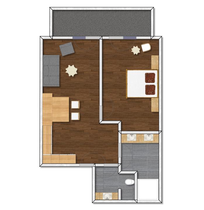 Komplett neu und modern ausgestattetes Appartement mit ca. 50 m². Es verfügt über ein Doppelzimmer und ein Badezimmer mit Dusche und größtenteils separatem WC. Wohnzimmer mit ausziehbarem Sofa und optisch abgetrennte Küche.