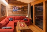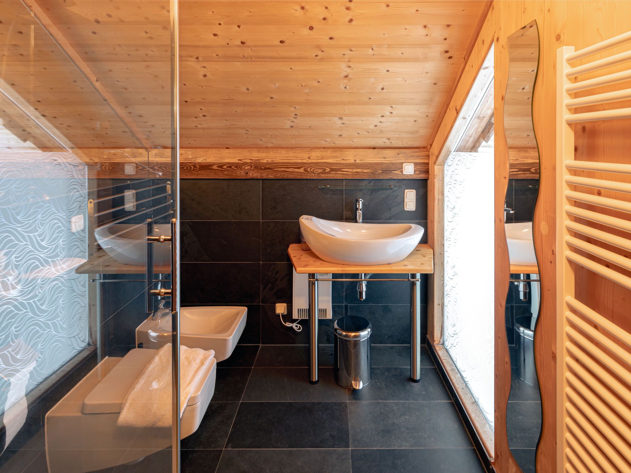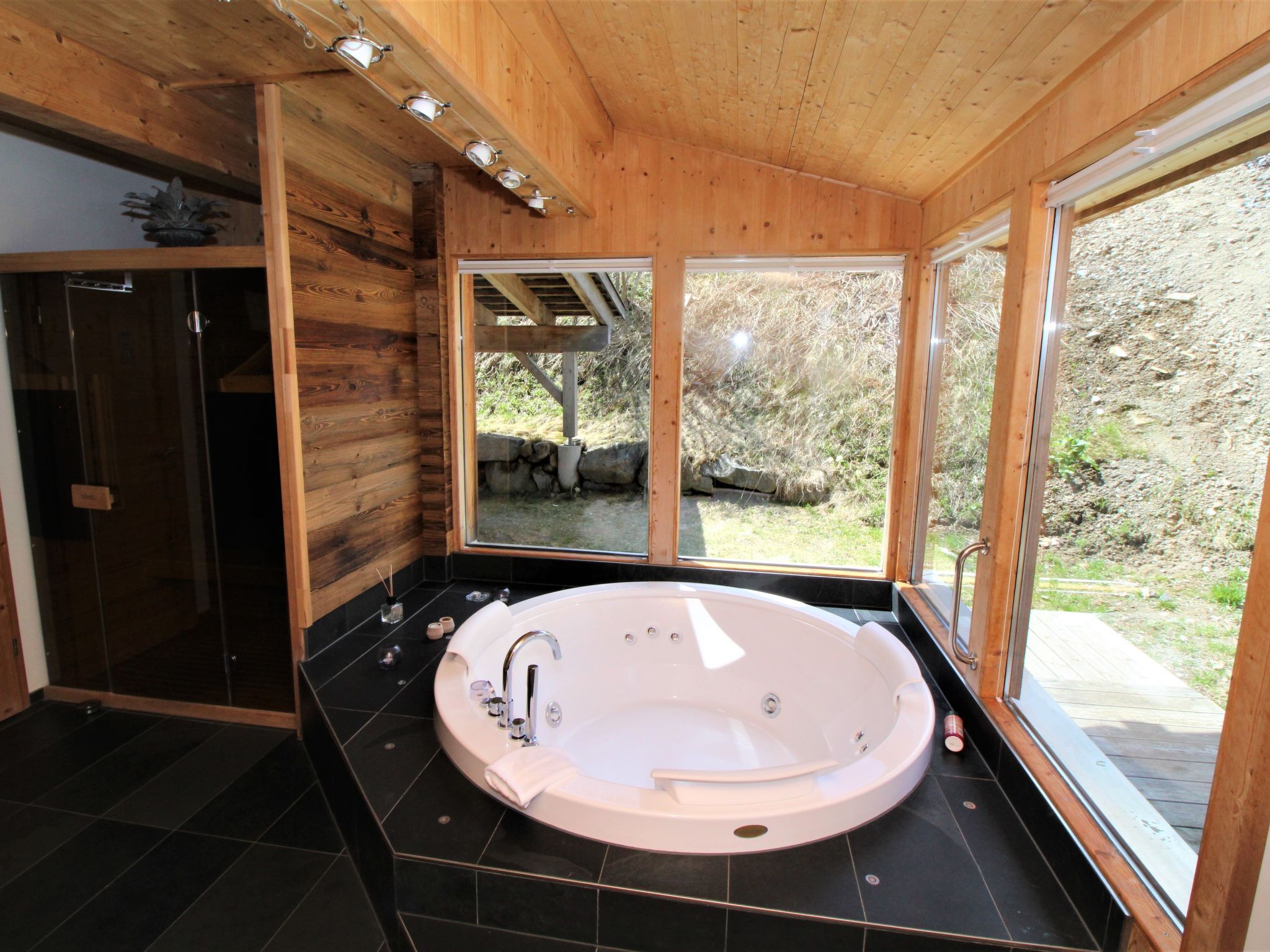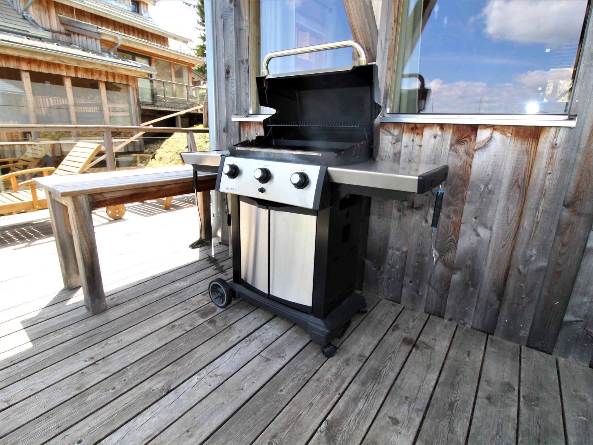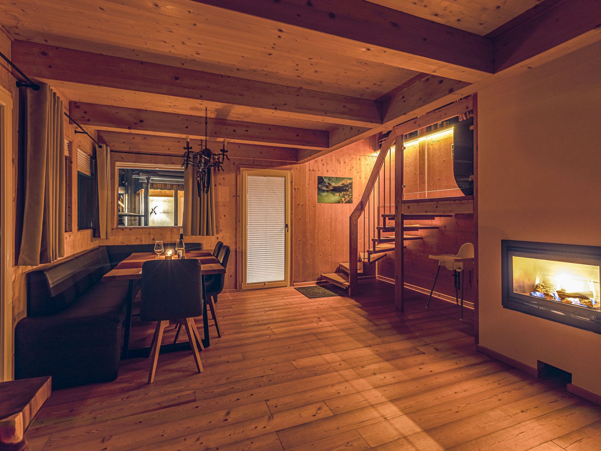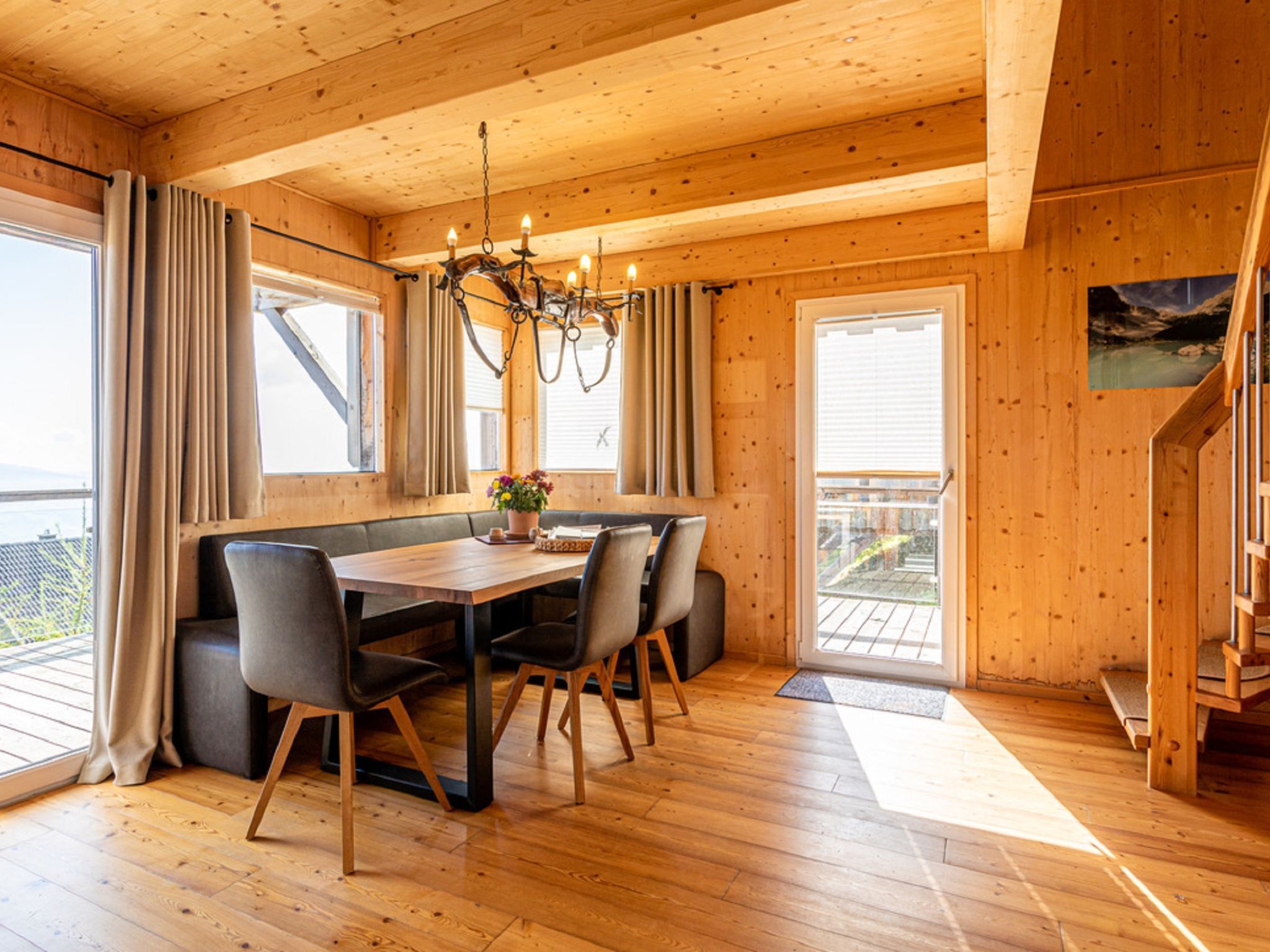 4-Zimmer-Chalet 130 m2. Geräumig, teilweise abgeschrägt, luxuriös und geschmackvoll eingerichtet: offene Küche (Backofen, Geschirrspüler, 4 Induktionskochplatten, Wasserkocher, Tiefkühler, elektrische Kaffeemaschine) mit kleiner Bar. Bad/Dusche, sep. WC, Whirlbadewanne, Sauna. Unteres Geschoss: offenes grosses Wohn-/Esszimmer mit Panoramafenster mit Esstisch, Sat-TV, Digital-TV und G-Heizofen. Ausgang zur Terrasse. Obergeschoss: 1 Doppelzimmer mit Dusche/Bidet/WC. Ausgang zum Balkon. Dachgeschoss: 2 Doppelzimmer. Bad/Bidet/WC, Doppelwaschbecken mit Eckbadewanne. E-Heizung, G-Heizung. Kleiner Balkon, grosse Terrasse. Terrassenmöbel, Gartengrill, Liegestühle. Herrliche Panoramasicht auf das Tal und die Landschaft. Zur Verfügung: Bügeleisen, Haartrockner. Internet (Wireless LAN, gratis). Bitte beachten: Nichtraucher-Haus. Feuerlöscher. Separater Gasgrill im Außenbereich. Aufgrund der geografischen Lage kann ein Internetzugang nicht garantiert werden.