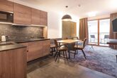 Ausstattung der Küche: Induktionskochfeld, Mikrowelle, Geschirrspüler, Kühlschrank mit Tiefkühlfach, Kaffeemaschine (Kapseln), Wasserkocher, usw. Nur auf Anfrage ein barrierefreies Appartement möglich.