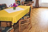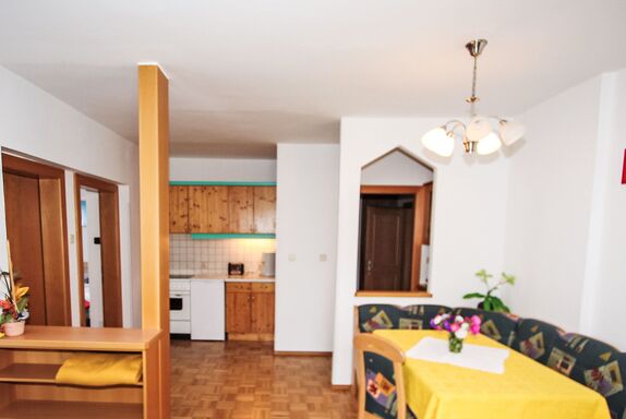 3-Zimmer-Wohnung 60 m2 im 1. Stock. Hell, komfortabel und gemütlich eingerichtet: Eingang. Wohn-/Esszimmer mit Essecke und Sat-TV (Flachbildschirm). Ausgang zum Balkon. 1 Doppelzimmer. Ausgang zum Balkon. 1 Zimmer mit 1 Bett (90 cm, Länge 190 cm), 1 Doppelbett. Kleine, offene Küche (Backofen, Geschirrspüler, 4 Glaskeramikplatten). Dusche, sep. WC. Grosser Balkon, Südlage. Balkonmöbel. Schöne Sicht auf die Berge. Zur Verfügung: Internet (Wireless LAN, gratis). Bitte beachten: Nichtraucher-Unterkunft. Maximal 1 Haustier/Hund erlaubt. Rauchmelder, Feuerlöscher.