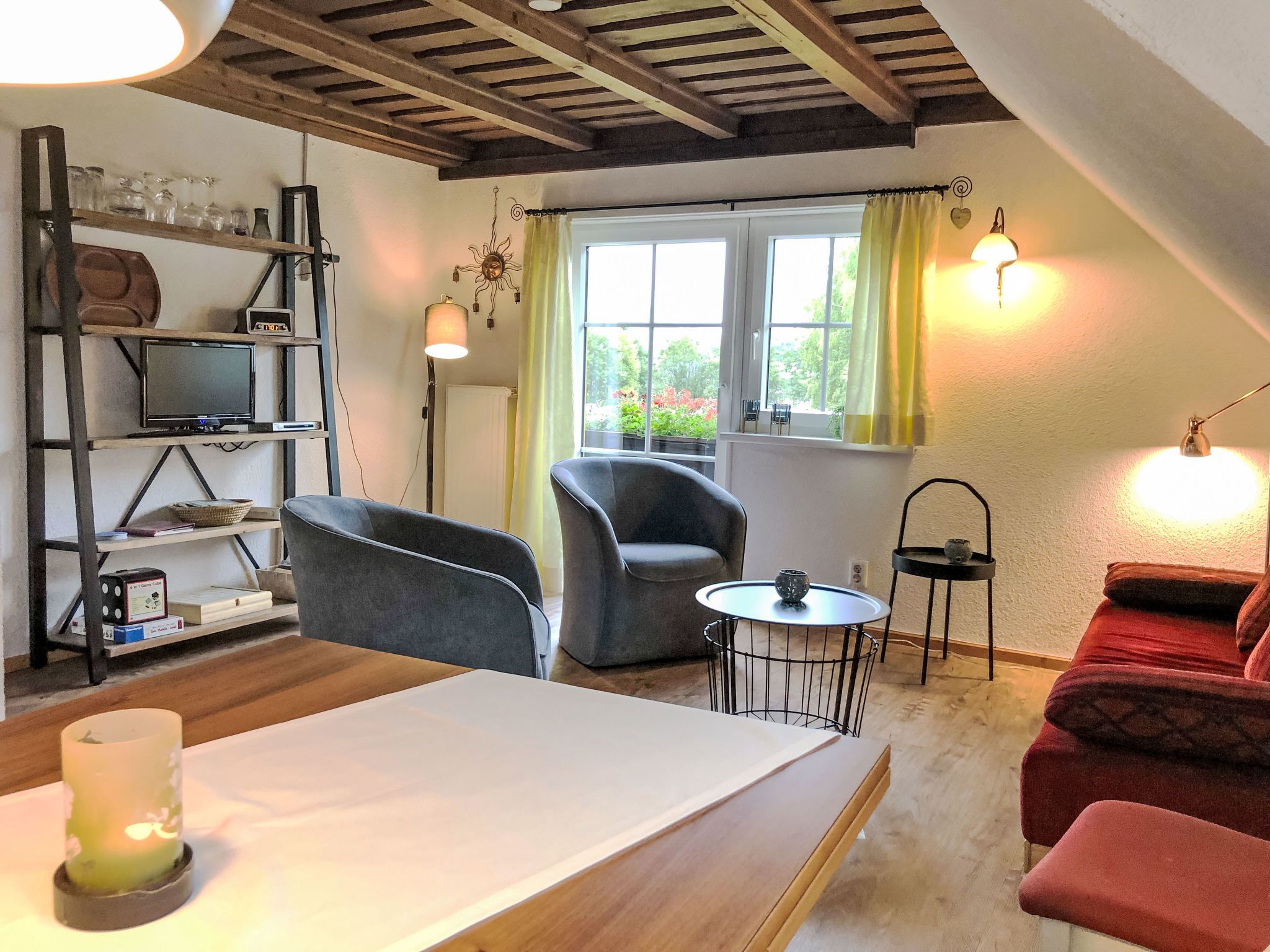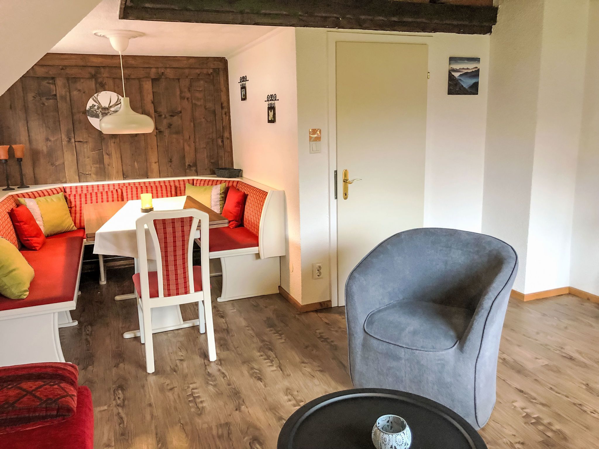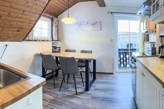 Ferienwohnung Gurkhof 2 - Gurk, 3-Zimmer-Wohnung 70 m2 im 1. Stock. Teilweise abgeschrägt, gemütlich eingerichtet: Wohn-/Schlafzimmer mit 1 Doppeldiwanbett, Essecke und Sat-TV. Ausgang zum Balkon. 1 Doppelzimmer mit 1 Doppelbett. 1 kleines Zimmer mit 2 Betten. Küche (Backofen, Geschirrspüler, 4 Glaskeramikplatten, Toaster, Wasserkocher, Mikrowelle, elektrische Kaffeemaschine) mit Esstisch. Ausgang zum Balkon. Dusche/WC. Heizung. Parkettboden. Schöne Sicht auf die Landschaft. Zur Verfügung: Internet (WLAN, gratis). Bitte beachten: Nichtraucher-Unterkunft. Maximal 1 Haustier/Hund erlaubt. Rauchmelder.