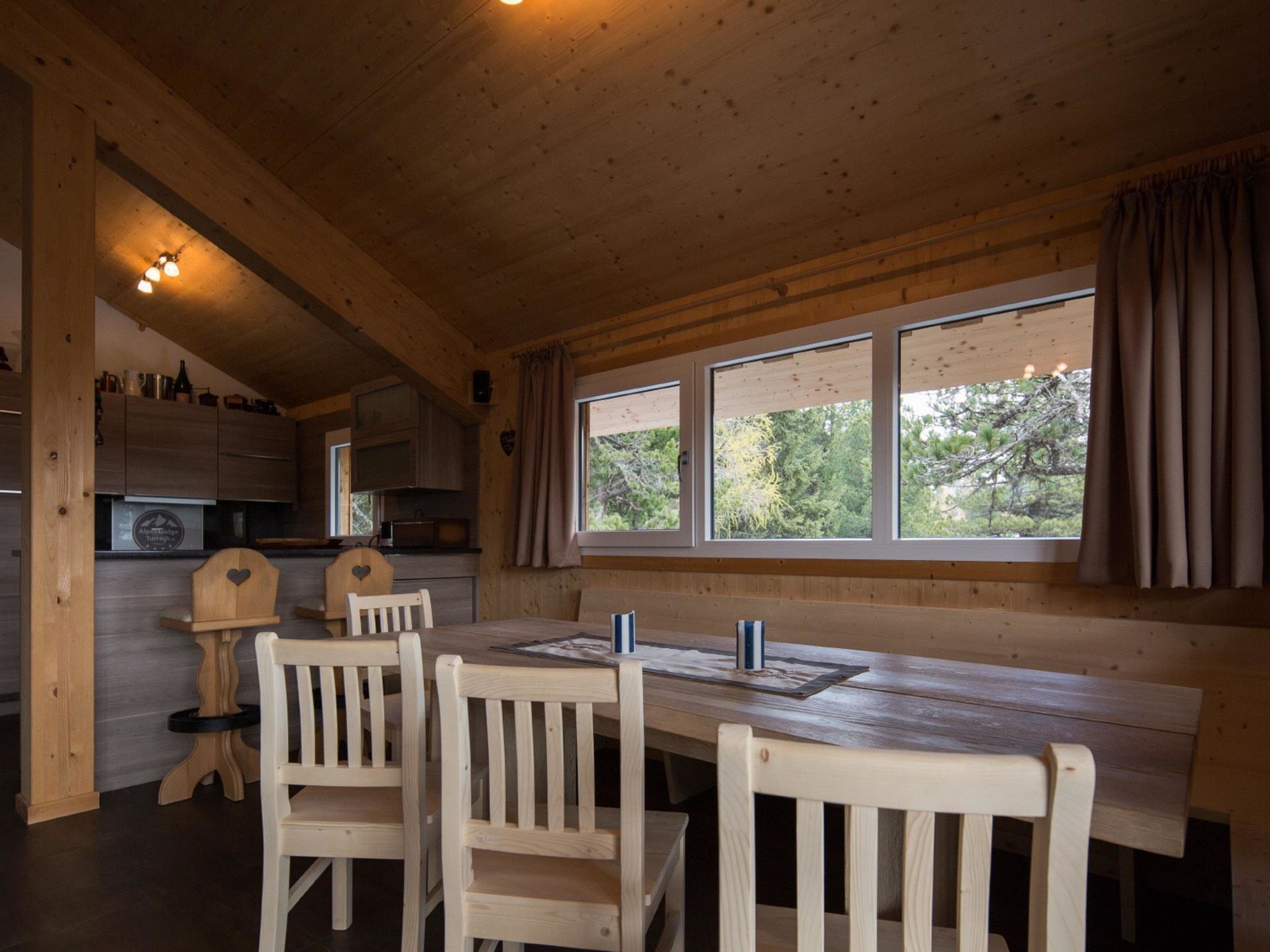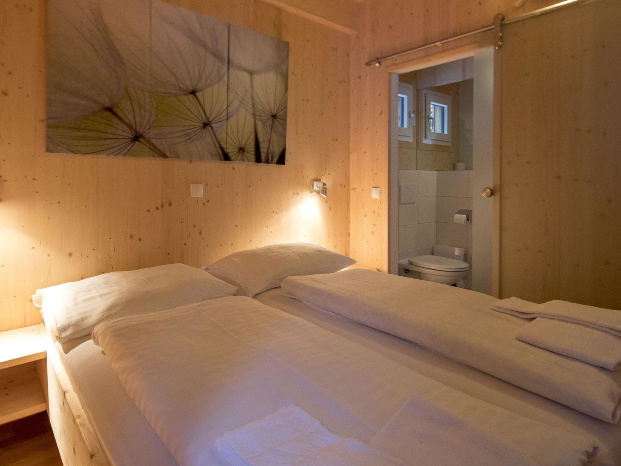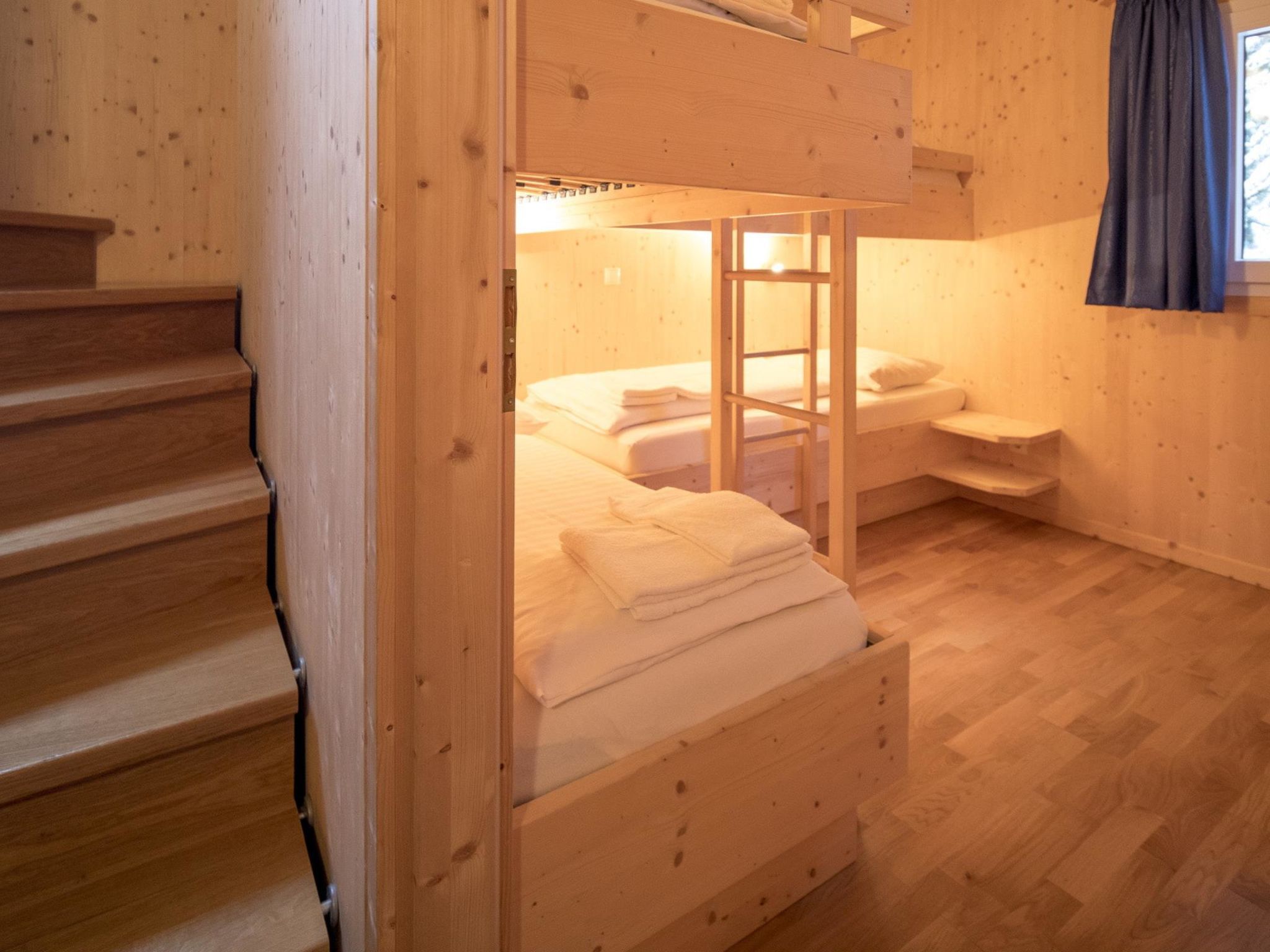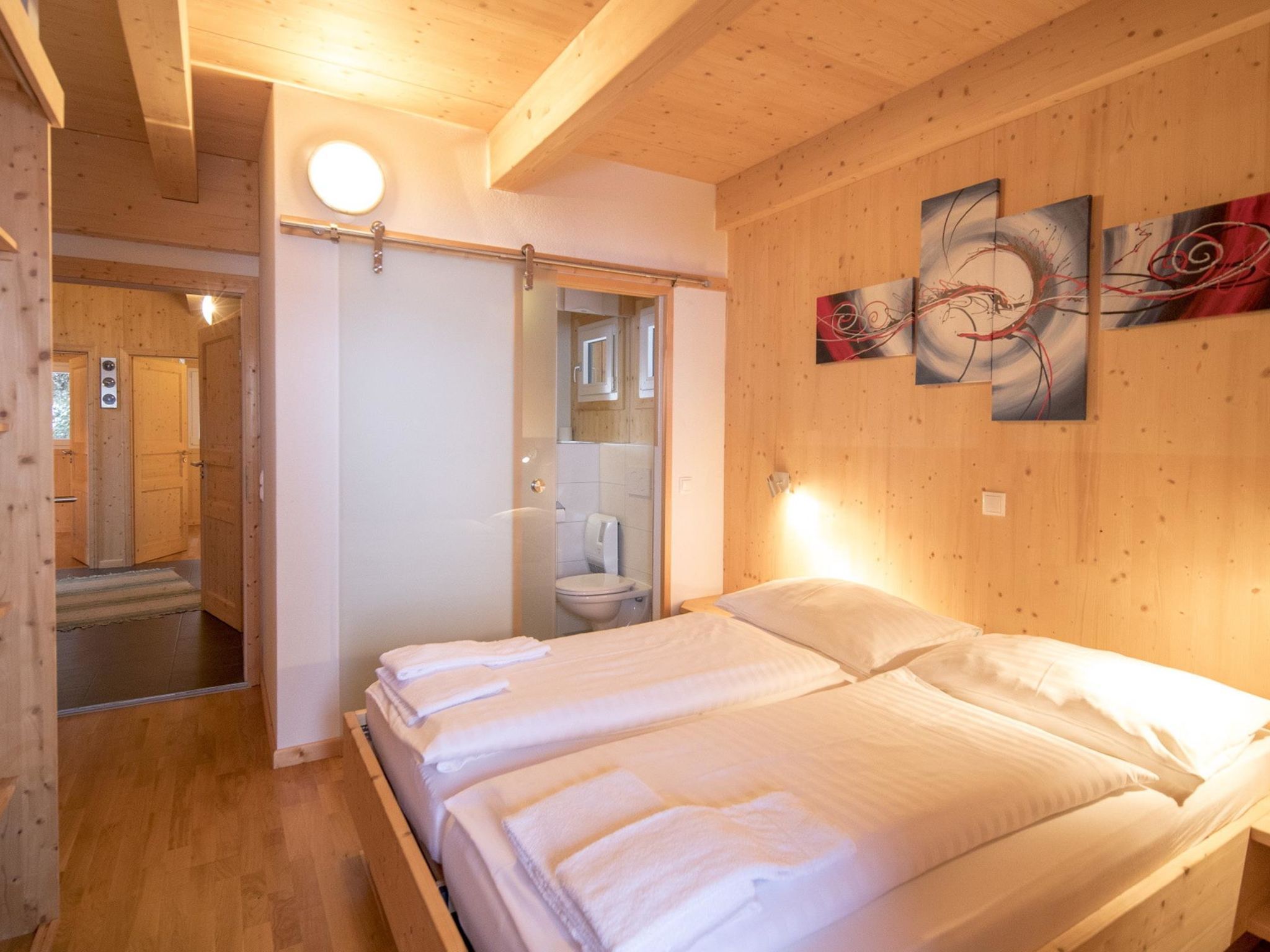 29 mit IR-Sauna und Sprudelbad Innen, 7-Zimmer-Chalet 130 m2. Geräumig, luxuriös und mit viel Holz eingerichtet: 3 Doppelzimmer, jedes Zimmer mit Dusche/WC. 2 Kinderzimmer, jedes Zimmer mit 2 x 2 Etagenbetten. Unteres Geschoss: 1 Doppelzimmer. Obergeschoss: grosses Wohnzimmer mit Essecke und Sat-TV (Flachbildschirm), G-Heizofen. Offene Küche (Backofen, Geschirrspüler, 4 Glaskeramikplatten, Tiefkühler, elektrische Kaffeemaschine). Dusche/WC, Whirlbadewanne, Sauna. Balkon oder Terrasse. Balkonmöbel. Schöne Sicht auf die Berge und die Landschaft. Zur Verfügung: Internet (Wireless LAN, gratis). Parkplatz (2 Autos) beim Haus. Bitte beachten: Nichtraucher-Unterkunft. Rauchmelder. Beim Mietobjekt handelt es sich um ein Typenhaus bzw. Um eine Typenwohnung. Die Sauna im Wellnessbad ist eine Infrarot Sauna.