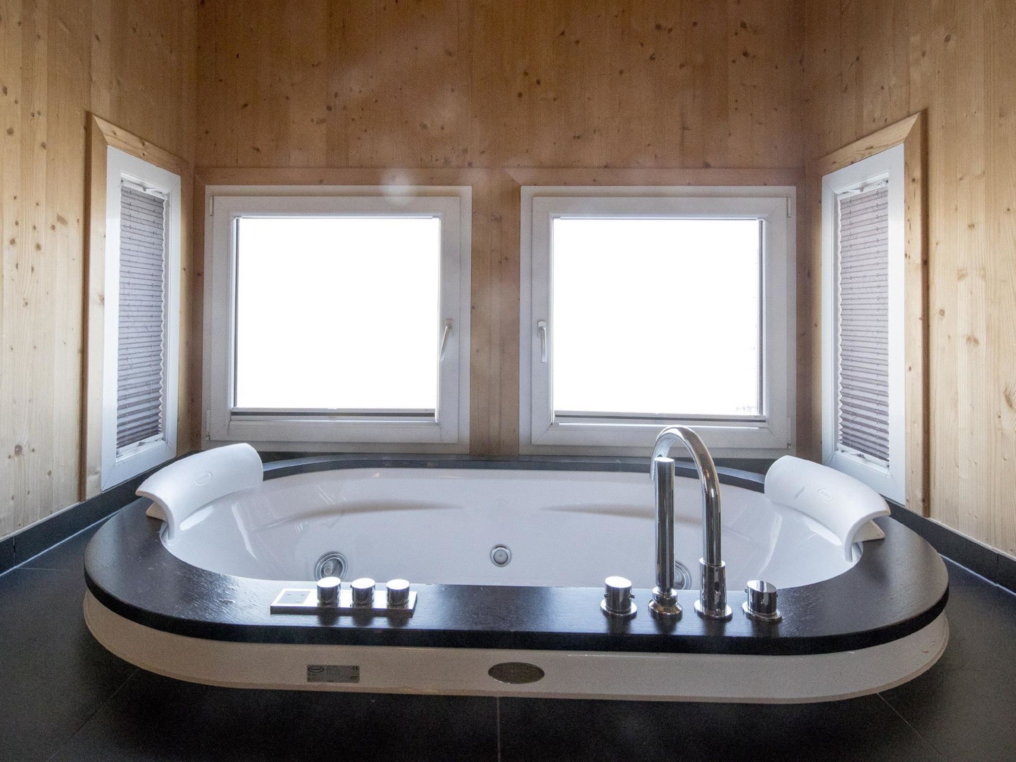 2 mit IR-Sauna & Sprudelwanne innen, 5-Zimmer-Chalet 120 m2. Luxuriös und geschmackvoll eingerichtet: offenes Wohn-/Esszimmer mit Essecke, Sat-TV und Flachbildschirm. Offene Küche (Backofen, Geschirrspüler, 4 Glaskeramikplatten, Mikrowelle, Tiefkühler, elektrische Kaffeemaschine). 2 Duschen/WC. Obergeschoss: 3 Doppelzimmer. 1 Zimmer mit 2 x 2 Etagenbetten. Bad/Dusche/WC, Whirlbadewanne, Sauna. Holzdielenboden. Balkon oder Terrasse. Sicht auf die Berge und die Landschaft. Zur Verfügung: Internet (Wireless LAN, gratis). Parkplatz beim Haus. Bitte beachten: Nichtraucher-Unterkunft. Beim Mietobjekt handelt es sich um ein Typenhaus bzw. Um eine Typenwohnung. Die Sauna ist eine Infrarot Sauna. Die Zimmereinteilung/Anzahl der Bäder kann variieren. Je Nachverfügbarkeit hat dieses Chalet ein Aussensprudelbad (extra). Bei Belegung mit weniger Personen als der maximalen Personenzahl stehen nicht alle Wohneinheiten zur Verfügung.