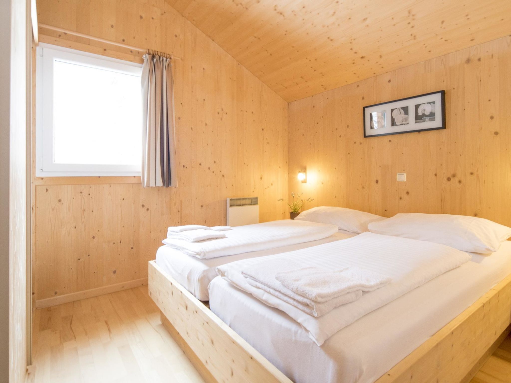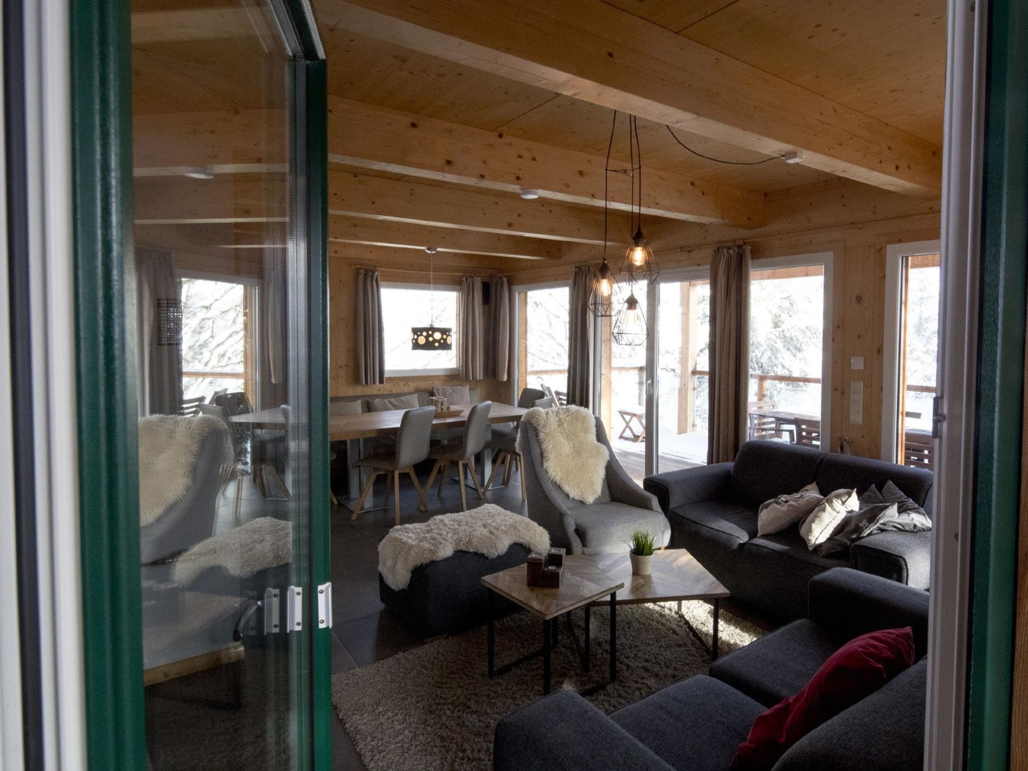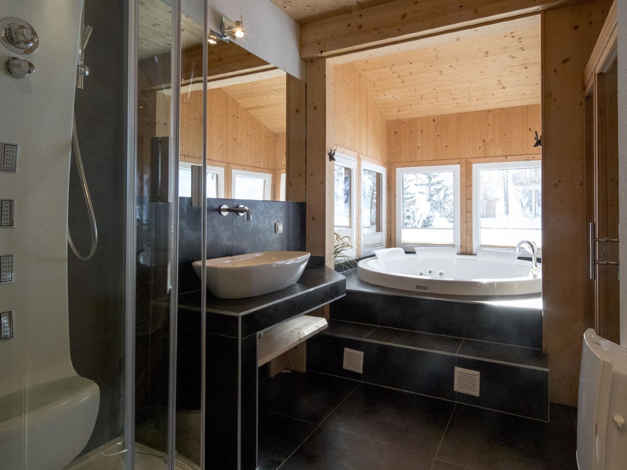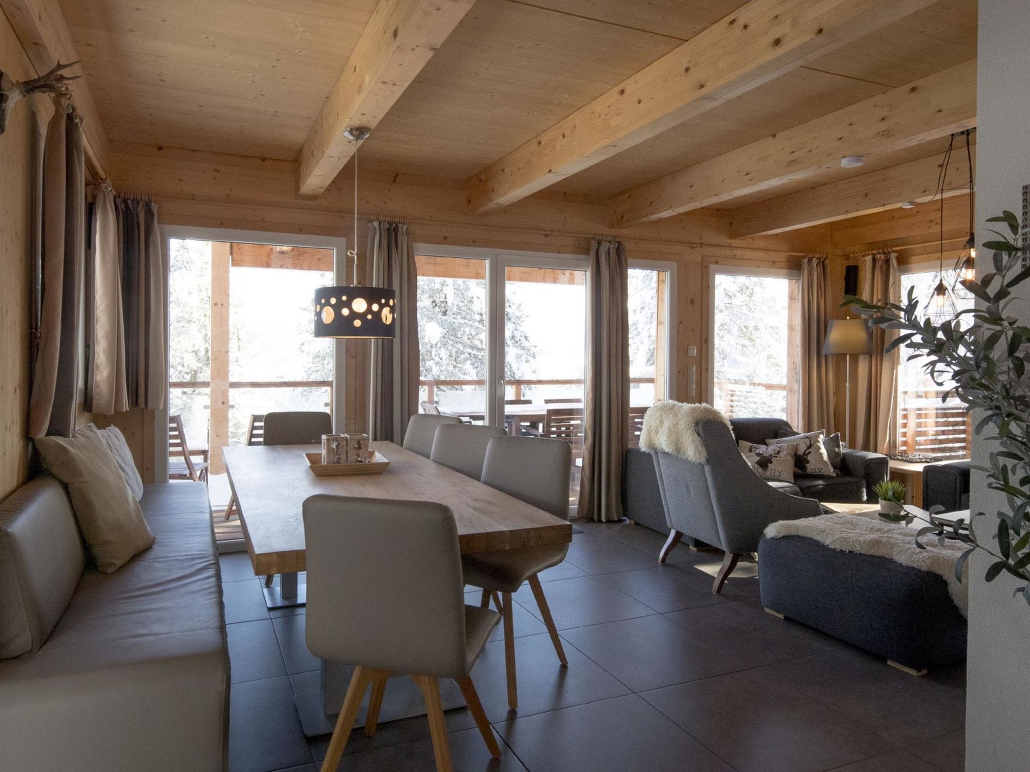 11 mit IR-Sauna & Sprudelwanne Innen, 5-Zimmer-Chalet 120 m2 auf 2 Stockwerken. Luxuriös und geschmackvoll eingerichtet: Wohn-/Esszimmer mit Essecke und Sat-TV (Flachbildschirm). Offene Küche (Backofen, Geschirrspüler, 4 Glaskeramikplatten, Toaster, Wasserkocher, Mikrowelle, elektrische Kaffeemaschine). Dusche/WC. Obergeschoss: 3 Doppelzimmer. 1 Zimmer mit 2 x 2 Etagenbetten. Bad/WC, Dusche/WC, Whirlbadewanne, Sauna. Balkon. Balkonmöbel. Schöne Sicht auf die Berge. Zur Verfügung: Internet (Wireless LAN, gratis). Bitte beachten: Nichtraucher-Unterkunft. Die Sauna ist eine Infrarotkabine.