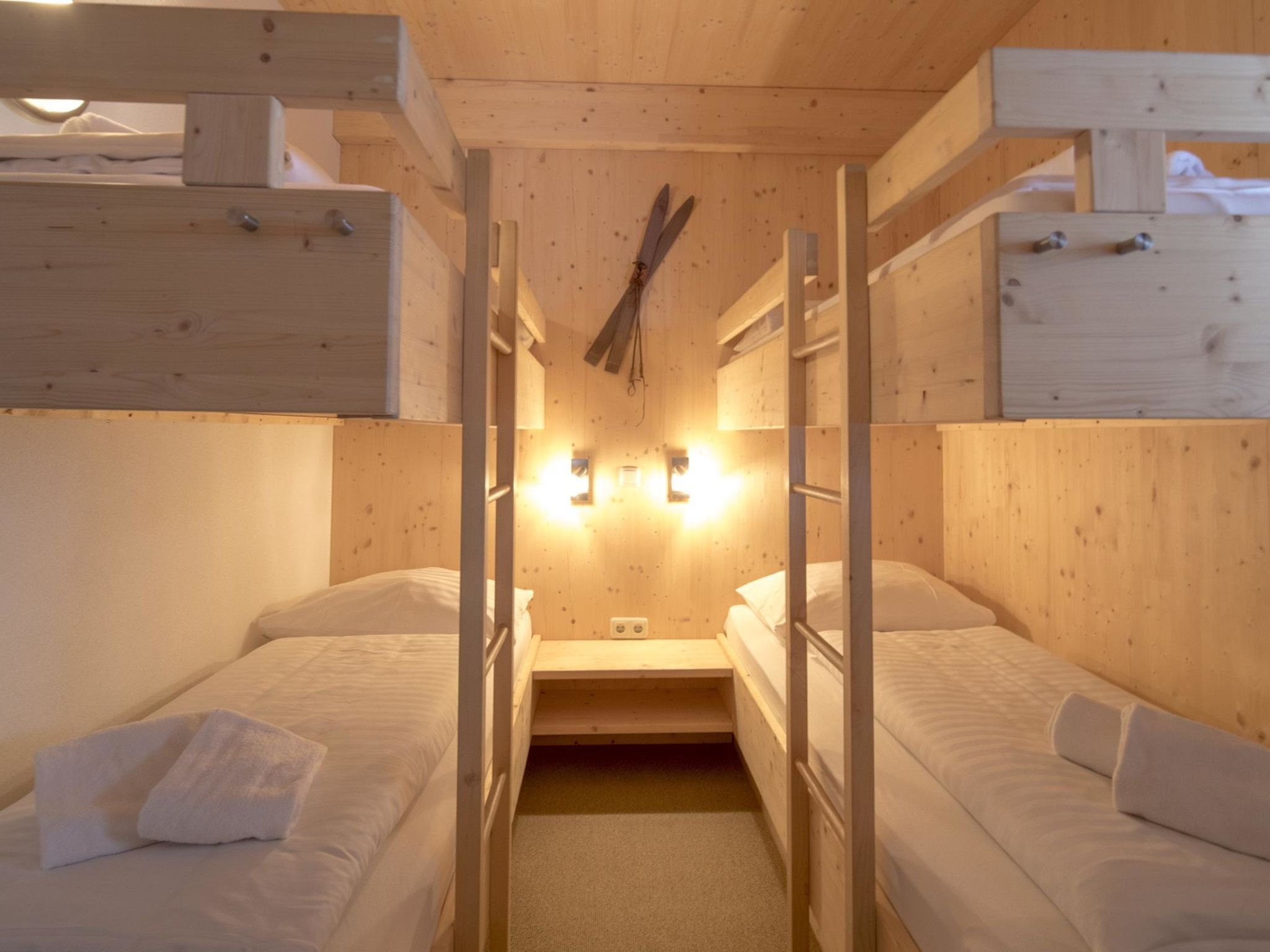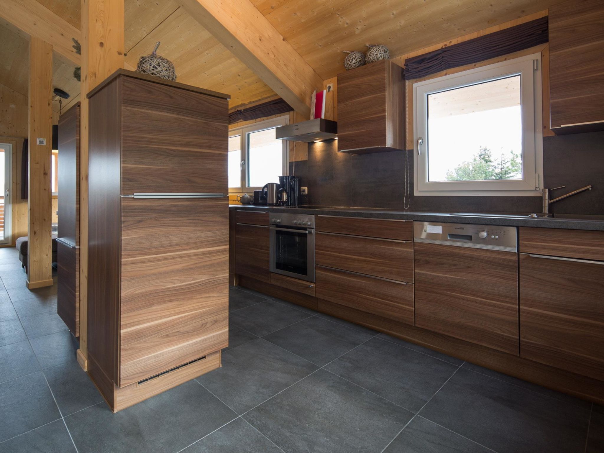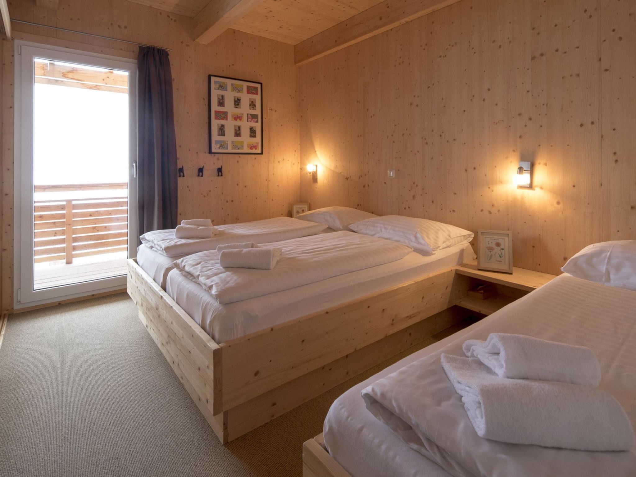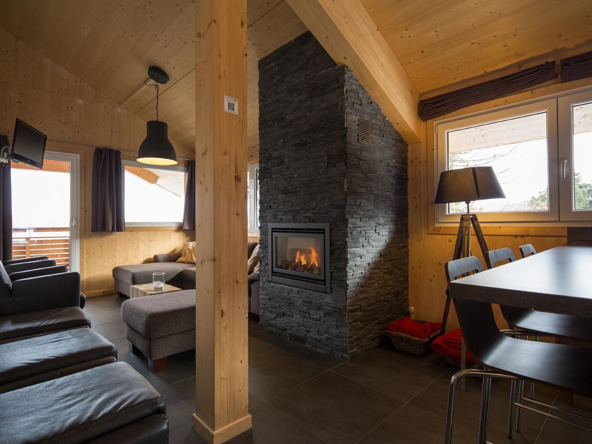 5 mit IR-Sauna&Sprudelbad innen, 5-Zimmer-Chalet 120 m2 auf 2 Stockwerken. Luxuriös und geschmackvoll eingerichtet: Wohn-/Esszimmer mit Essecke und Sat-TV (Flachbildschirm). Offene Küche (Backofen, Geschirrspüler, 4 Glaskeramikplatten, Toaster, Wasserkocher, Mikrowelle, elektrische Kaffeemaschine). Dusche/WC. Obergeschoss: 2 Doppelzimmer. 1 Zimmer mit 1 Bett und 1 Doppelbett. 1 Zimmer mit 2 x 2 Etagenbetten. Bad/WC, Dusche/WC, Whirlbadewanne, Sauna. Balkon. Balkonmöbel. Schöne Sicht auf die Berge. Zur Verfügung: Internet (Wireless LAN, gratis). Bitte beachten: Nichtraucher-Unterkunft. Die Sauna ist eine Infrarotkabine!