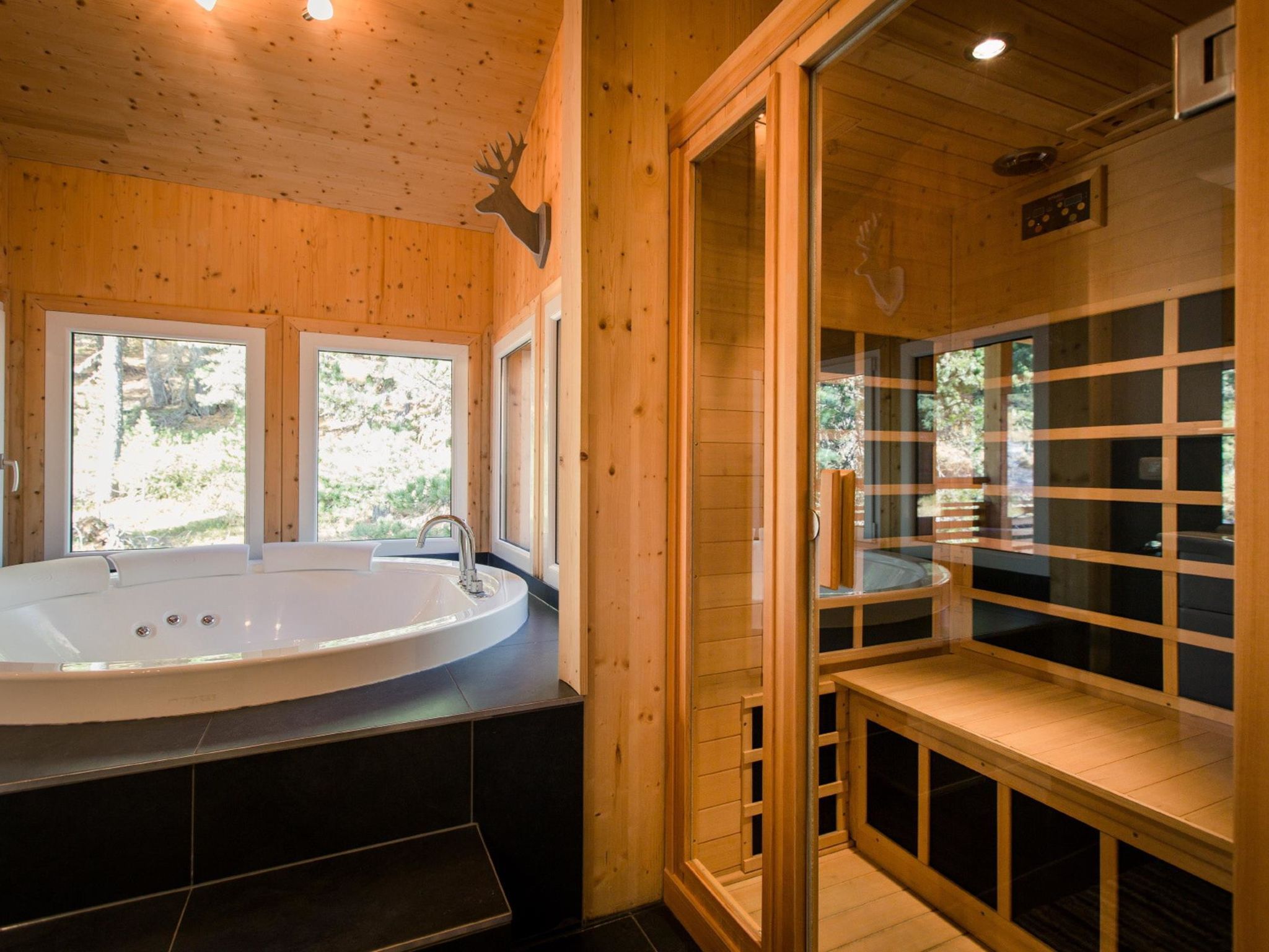 39 mit IR-Sauna und Sprudelbad Innen, 5-Zimmer-Chalet 120 m2 auf 2 Stockwerken. Luxuriös und geschmackvoll eingerichtet: Wohn-/Esszimmer mit Essecke und Sat-TV (Flachbildschirm). Offene Küche (Backofen, Geschirrspüler, 4 Glaskeramikplatten, Toaster, Wasserkocher, Mikrowelle, elektrische Kaffeemaschine). Dusche/WC. Obergeschoss: 1 Doppelzimmer. 1 Zimmer mit 1 Bett und 1 Doppelbett. 1 Zimmer mit 2 Betten. 1 Zimmer mit 2 x 2 Etagenbetten. Bad/WC, Dusche/WC, Whirlbadewanne, Sauna. Balkon. Balkonmöbel. Schöne Sicht auf die Berge. Zur Verfügung: Internet (Wireless LAN, gratis). Bitte beachten: Nichtraucher-Unterkunft. Die Sauna ist eine Infrarotkabine.