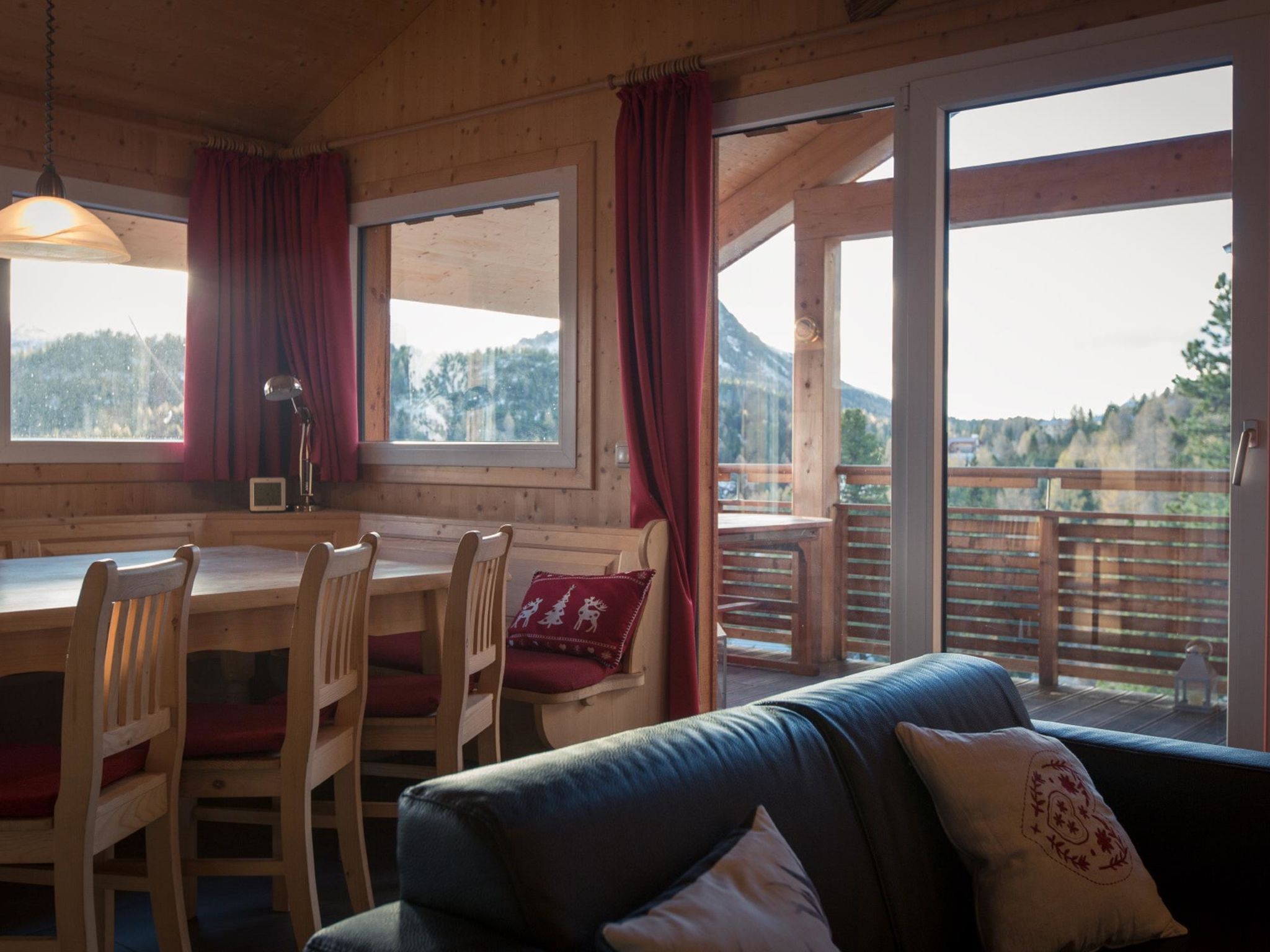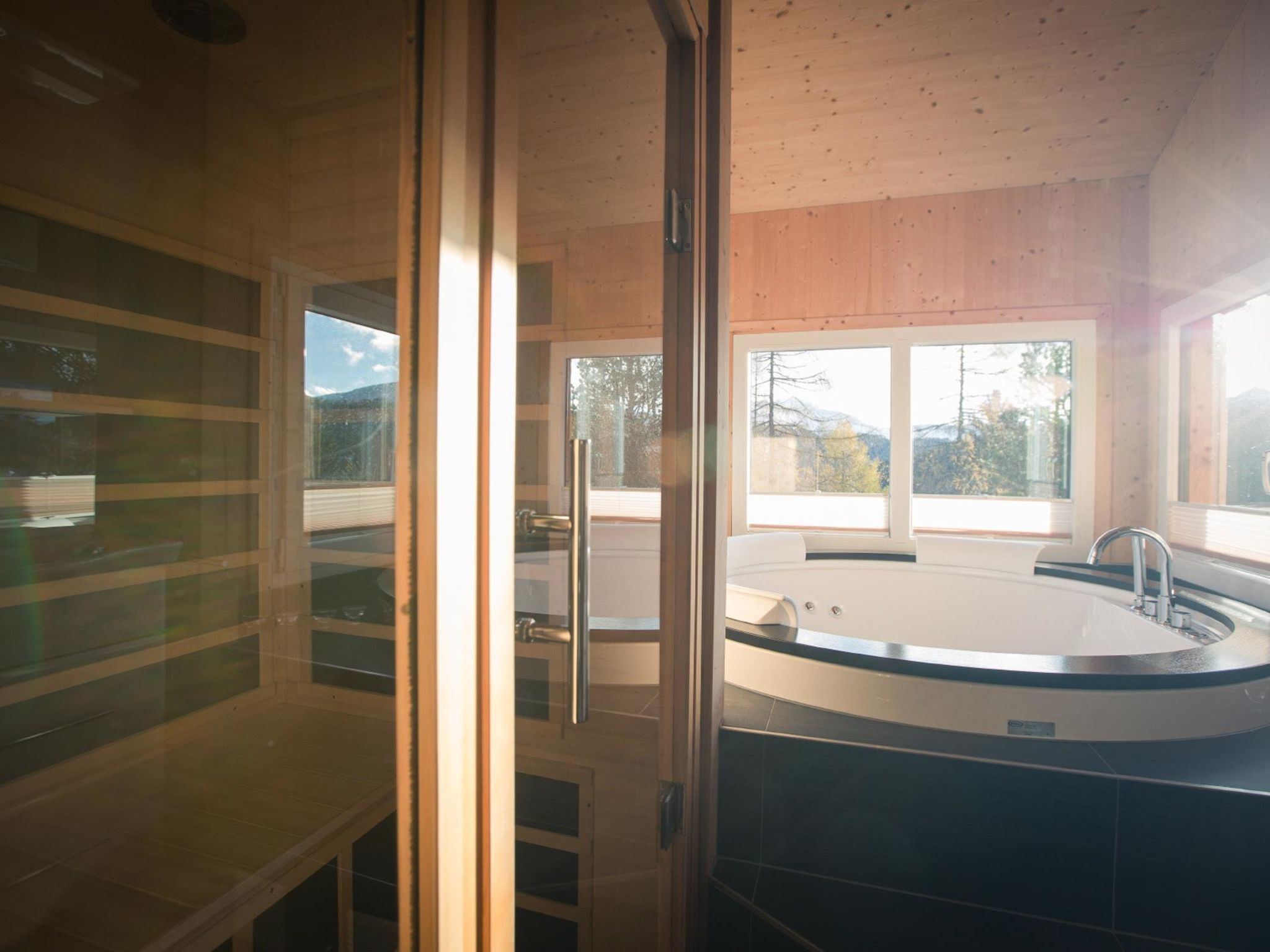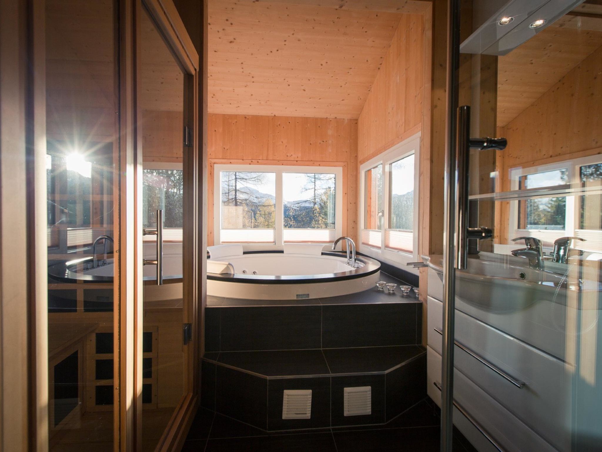 40 mit IR-Sauna & Sprudelwanne Innen, 5-Zimmer-Chalet 120 m2 auf 2 Stockwerken. Luxuriös und geschmackvoll eingerichtet: Wohn-/Esszimmer mit Essecke und Sat-TV (Flachbildschirm). Offene Küche (Backofen, Geschirrspüler, 4 Glaskeramikplatten, Toaster, Wasserkocher, Mikrowelle, elektrische Kaffeemaschine). Dusche/WC. Obergeschoss: 2 Doppelzimmer. 1 Zimmer mit 1 Bett und 1 x 1 Etagenbetten. 1 Zimmer mit 2 Betten (90 cm). Bad/WC, Dusche/WC, Whirlbadewanne, Sauna. Balkon. Balkonmöbel. Schöne Sicht auf die Berge. Zur Verfügung: Internet (Wireless LAN, gratis). Bitte beachten: Nichtraucher-Unterkunft. Die Sauna ist eine Infrarotkabine.