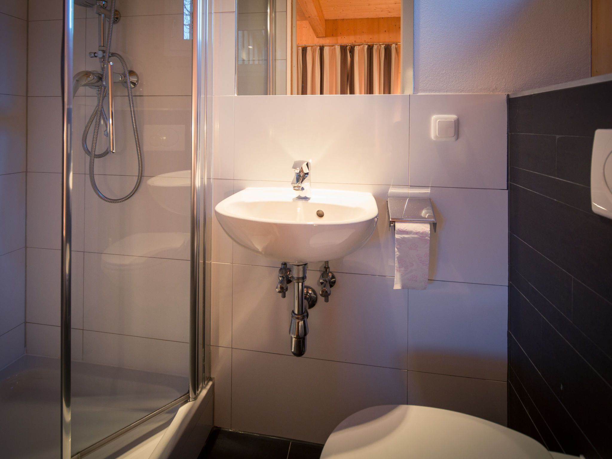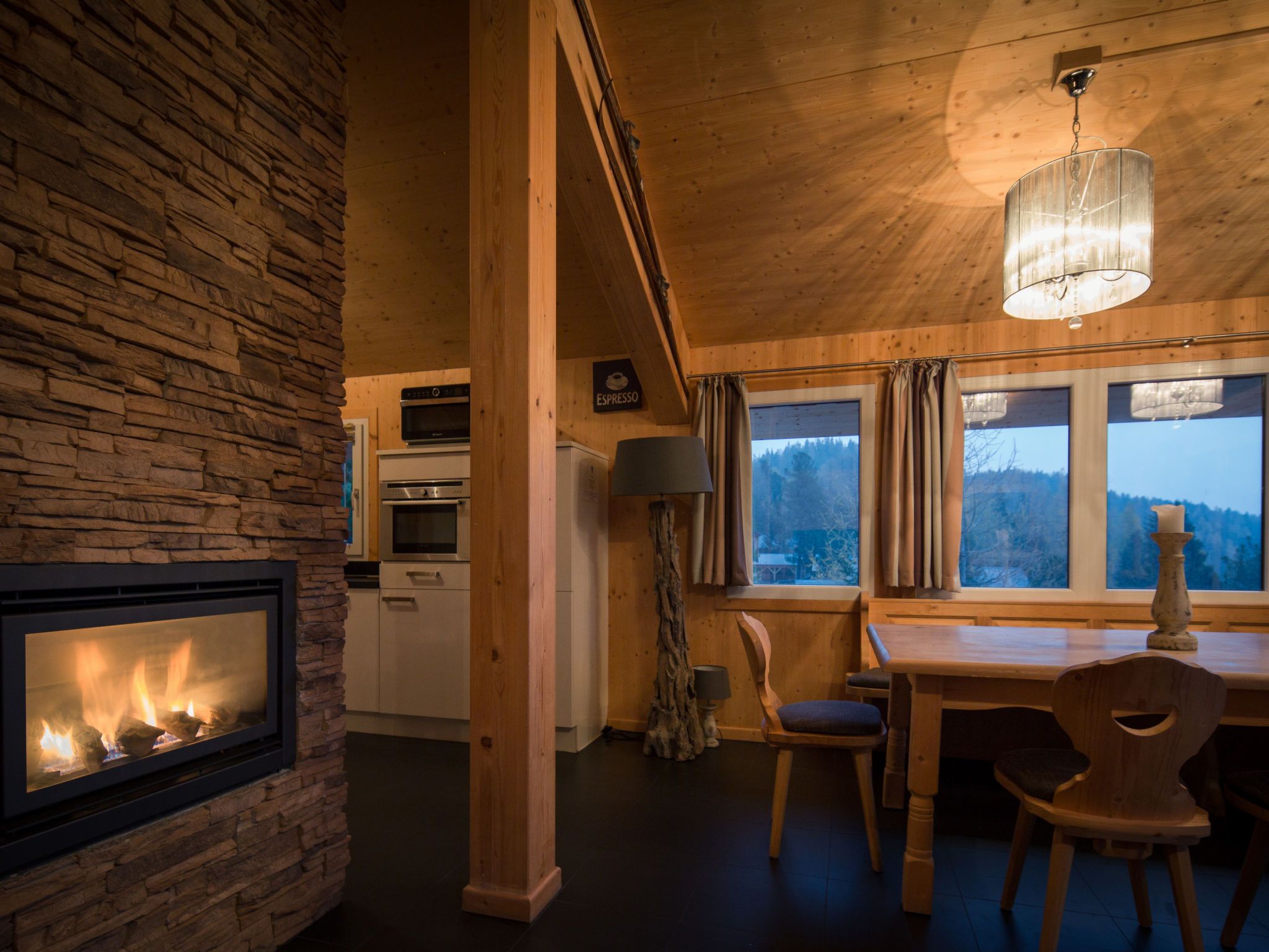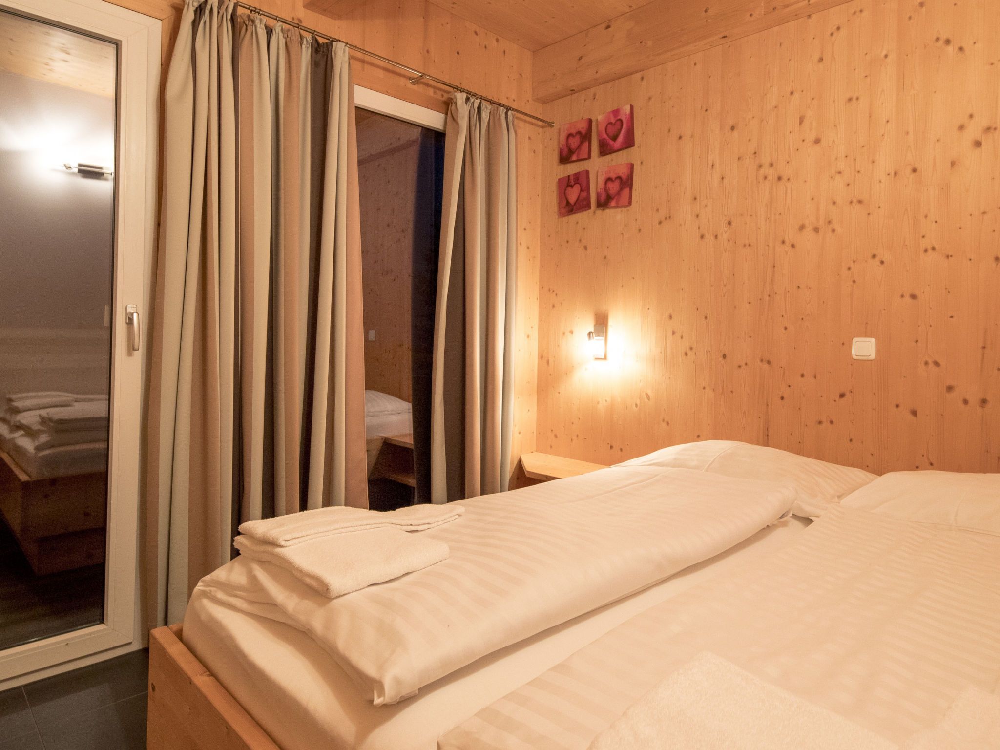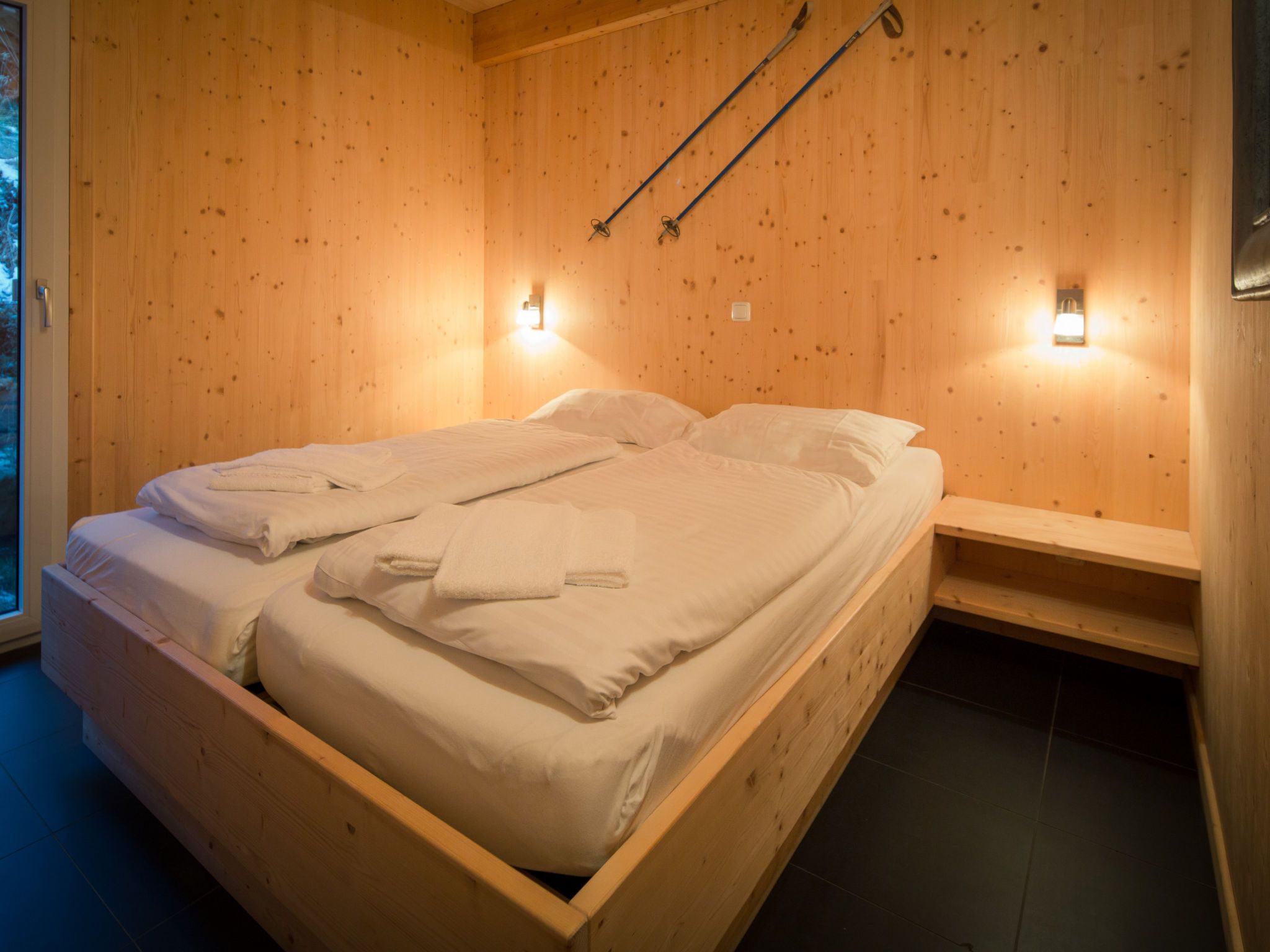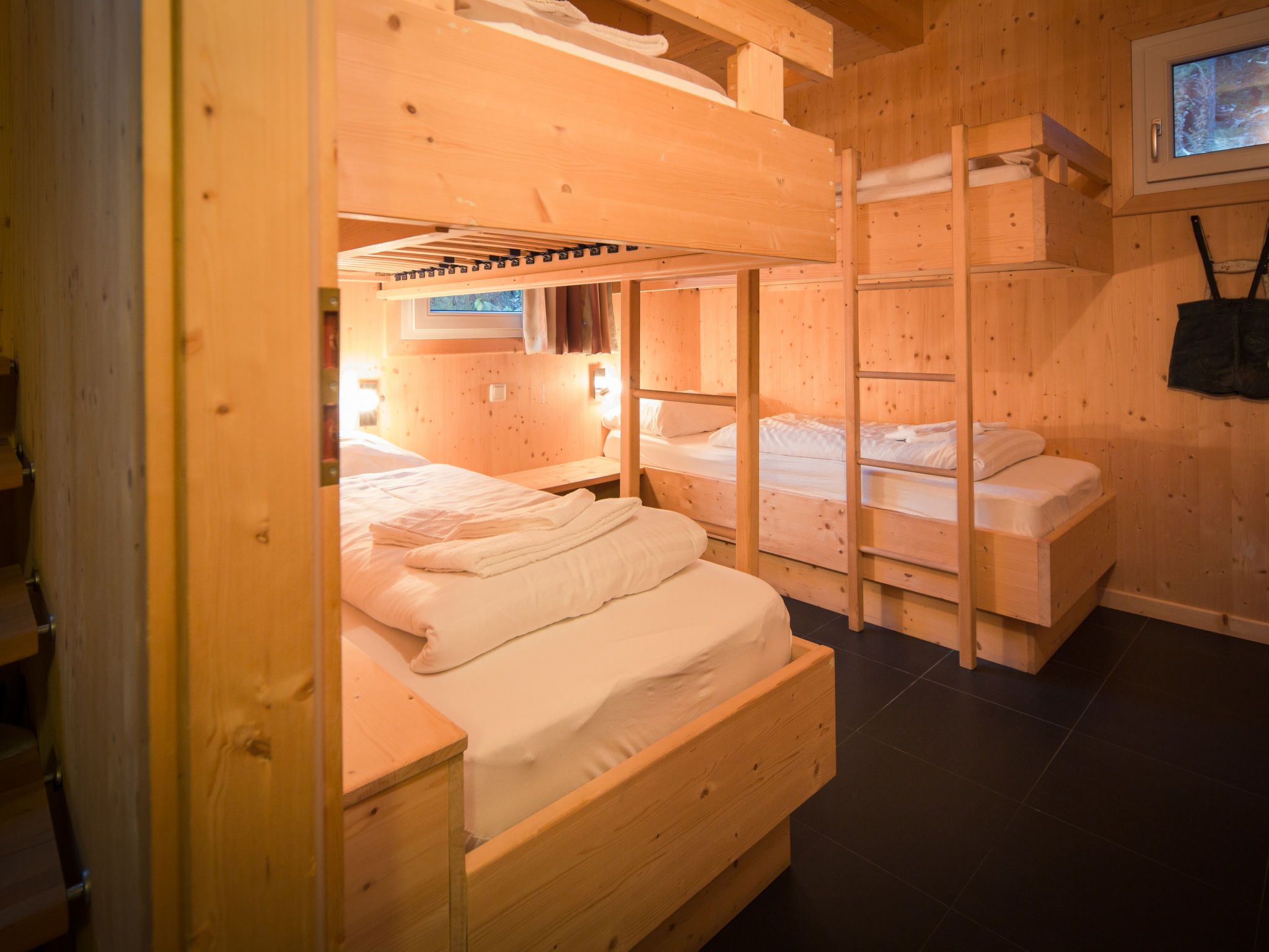 34 mit IR-Sauna und Sprudelbad innen, 6-Zimmer-Chalet 130 m2 auf 2 Stockwerken. Luxuriös und geschmackvoll eingerichtet: Wohn-/Esszimmer mit Essecke und Sat-TV (Flachbildschirm). Offene Küche (Backofen, Geschirrspüler, 4 Glaskeramikplatten, Toaster, Wasserkocher, Mikrowelle, elektrische Kaffeemaschine). Dusche/WC. Obergeschoss: 4 Doppelzimmer. 1 Zimmer mit 2 x 2 Etagenbetten. Bad/WC, Dusche/WC, Whirlbadewanne, Sauna. Balkon. Balkonmöbel. Schöne Sicht auf die Berge. Zur Verfügung: Internet (Wireless LAN, gratis). Bitte beachten: Nichtraucher-Unterkunft. Die Sauna ist eine Infrarotkabine.