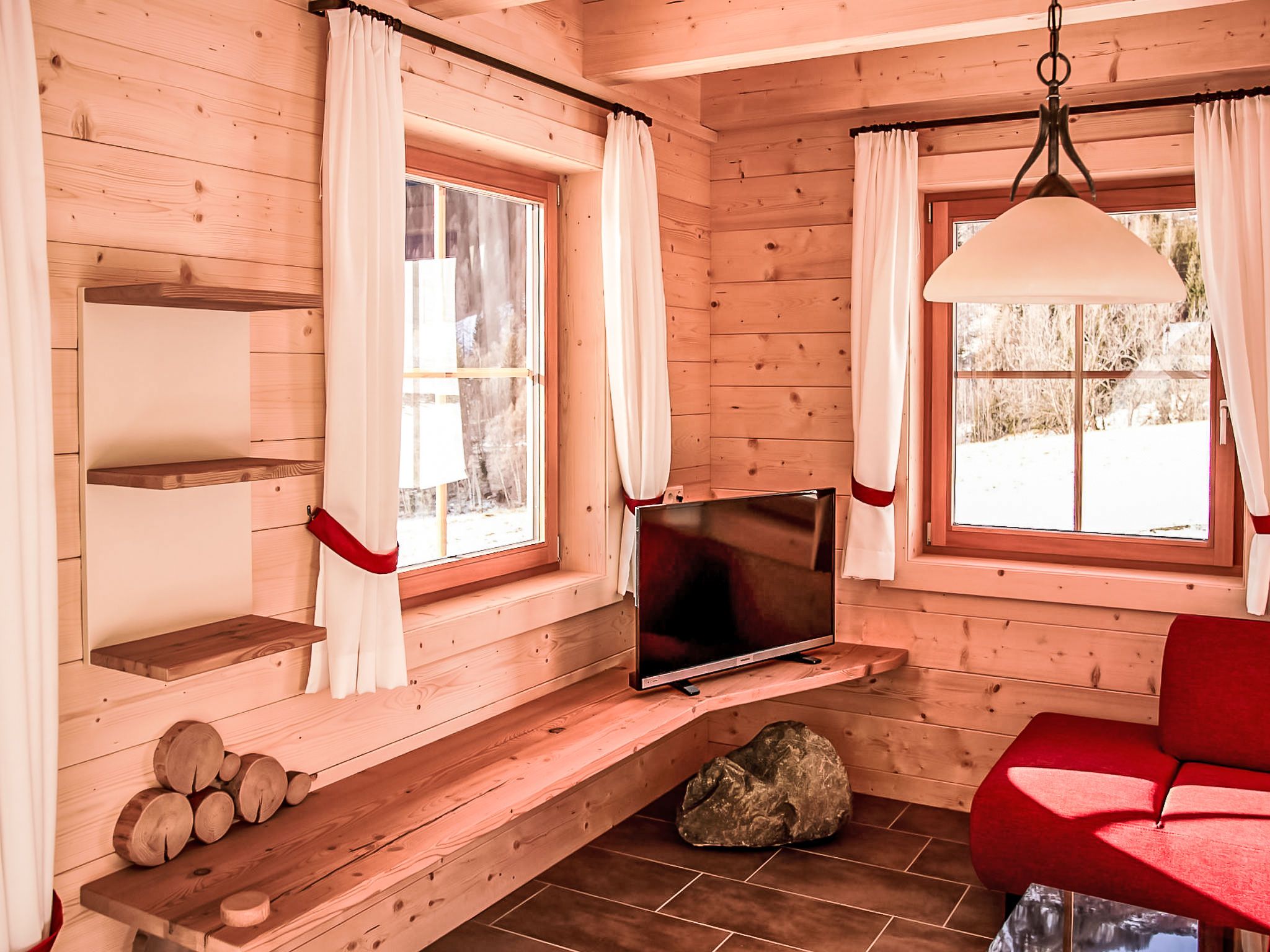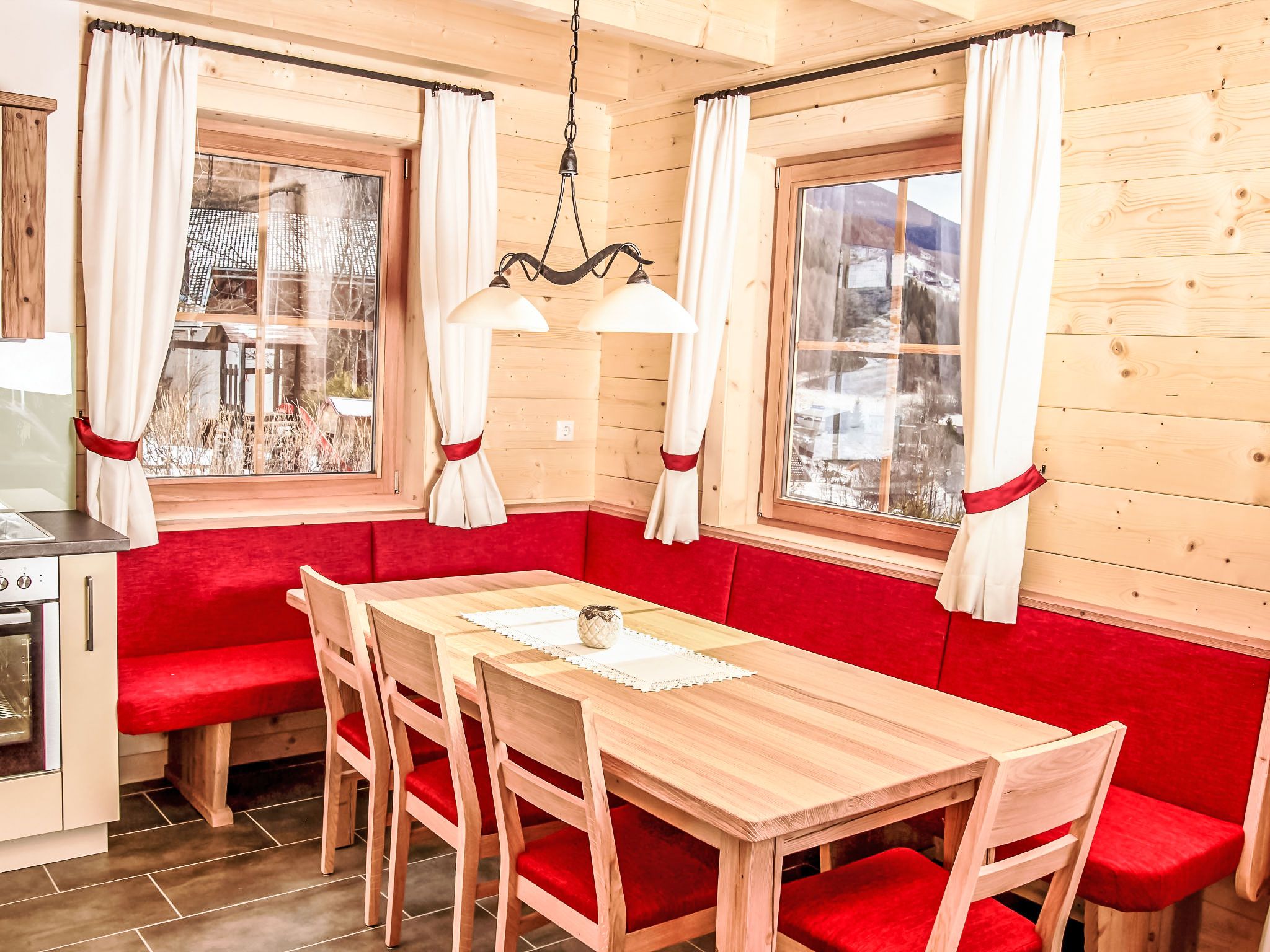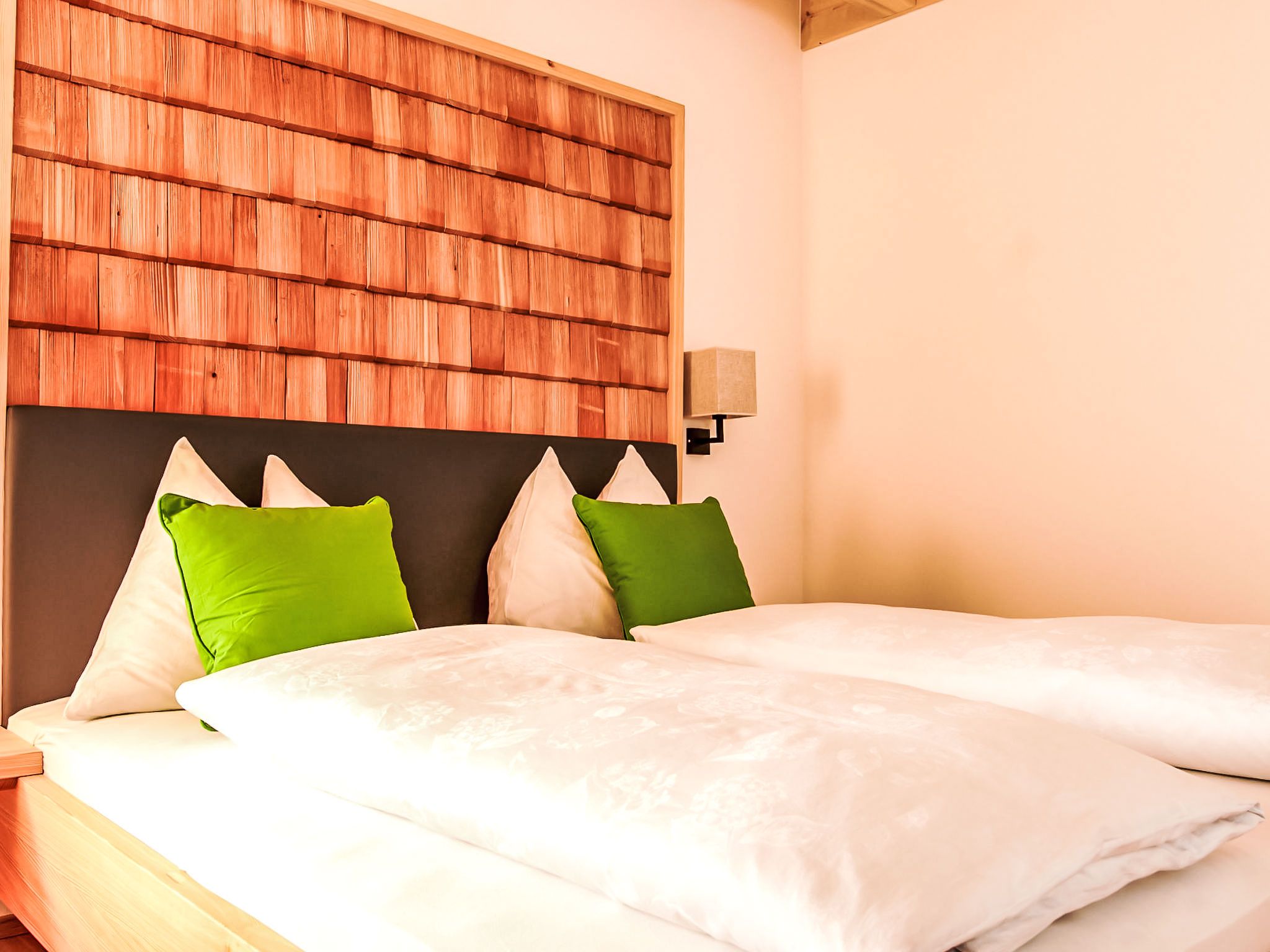 4-Zimmer-Landhaus 110 m2 auf 2 Stockwerken. Romantisch und mit viel Holz eingerichtet: Eingang. 1 Doppelzimmer. Offenes Wohnzimmer mit Sat-TV (Flachbildschirm), Holzofen. Ausgang zur Terrasse. Offene Küche (Backofen, Geschirrspüler, 4 Glaskeramikplatten, Mikrowelle, Tiefkühler, elektrische Kaffeemaschine) mit Essecke. 2 Duschen/WC, Doppelwaschbecken. Bodenheizung. Dachgeschoss: 1 Zimmer mit 2 Betten (90 cm, Länge 200 cm). 1 Doppelzimmer. Ausgang zum Balkon. Balkon 7 m2, Südlage, grosse Terrasse 20 m2, Südlage. Terrassenmöbel, Liegestühle (4). Sehr schöne Panoramasicht auf die Berge. Zur Verfügung: Waschmaschine, Kinderhochstuhl, Babybett bis 2 Jahre, Haartrockner. Internet (WLAN, gratis). Bitte beachten: geeignet für Familien. Nichtraucher-Unterkunft. Maximal 1 Haustier/Hund erlaubt. Rauchmelder. Im Dachgeschoß ist eines der Betten ein Hochbett in der Dachschräge .