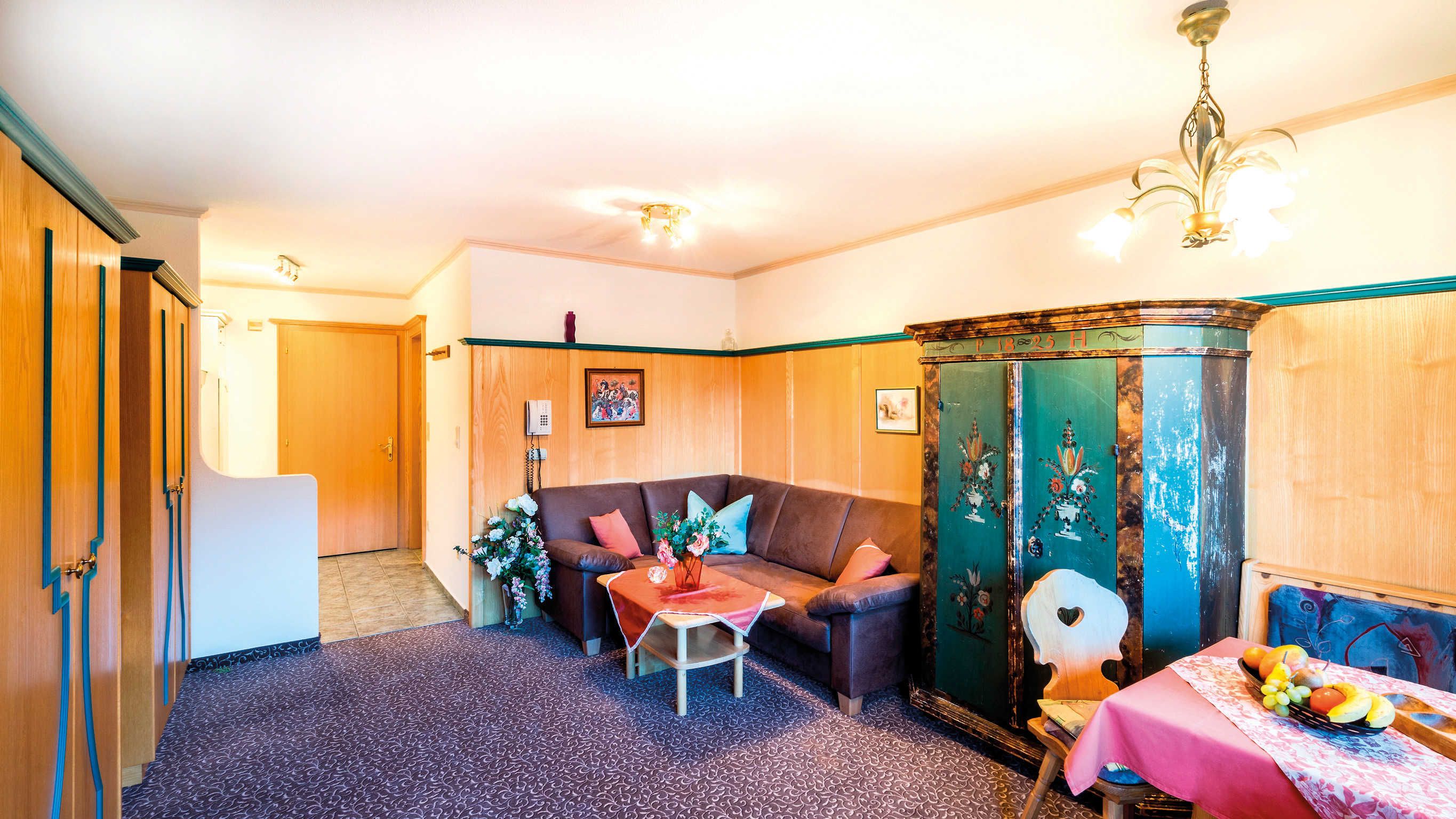 1-Raum-Wohnung, Wohnschlafraum mit Doppelbetten, Sitzecke, Kochnische, Bad, WC, Telefon, Kabel- TV, Radio, Süd- oder Westbalkon oder Südterrasse.