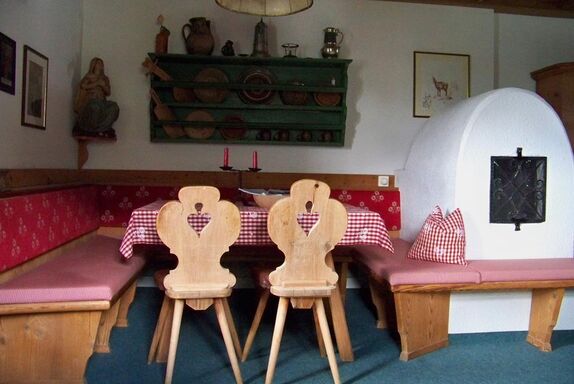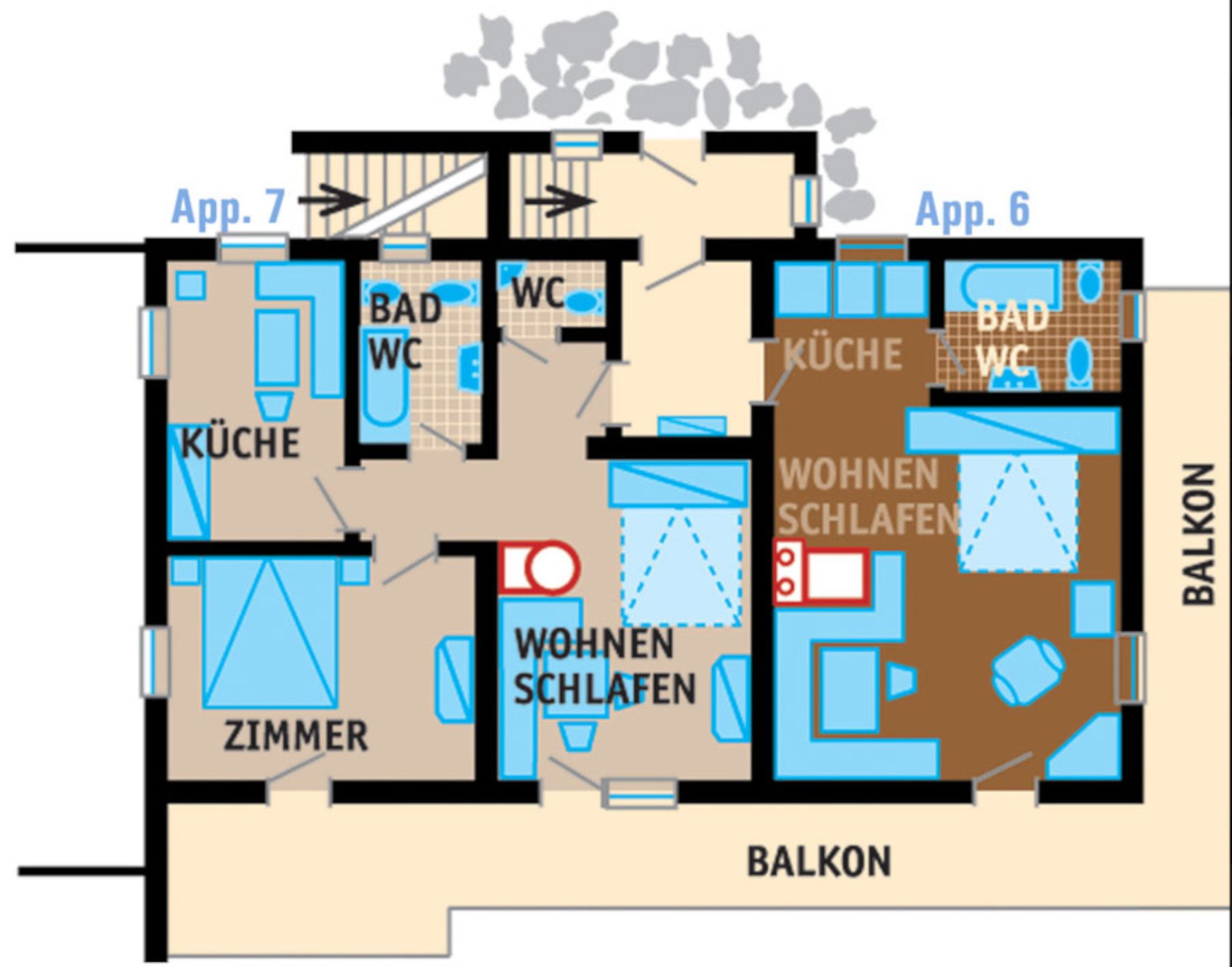 Das Appartement 6 und 8: liegt im unteren Haus im Erdgeschoss / 1. Stock und hat ca. 36 m². Die Wohnung besteht aus: 1 Wohn-Schlafraum mit 2 Betten, Kochnische, Bauernofen mit Ofenbank und Sitzecke, Flat-TV, 1 Bad mit Badewanne/WC, sowie einen nach Süden und Westen ausgerichteten Balkon. Der direkte Zugang zum Hallenbad macht dieses Appartement zu etwas besonderem.