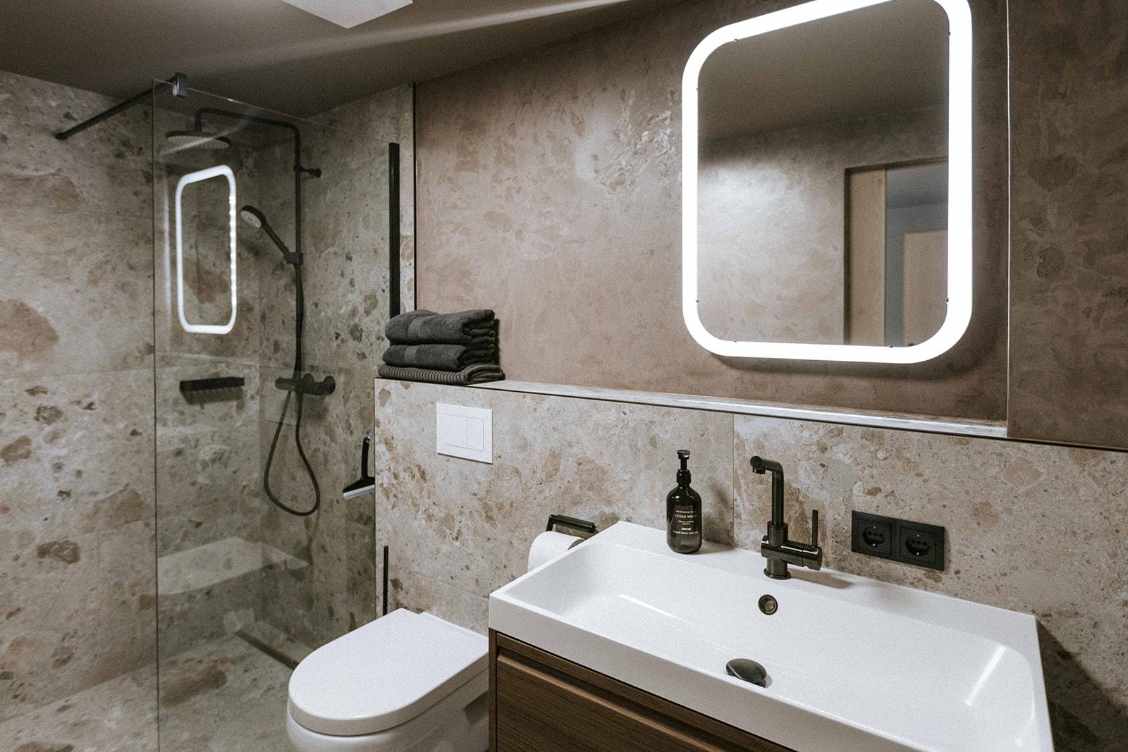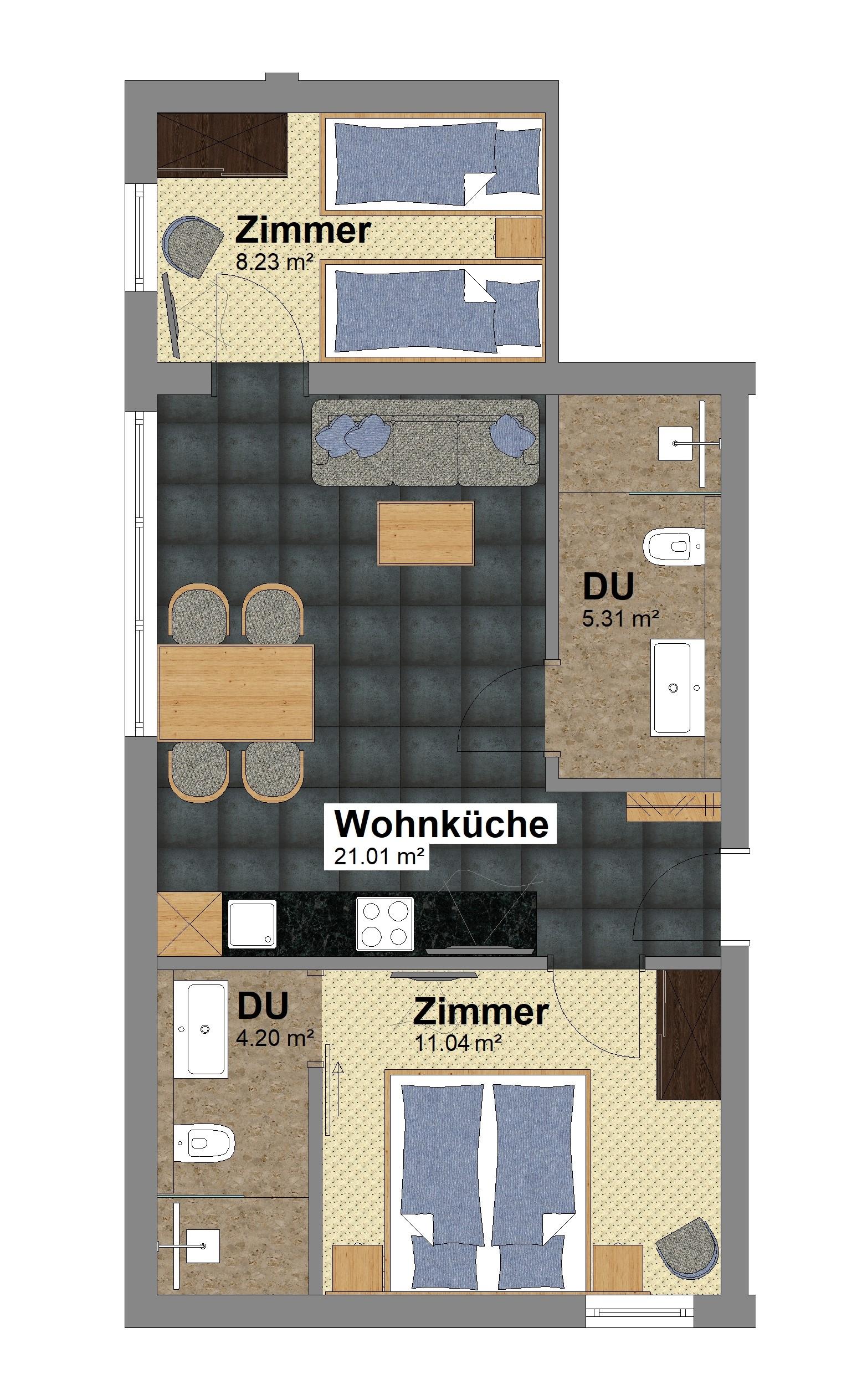 Unser im Sommer 2020 komplett renoviertes Appartement wird Sie begeistern. Modern, stylisch und doch gemütlich. Von der geräumigen Wohnküche mit Esstisch, Couchbereich, einer vollausgestatteten Küche mit Flat-TV gelangen Sie in die 2 Schlafzimmer mit Doppelbett. Jedes Schlafzimmer verfügt über ein durch eine moderne Glasschiebetür abgetrenntes Bad mit Dusche und WC, Haarföhn, Kosmetikspiegel. Größe ca. 50 m²