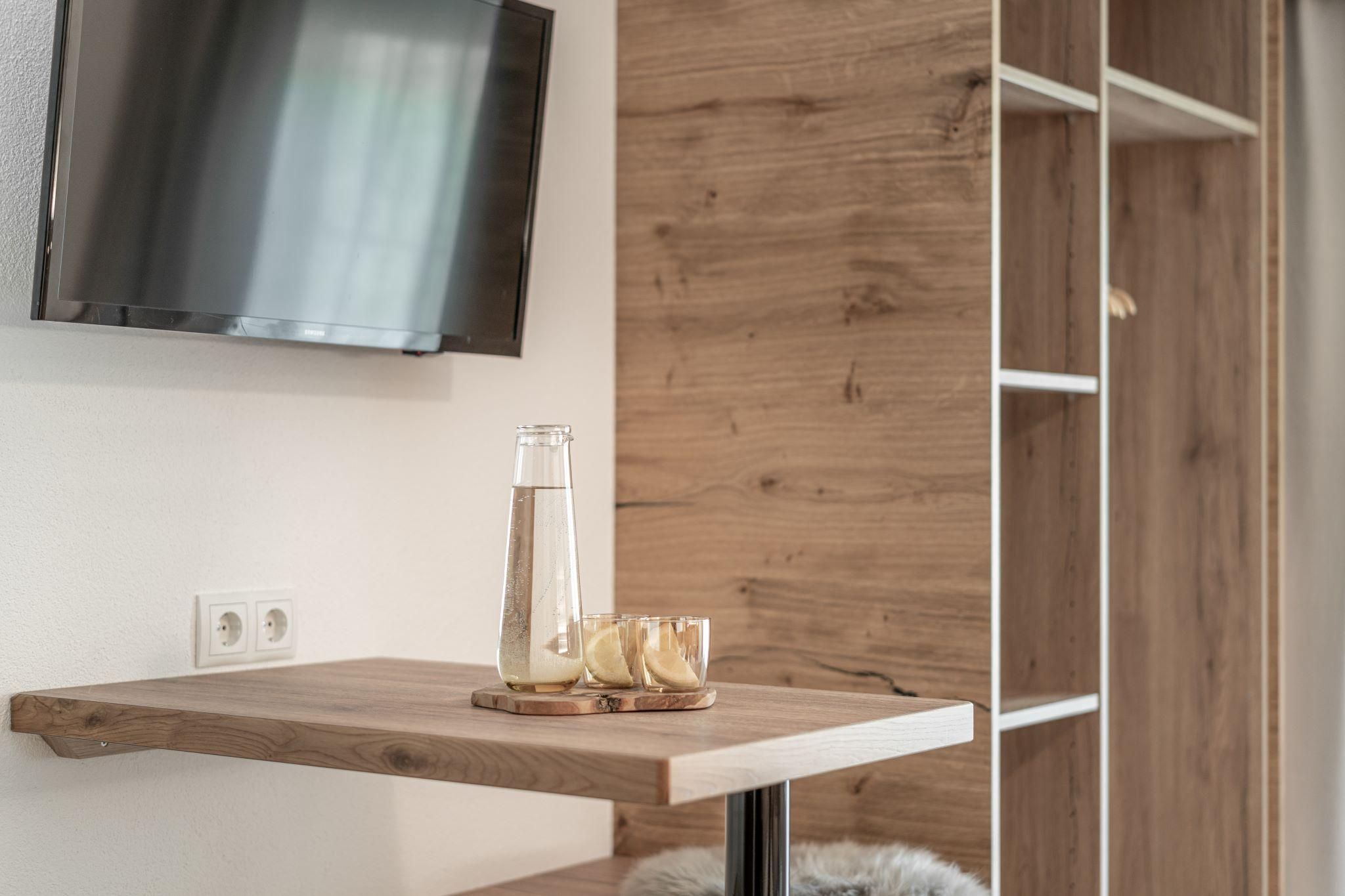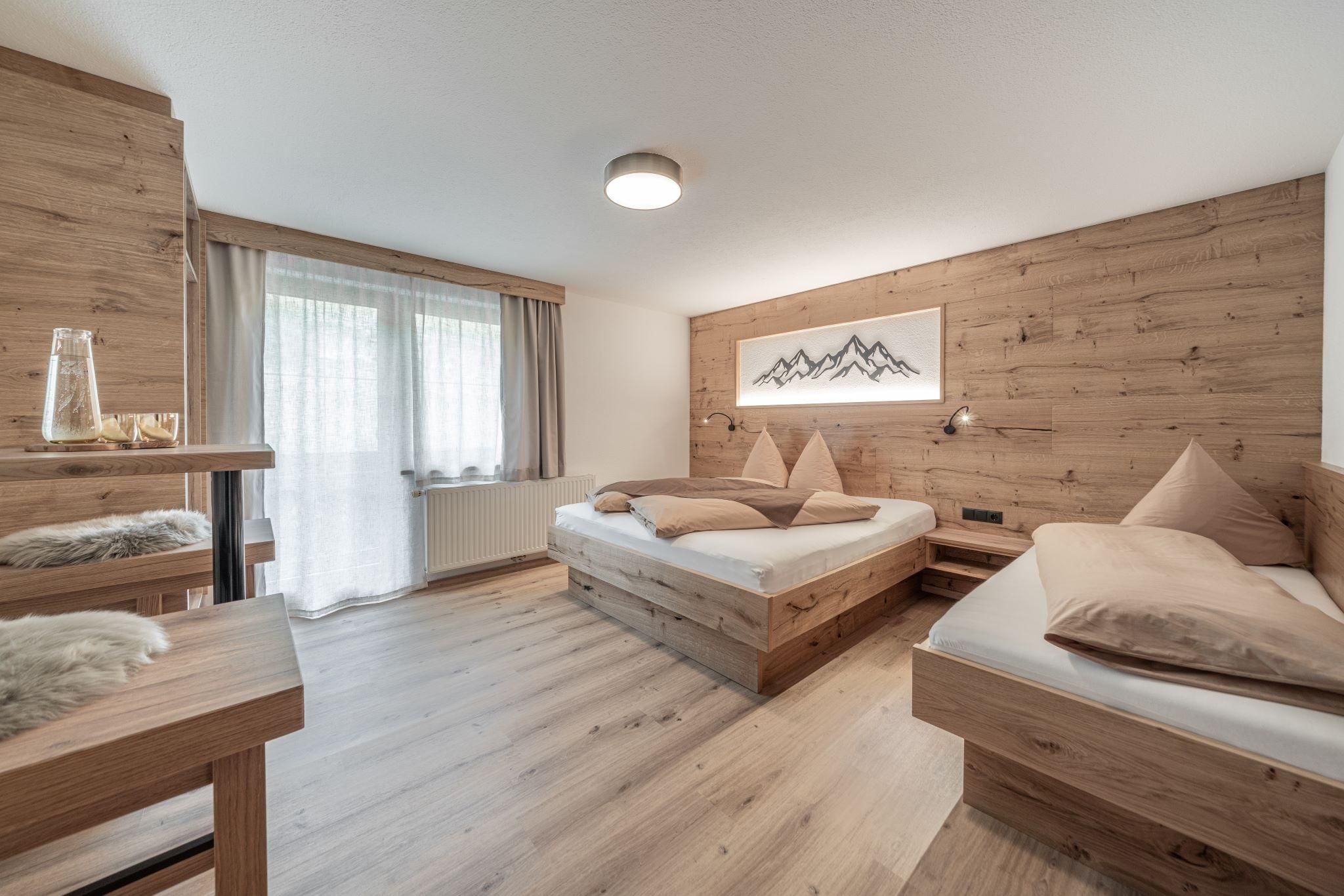 Vom Tischlermeister stilvoll und behaglich eingerichtetes Zimmer mit Doppel- und Einzelbett, Dusche/WC, Kabel-TV, Zimmersafe, Haarföhn. Nichtraucherzimmer mit Balkon. Genießen Sie den traumhaften Panoramablick auf die Ötztaler.