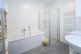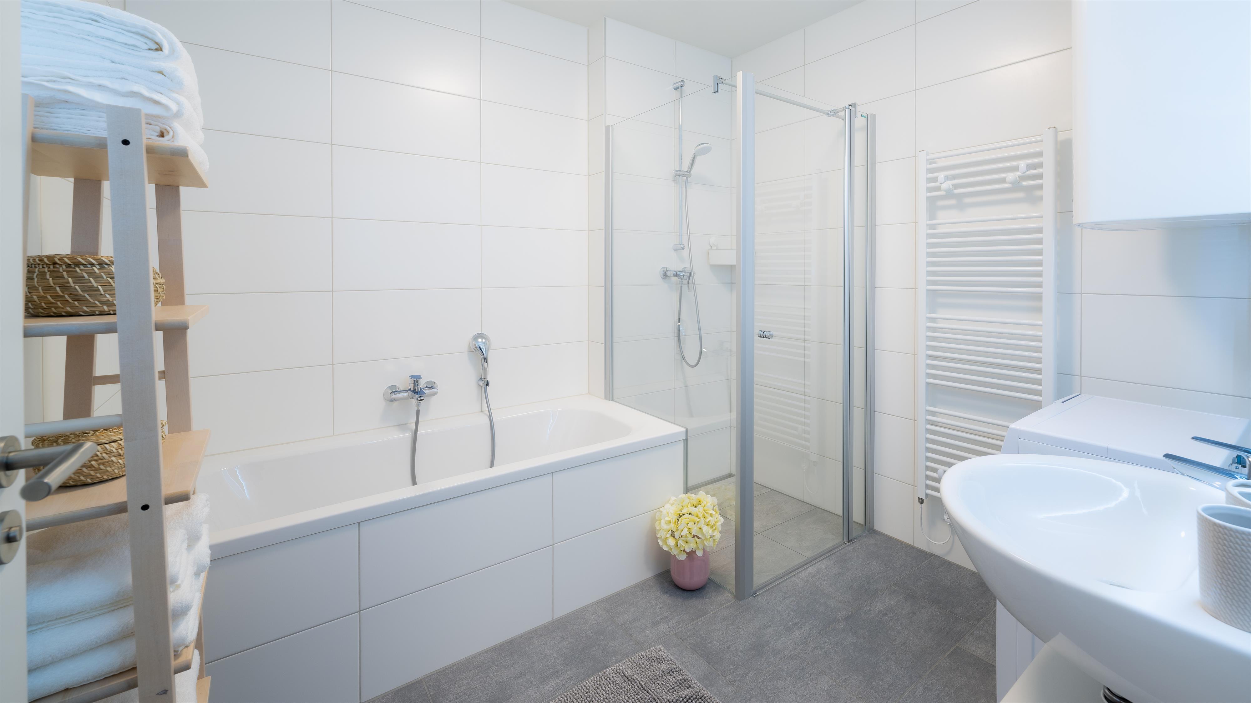 • Badezimmer mit Waschtisch, Dusche, Toilette, Fön und elektr. Handtuchtrockner und Waschmaschine