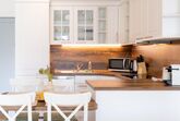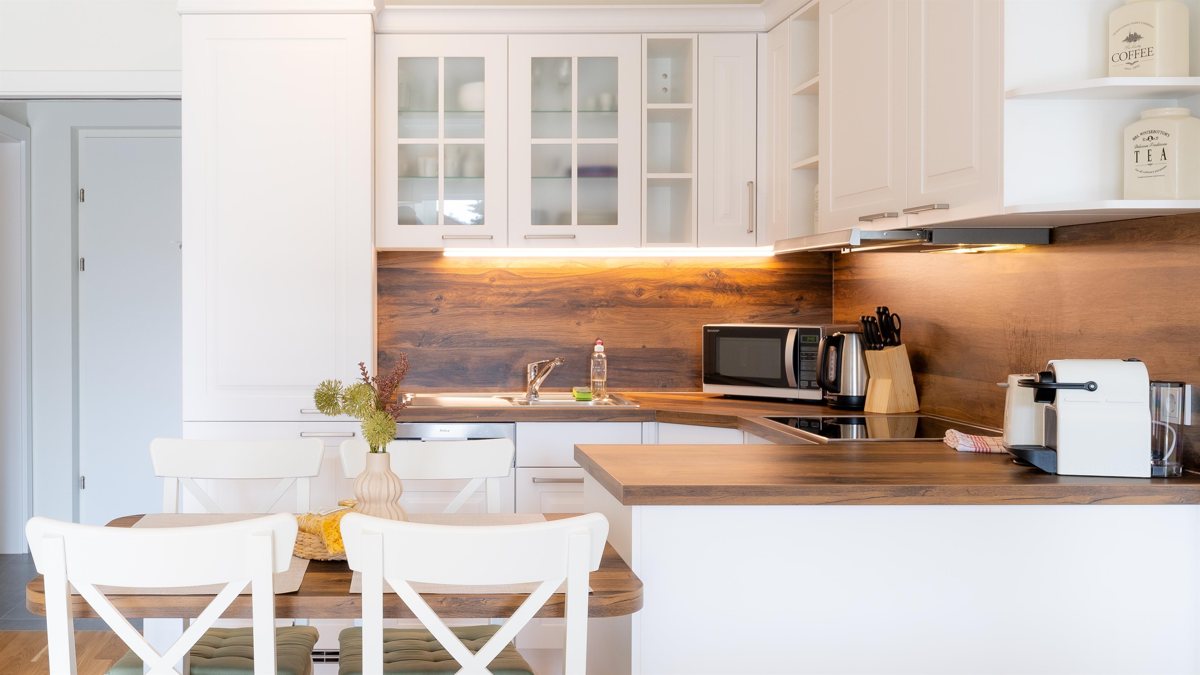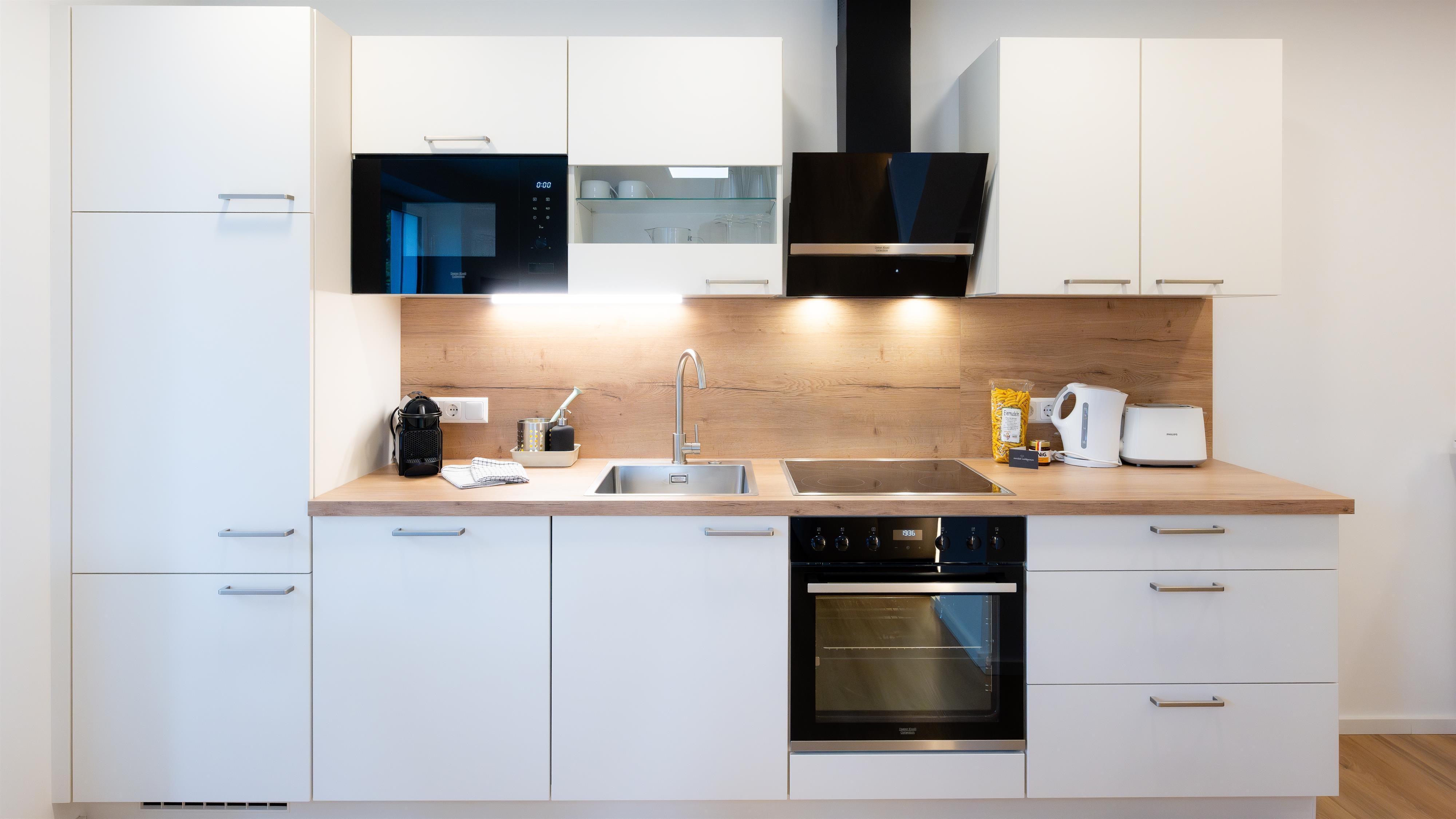 Voll ausgestattete, moderne Küche mit Cerankochfeld, Backofen, Dunstabzugshaube, Geschirrspüler, Kühlschrank mit Gefrierfach, Kaffeemaschine(Kapseln-Nespresso), Mikrowelle, Wasserkocher, Toaster, Geschirrtücher und selbstverständlich ausreichend Geschirr, Pfannen und Töpfe.