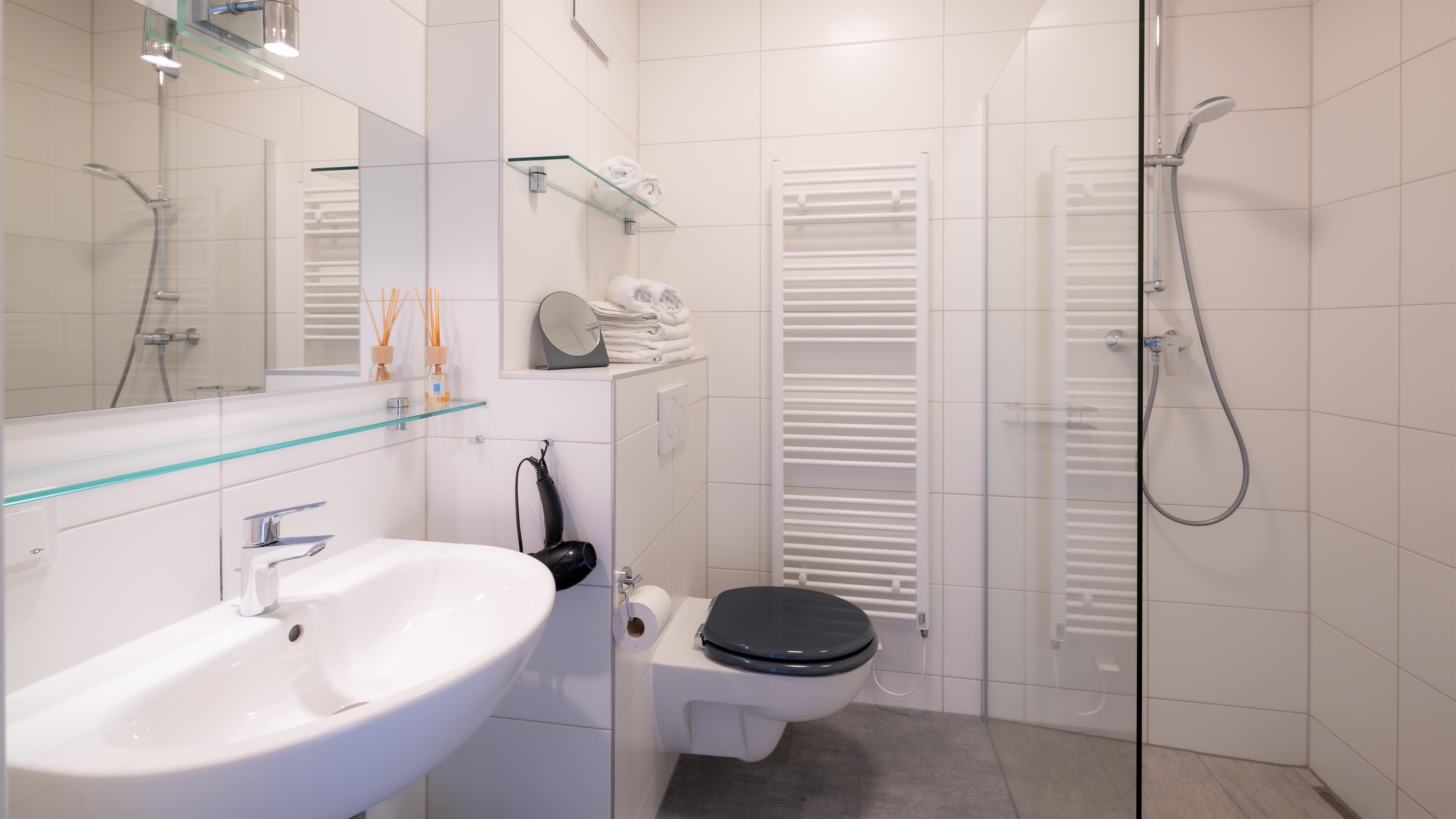 Das komfortable Badezimmer verfügt über einen Waschtisch, eine Dusche sowie eine Toilette. Hand-, Duschtücher, Fön und elektr. Handtuchtrockner sind vorhanden.