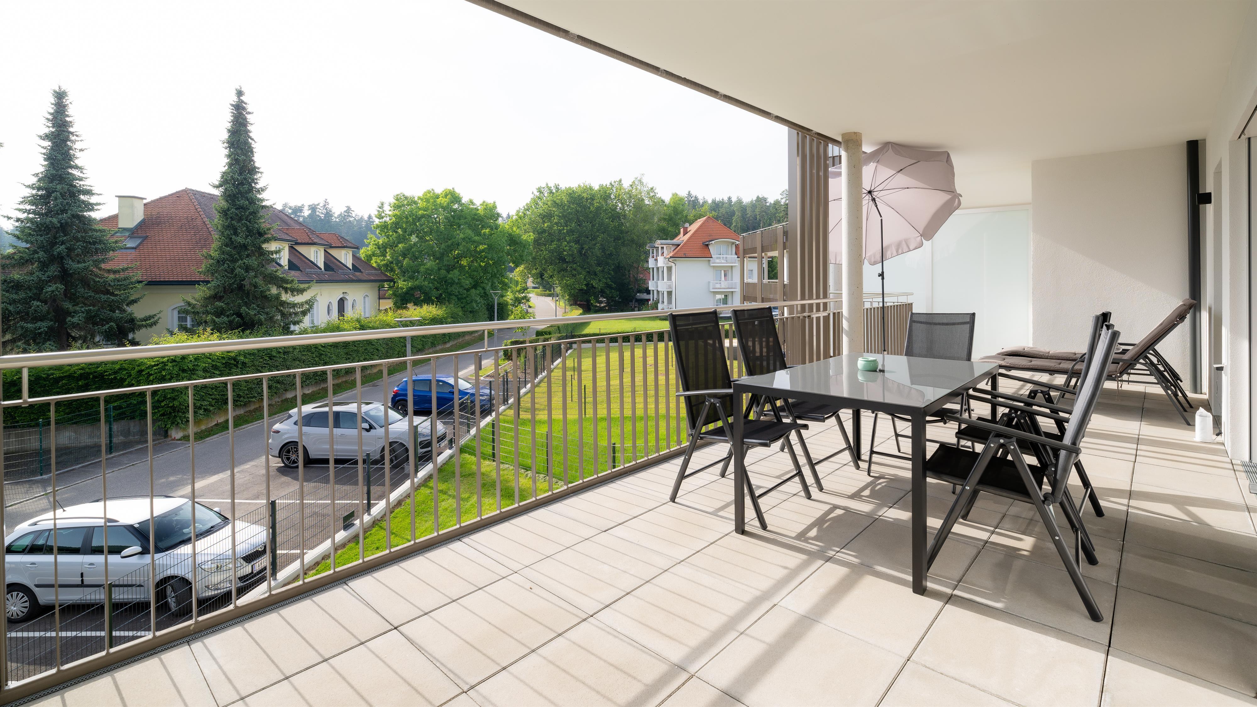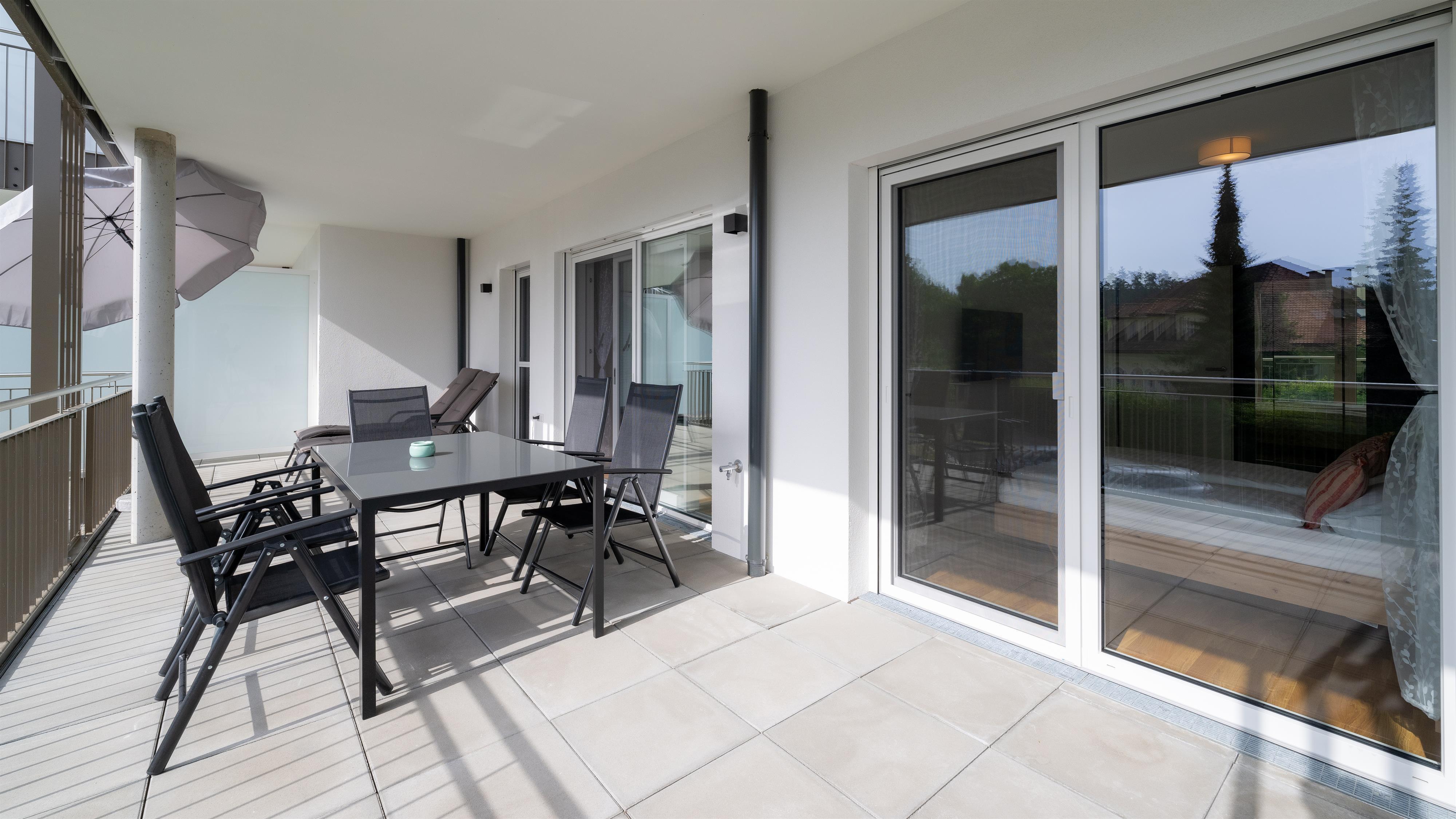 Wohnen am Römerweg TOP 11 63m² - maximal 5 Personen, 1. Etage Modernes, vollständig ausgestattetes Apartment, Badezimmer, Wohnraum mit Schlafcouch und 26m² großem überdachten Balkon Richtung Westen, zwei Schlafzimmer mit Doppelbetten