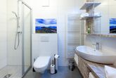 Das komfortable Badezimmer verfügt über einen Waschtisch, eine Dusche sowie eine Toilette. Hand-, Duschtücher, Fön und elektr. Handtuchtrockner sind vorhanden.