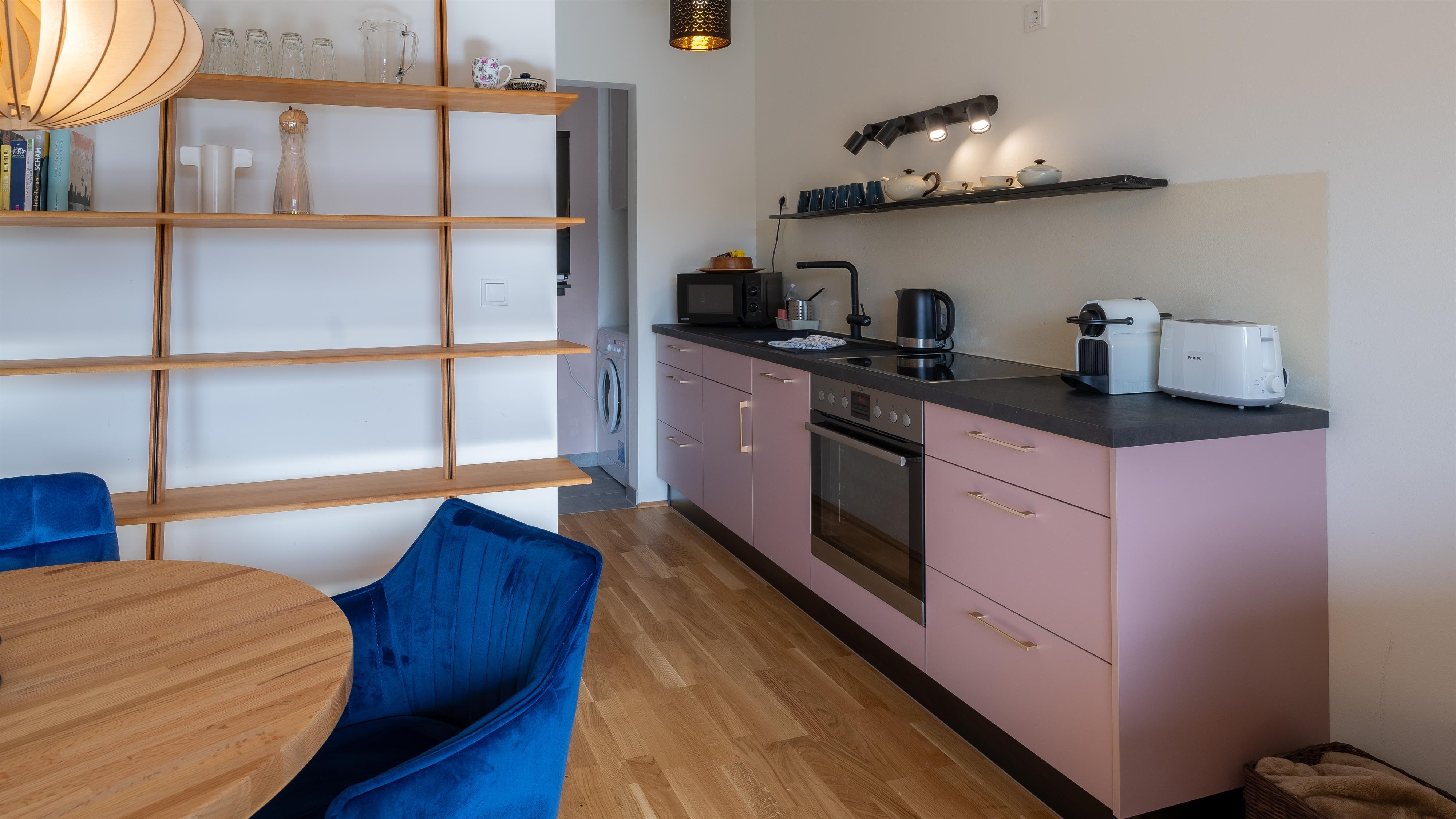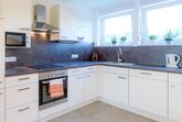 Voll ausgestattete, moderne Küche mit Cerankochfeld, Backofen, Dunstabzugshaube, Geschirrspüler, Kühlschrank mit Gefrierfach, Kaffeemaschine(Kapseln-Nespresso), Mikrowelle, Wasserkocher, Toaster, Geschirrtücher und selbstverständlich ausreichend Geschirr, Pfannen und Töpfe.