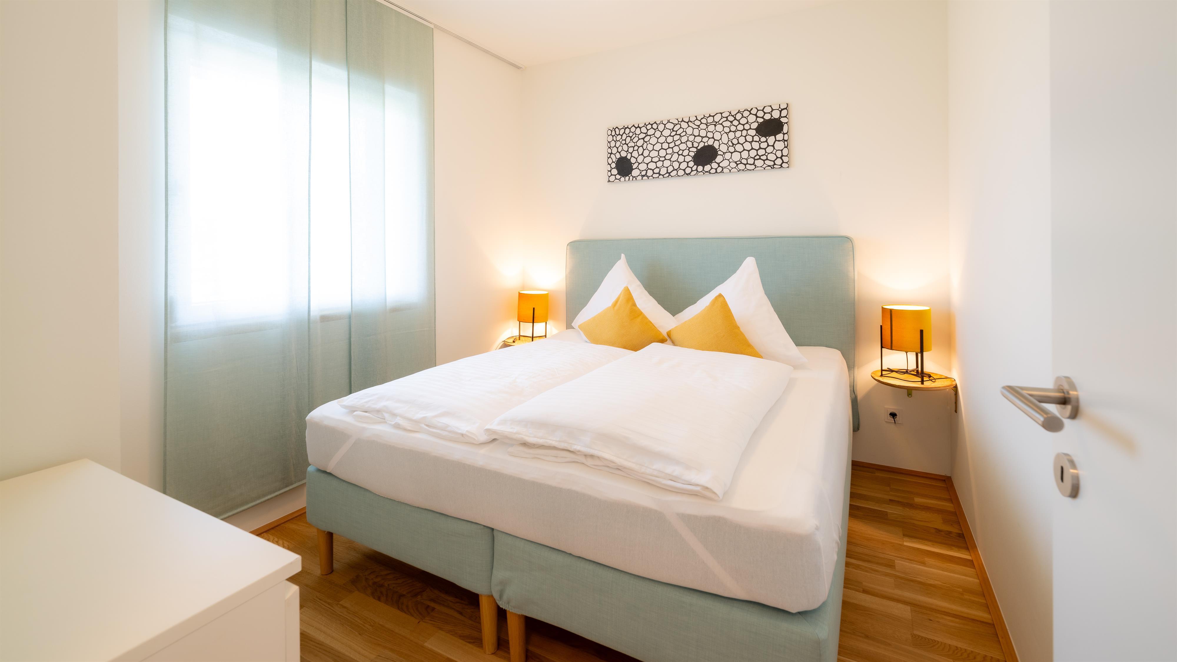 Ein Schlafzimmer ist mit einem bequemen Doppelbett eingerichtet, das zweite Schlafzimmer mit zwei getrennten Einzelbetten. Rollos und Insektenschutz sorgen für einen erholsamen Schlaf, Bettwäsche ist vorhanden.