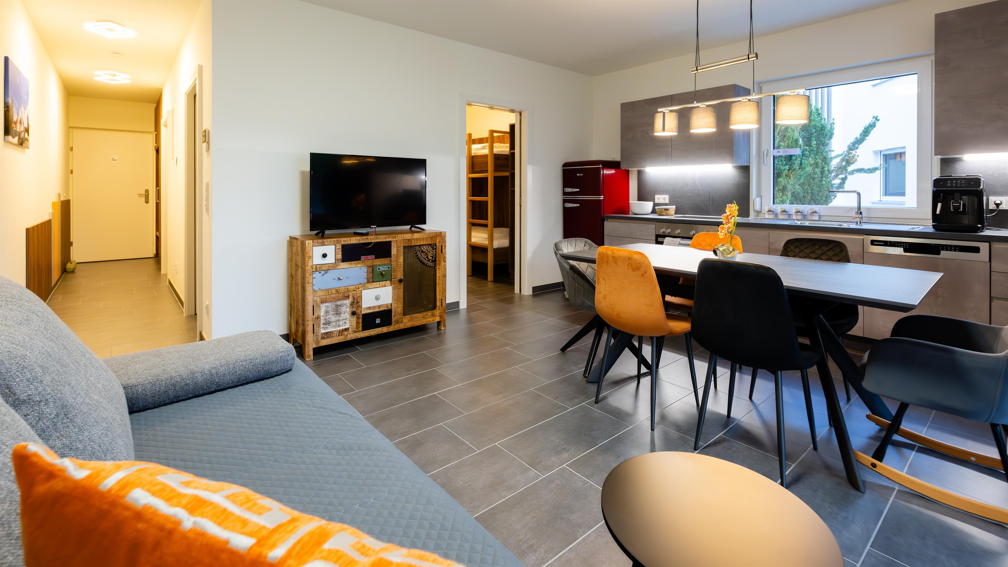 Gemütliches Wohn- und Esszimmer mit großzügiger Schlafcouch (bietet Schlafgelegenheit für bis zu 2 Personen).