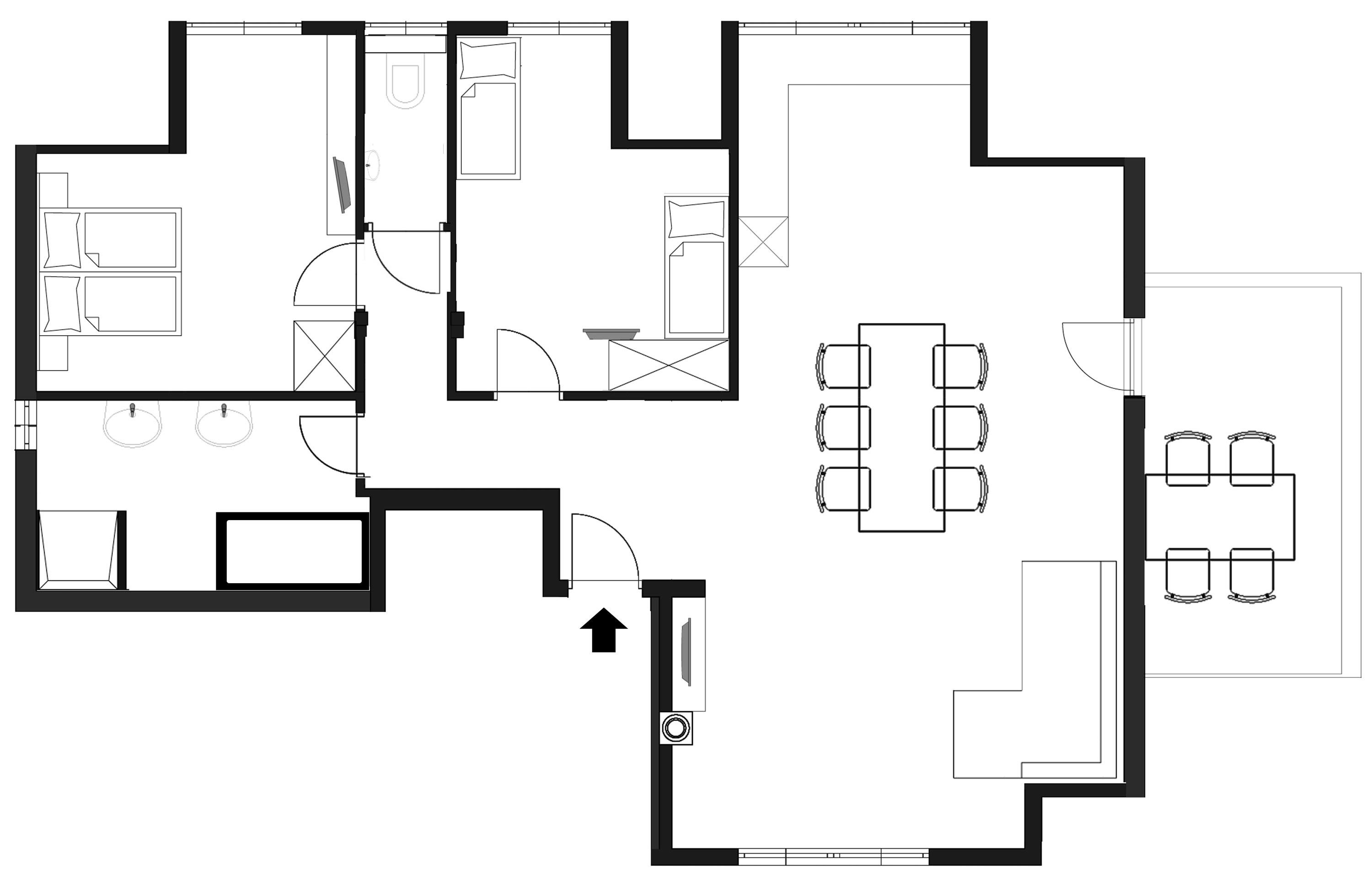 Das komfortable Badezimmer verfügt über zwei Waschtische, eine Dusche und eine Badewanne. Hand-, Duschtücher, Fön und elektr. Handtuchtrockner sind vorhanden.