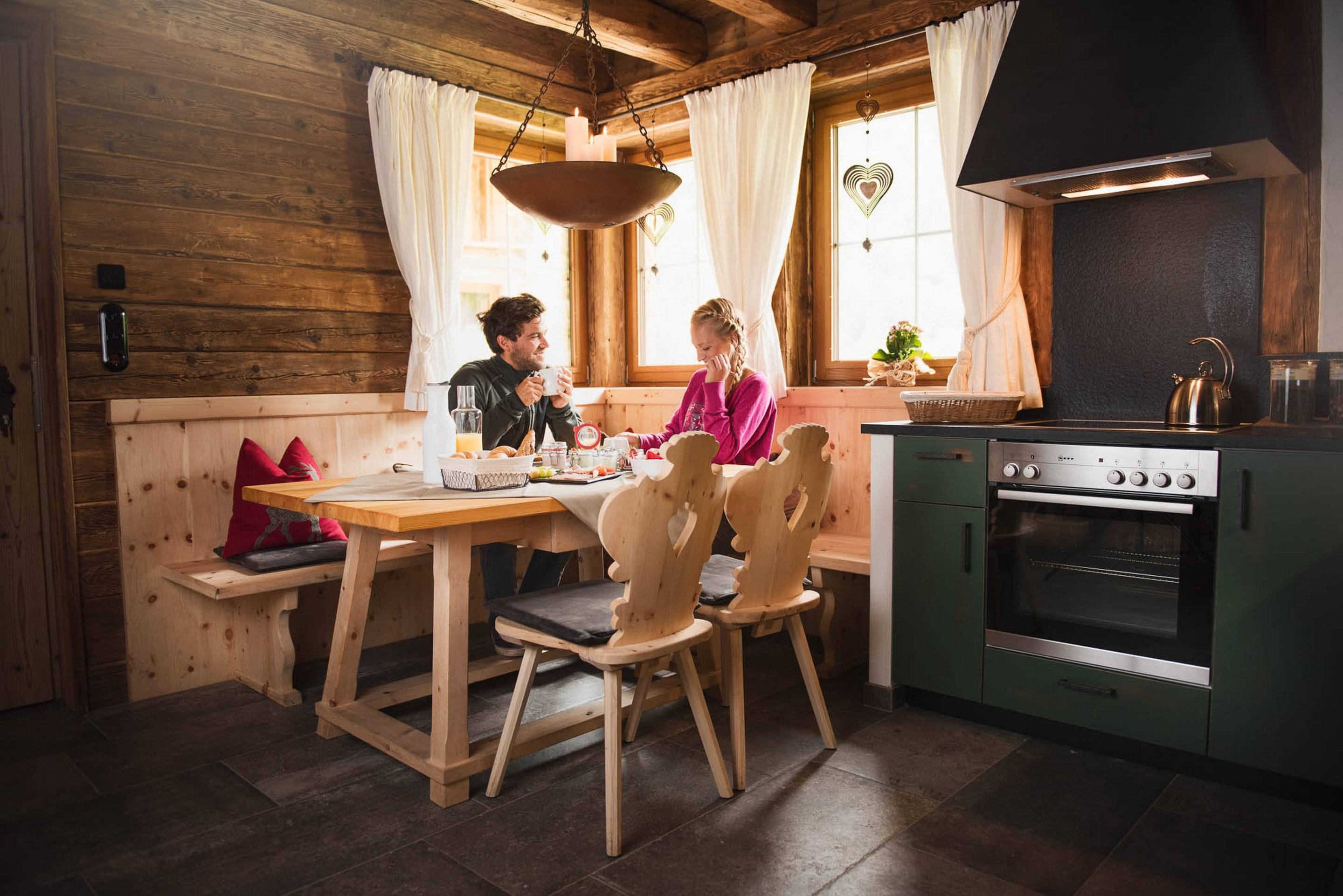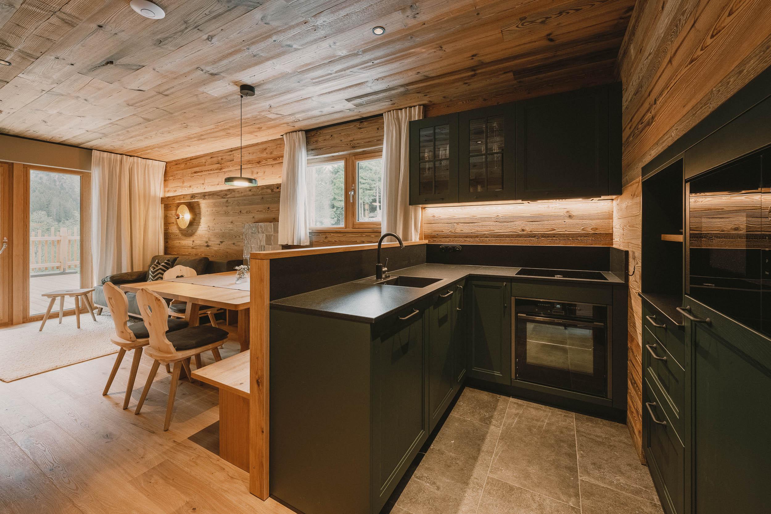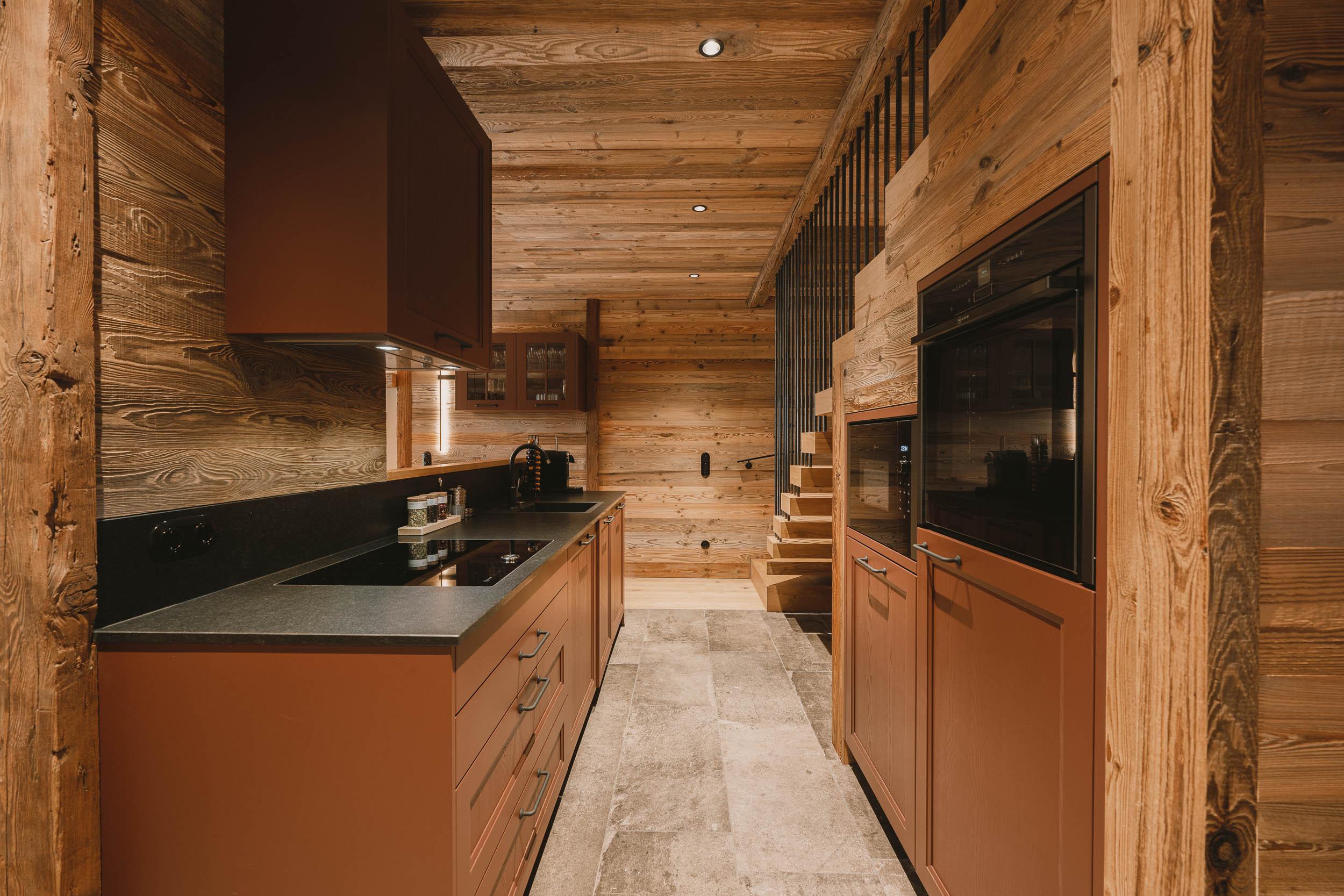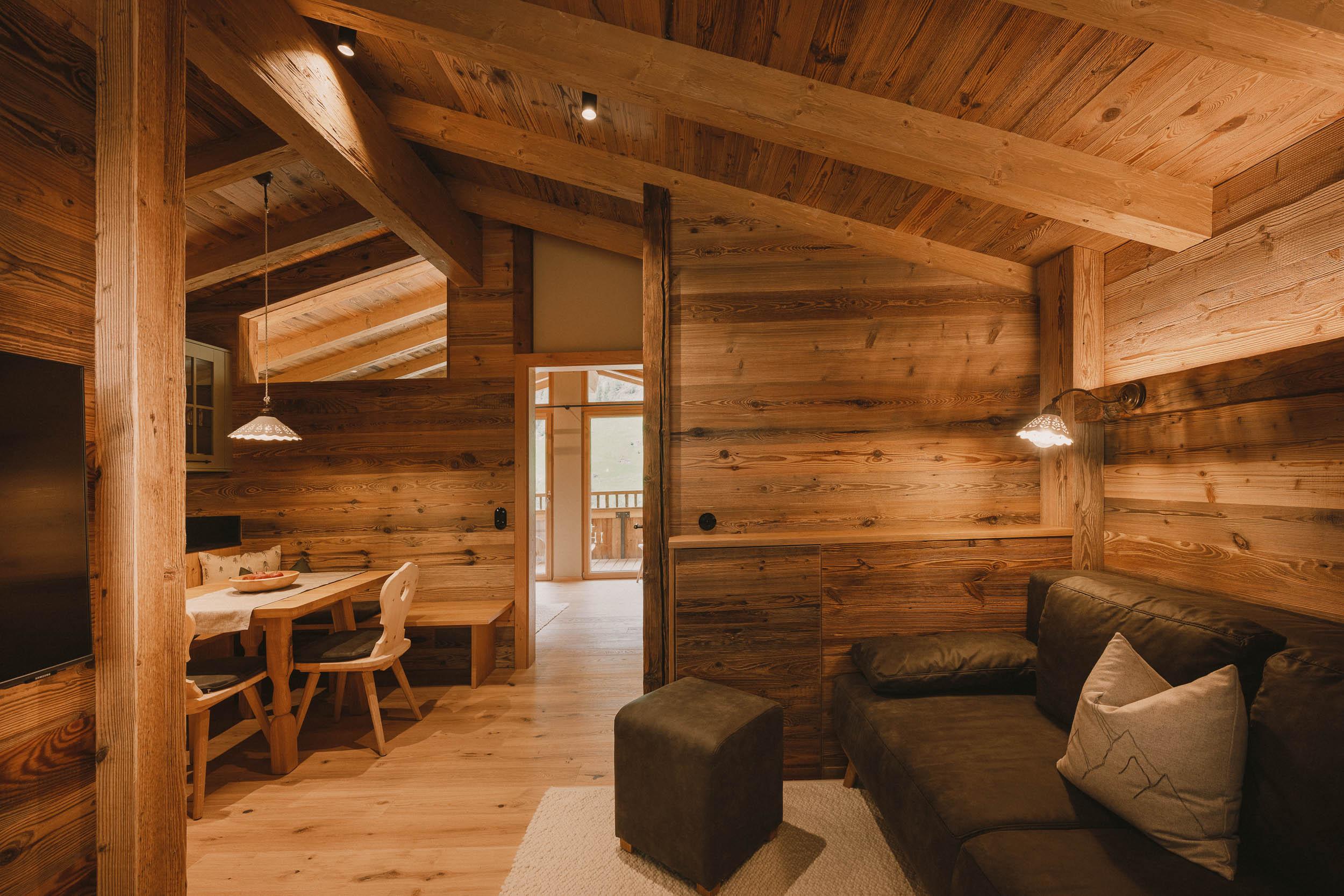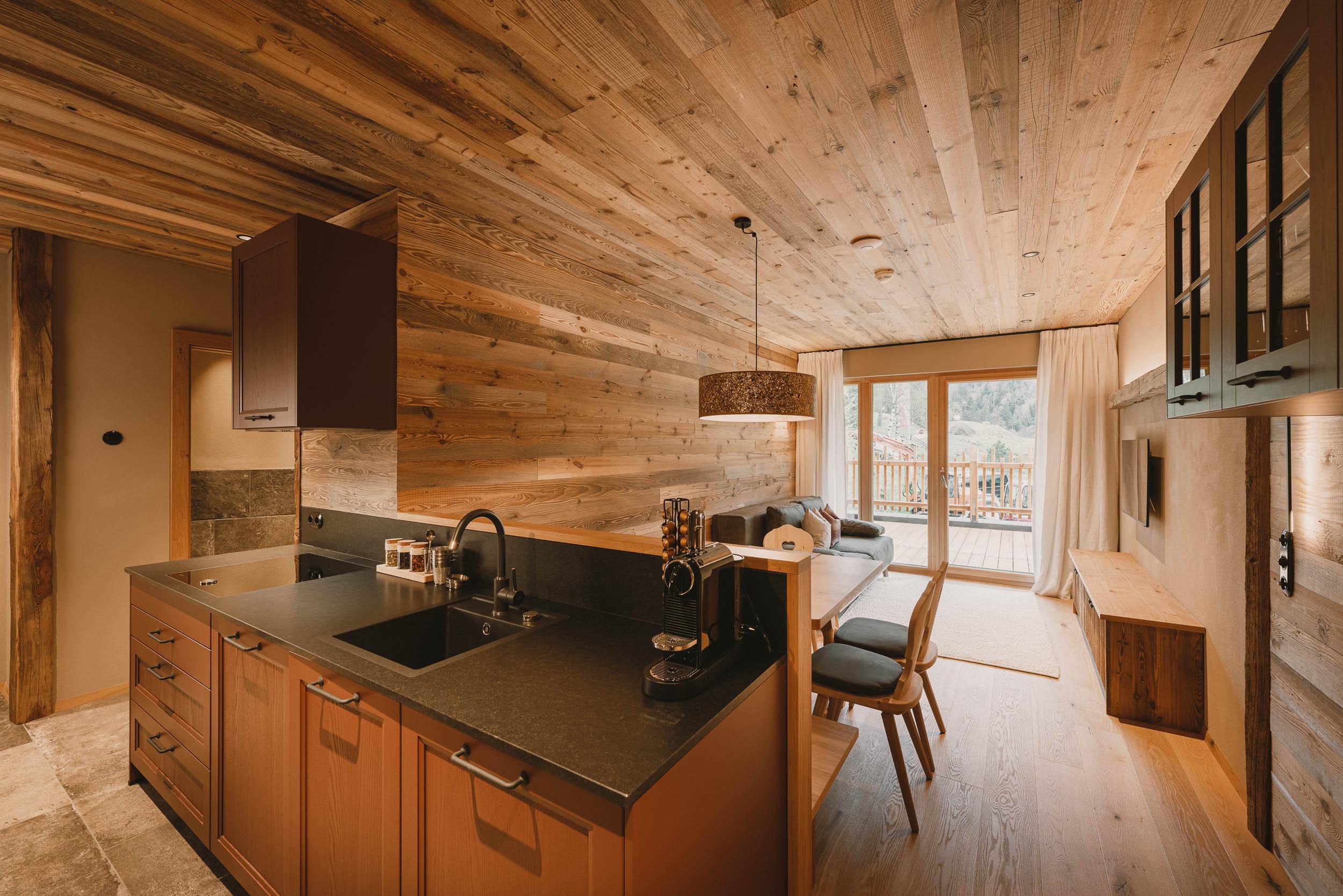 Über 75 m2 gemütliche Wohnfläche inkl. privater Terrasse im typischen, authentischen Altholzstil mit einem gemütlichen Wohnzimmer, Kuschelecke und voll ausgestatteter Küche mit Herd, Ofen, Kühlschrank sowie Kaffemaschine und Geschirrspüler.