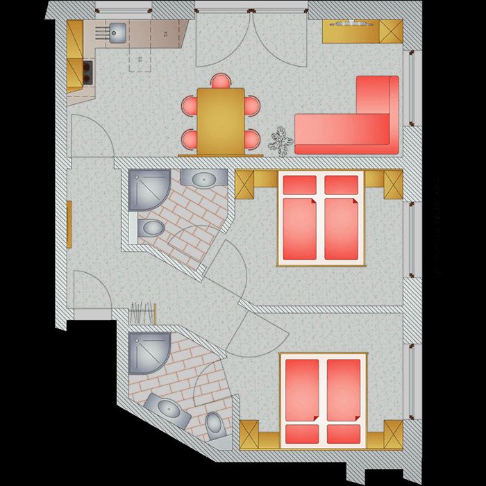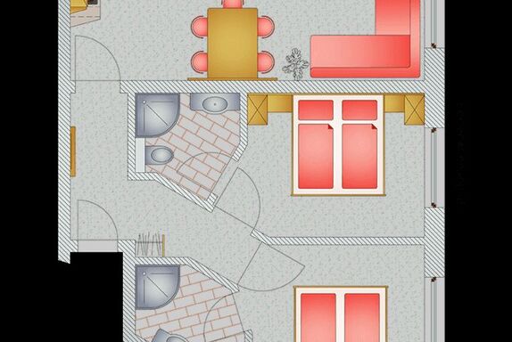 60qm Vollholzmöbel für 2-4 Personen geeignet 2 Schlafzimmer mit je getrennten Dusche WC ebenerdige Wohnung mit eigenem Zugang zum Garten barrierefrei gut ausgestattete Küche im Landhausstil mit Esstisch
