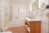 • Badezimmer mit Dusche, WC, Föhn und Kosmetikspiegel