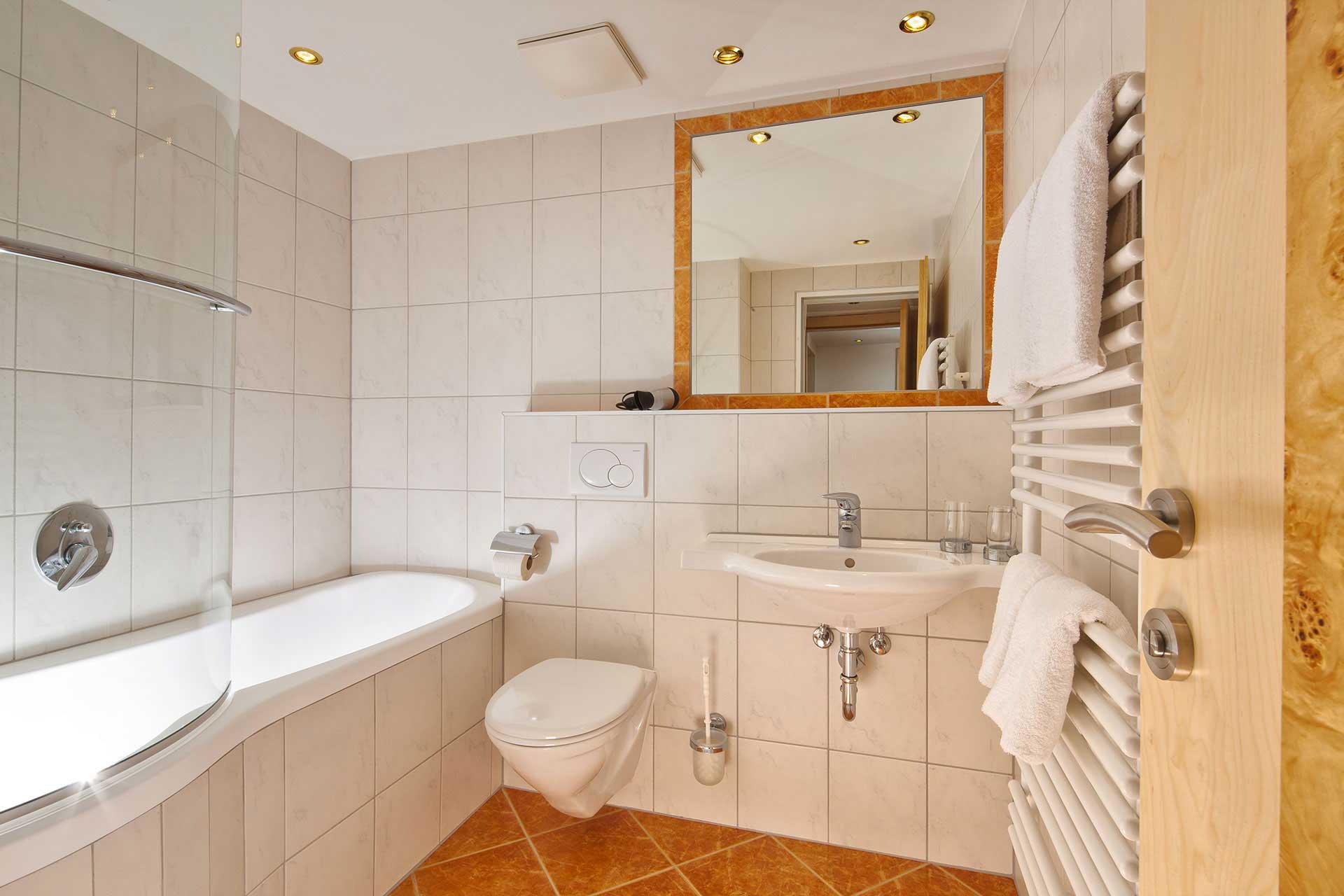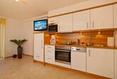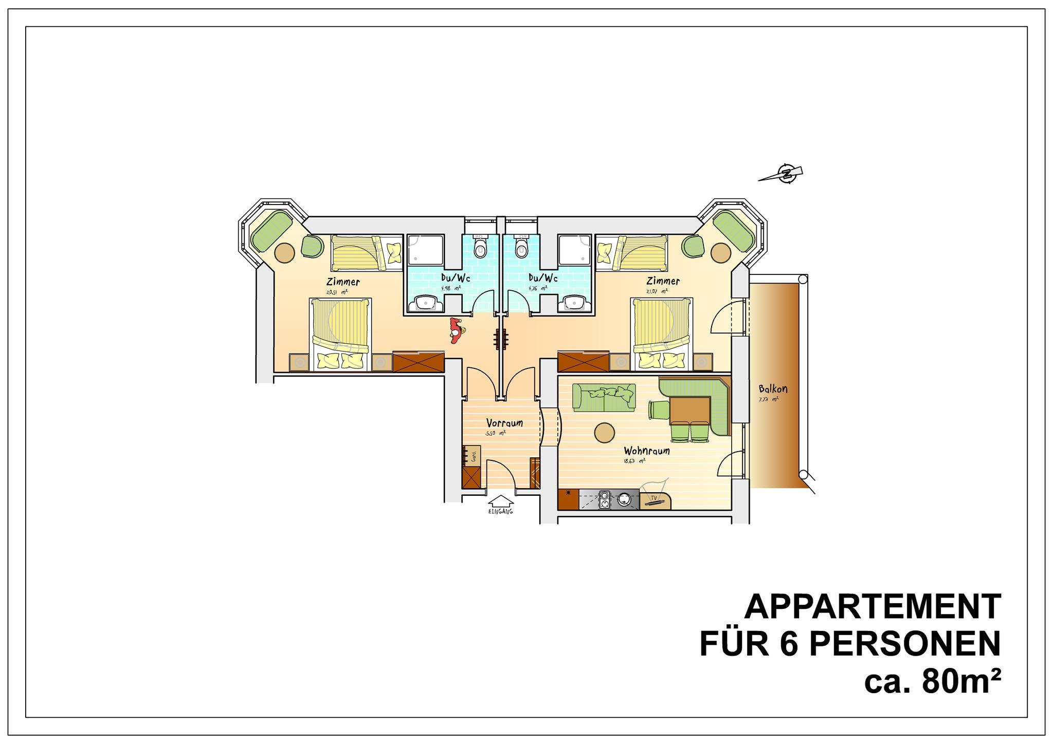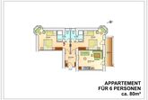zwei getrennte Schlafzimmer mit je einem Doppelbett sowie Schlafmöglichkeit für 5. und 6. Person. 2 getrennte Badezimmer mit Dusche/WC und Fön. Balkon, Vorraum mit Garderobe. Vollausgestattete Wohnküche mit Essecke, komplette Geschirr- und Kochausrüstung, Geschirrtücher, Handtücher, Bettwäsche. Flat-TV, Safe.
