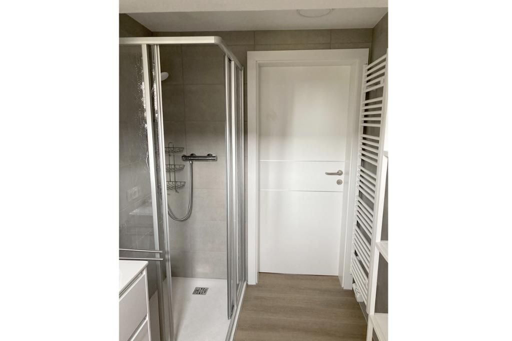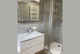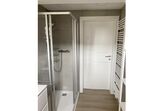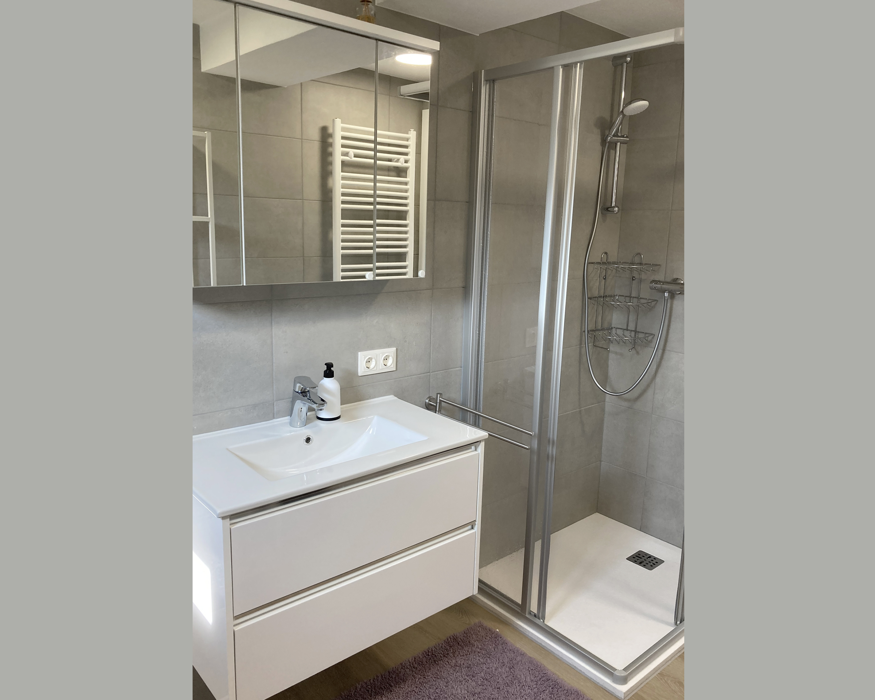 Das Badezimmer mit Fenster ist neu und modern gestaltet und ausgestattet mit WC und Dusche sowie Waschtisch inkl. Spiegelschrank.