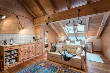 140 Jahre später erhielt der Hansstadl eine liebevolle Rundumsanierung und wird 2023 erstmals als Ferienhaus vermietet. Für die Renovierung wurde ausschließlich heimisches Lärchenholz aus der Teuchl verwendet. An der Inneneinrichtung erkennt man, dass bei den Arbeiten zwei Generationen am Werk waren. Moderne Details und traditionelle sowie nachhaltige Materialien verleihen der Hütte einen individuellen, zeitgemäßen und heimeligen Charakter.