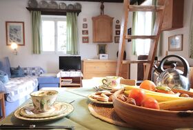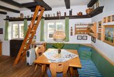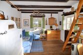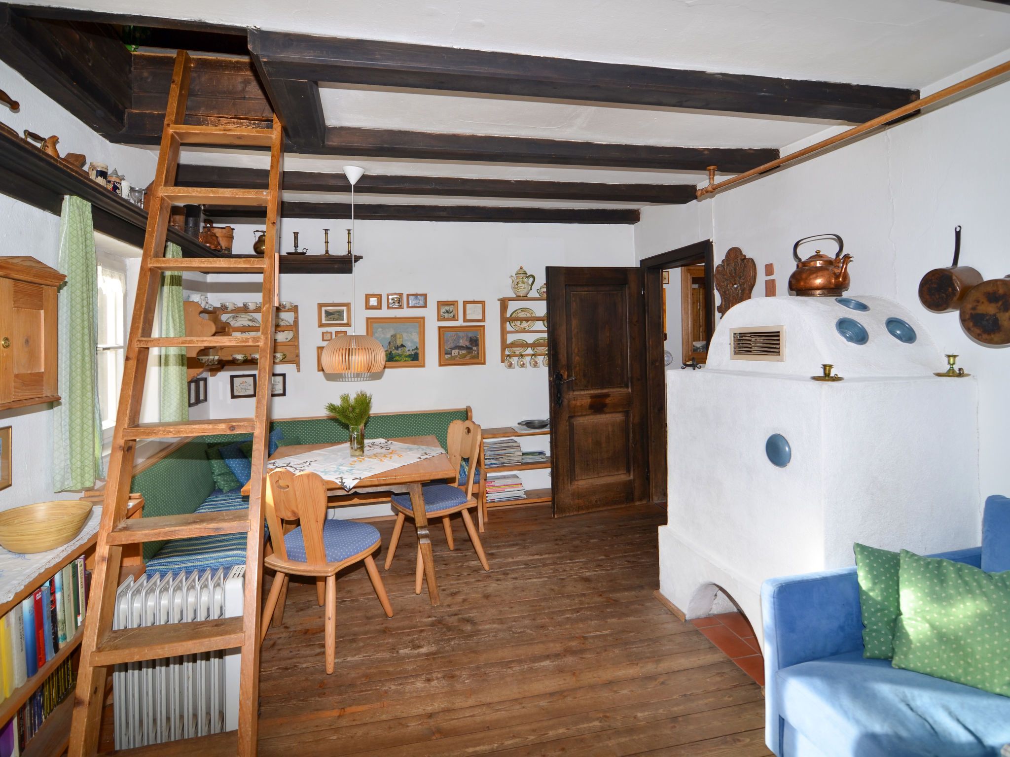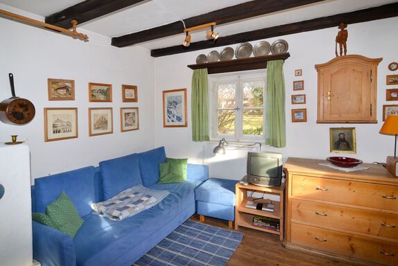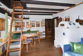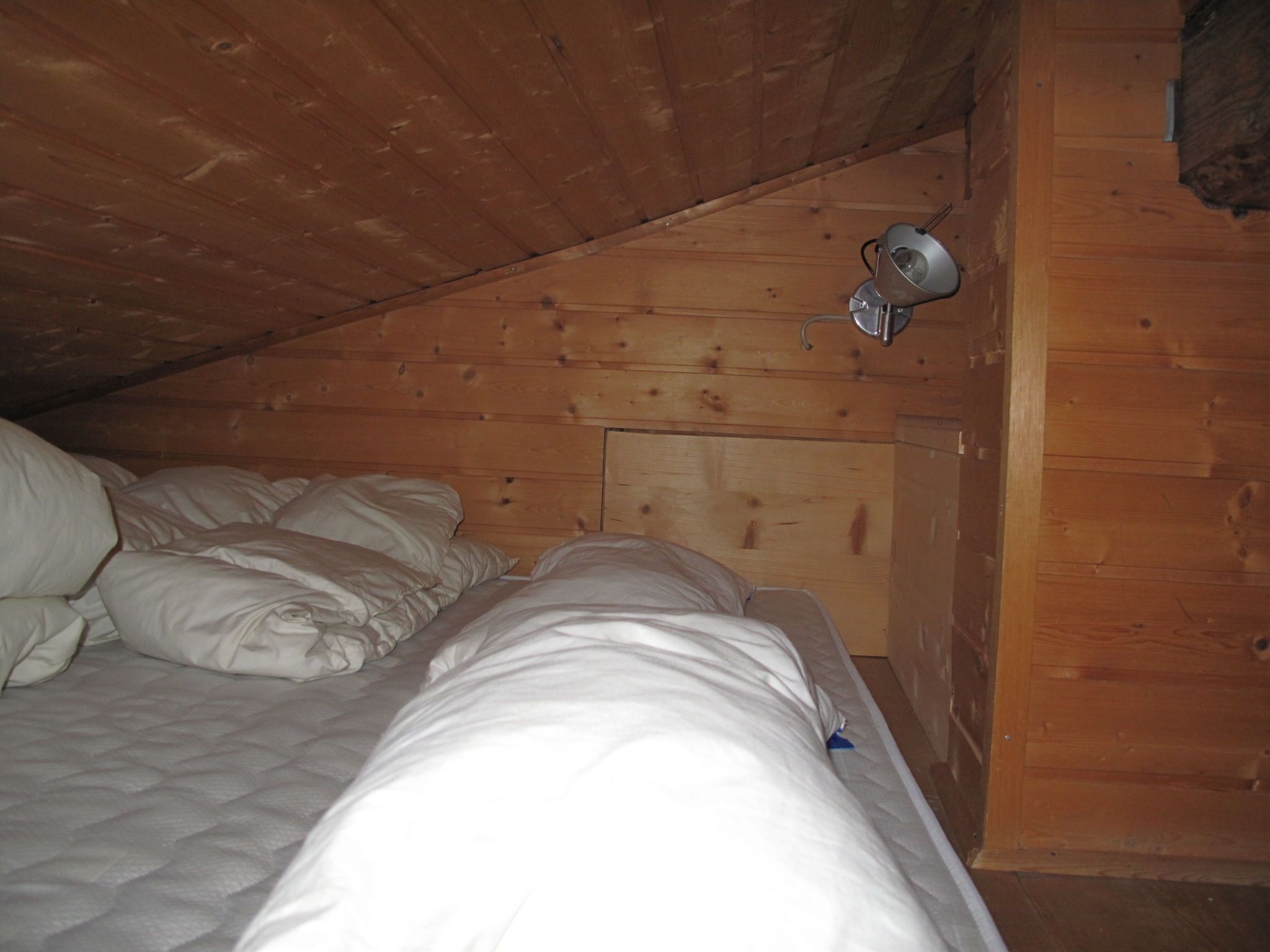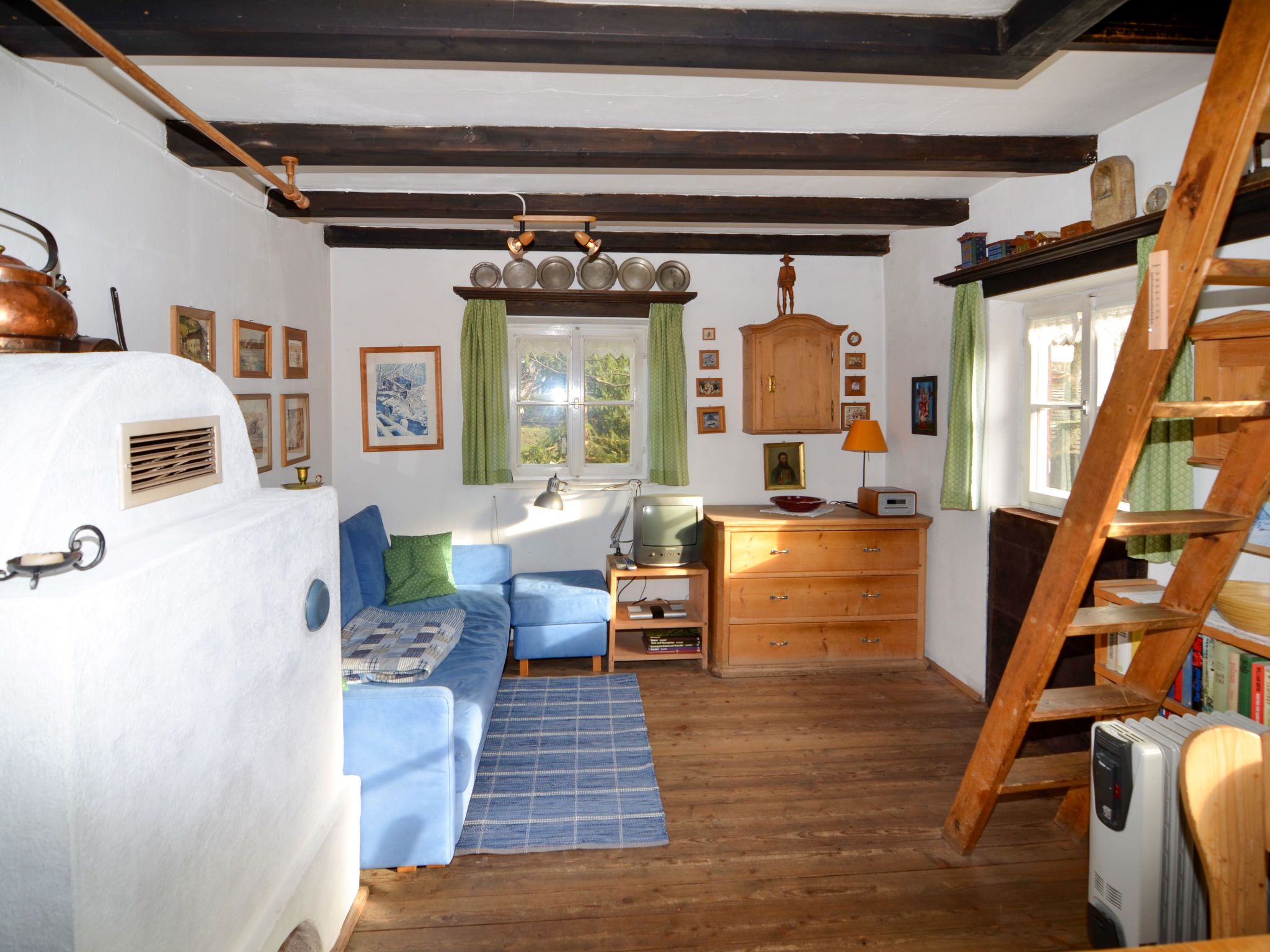 Hüttl, 2-Zimmer-Haus 35 m2. Rustikal und gemütlich eingerichtet: Wohn-/Schlafzimmer mit 1 Doppeldiwanbett, Essecke und Sat-TV (Flachbildschirm), E-Heizung und Kachelofen. Kleine Küche (2 Kochplatten, Mini-Backofen, Wasserkocher, elektrische Kaffeemaschine). Dusche, sep. WC. Fussbodenheizung. Obergeschoss: (Leiter) abgeschrägte Schlafnische, - 100 cm mit Dachfenster mit 4 Schlafmöglichkeiten. Holzdielenboden. Terrasse. Terrassenmöbel. Schöne Sicht auf die Berge und die Landschaft. Bitte beachten: geeignet für Familien, für Kleinkinder nicht geeignet. Nichtraucher-Haus. Maximale Belegung: 4 Personen. Anstelle eines abgeschlossenen Schlafzimmers befinden sich manche Schlafplätze in einem offenen Bereich (Galerie, Nische etc.).