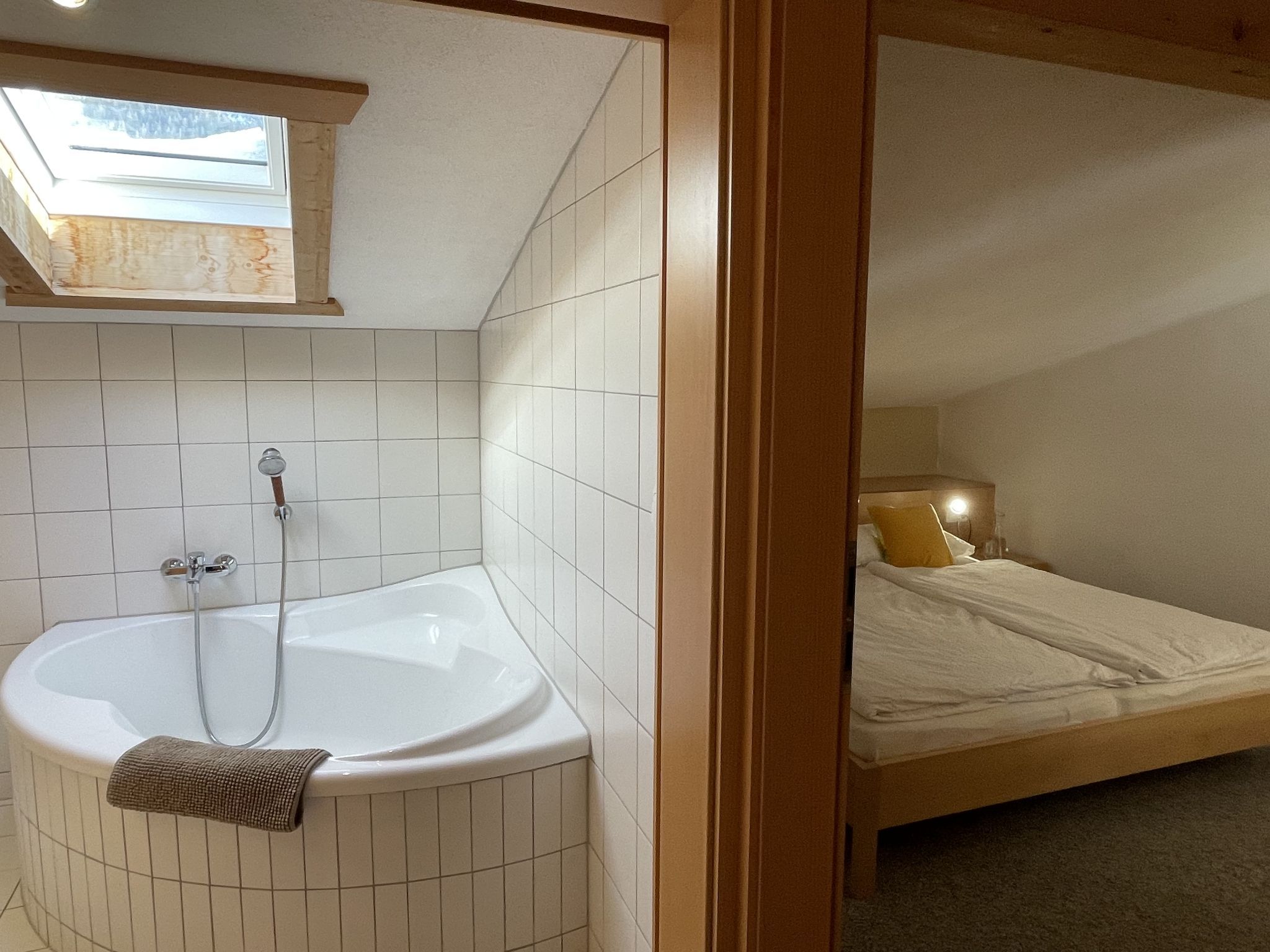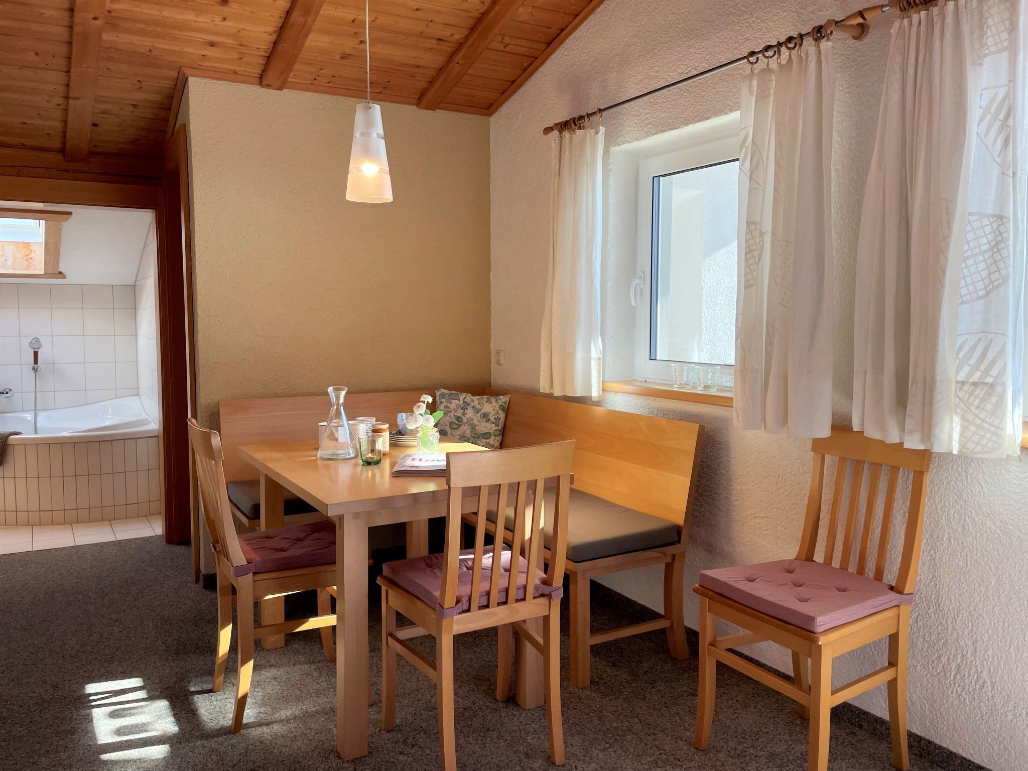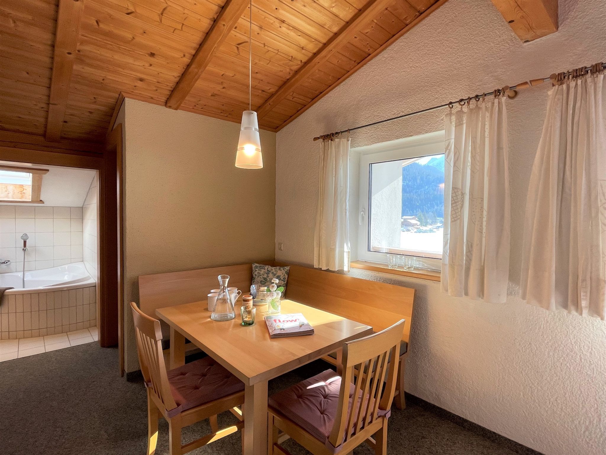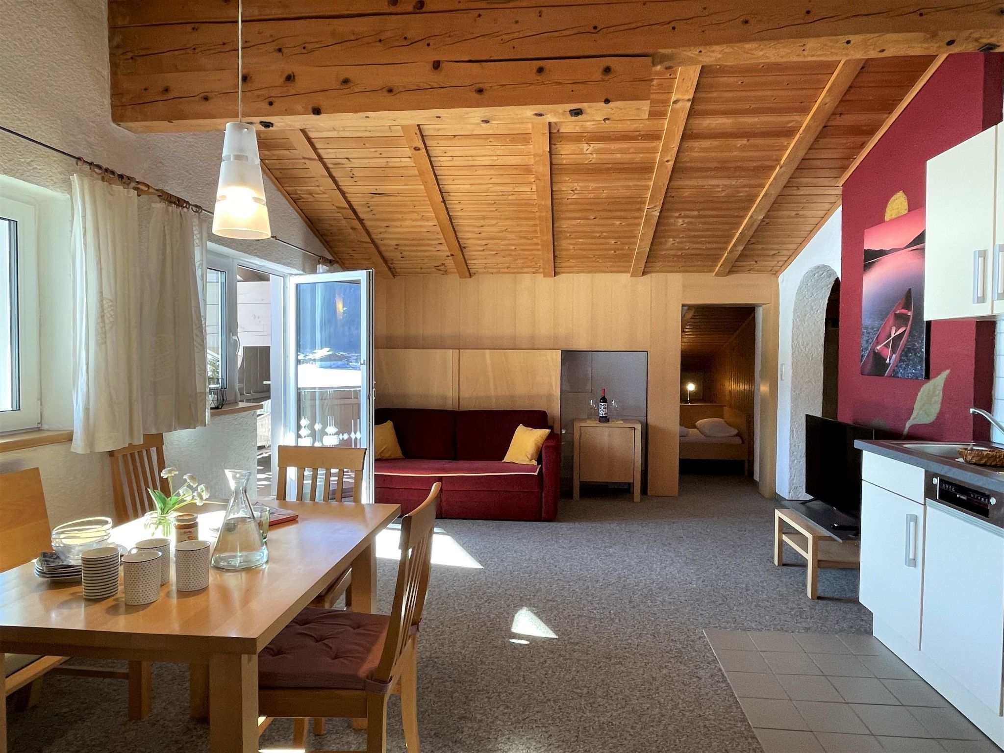 Rofan, 3-Zimmer-Wohnung 57 m2, im Dachgeschoss. Objekt geeignet für 3 Erwachsene + 2 Kinder. Abgeschrägt, gemütlich und mit viel Holz eingerichtet: grosses Wohn-/Schlafzimmer mit 1 Doppeldiwanbett, Essecke und Sat-TV (Flachbildschirm). Ausgang zum Balkon. 1 abgeschrägtes kleines Zimmer, Deckenhöhe 80 - 150 cm mit Schiebetür mit 2 Betten. 1 Doppelzimmer. Offene Küche (Backofen, Geschirrspüler, 4 Glaskeramikplatten, elektrische Kaffeemaschine). Bad/WC mit Eckbadewanne. Ölheizung. Balkon. Balkonmöbel, Abstellkammer. Sehr schöne Sicht auf die Berge. Zur Verfügung: Internet (WLAN, gratis). Parkplatz (überdacht, 1 Auto). Bitte beachten: Nichtraucher-Unterkunft. Flexibilität bei der Bettenaufteilung: Es stehen mehr Schlafmöglichkeiten zur Verfügung als die maximal zugelassene Personenzahl, diese darf dennoch nicht überschritten werden.