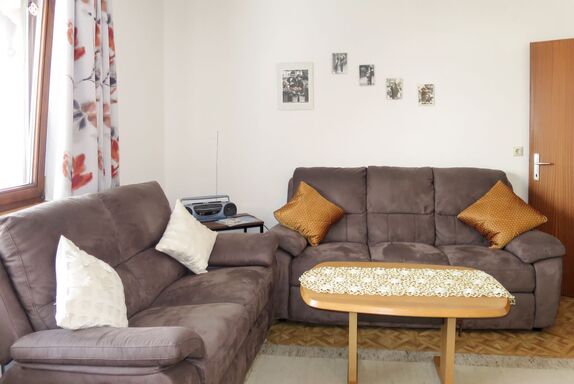 4-Zimmer-Wohnung 85 m2, im ebenerdigen Untergeschoss. Hell, einfach eingerichtet: Wohn-/Esszimmer mit Sat-TV (Flachbildschirm), Radio. 2 Doppelzimmer, jedes Zimmer mit Waschbecken. 1 Doppelzimmer mit Waschbecken. Ausgang zur Terrasse. Küche (4 Kochplatten, Backofen, Toaster, Wasserkocher, Mikrowelle, elektrische Kaffeemaschine) mit Esstisch. Dusche, sep. WC. Ölheizung. Parkettboden. Terrasse. Terrassenmöbel. Herrliche Panoramasicht. Zur Verfügung: Kinderhochstuhl. Internet (WLAN, gratis). Bitte beachten: Nichtraucher-Unterkunft. Bei Belegung mit weniger Personen als der maximalen Personenzahl stehen nicht alle Wohneinheiten zur Verfügung.