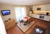 1 Dreibettzimmer mit Doppelbett (separate Betten möglich) und Einzelbett, Kabel-Flat-TV; 1 Badezimmer mit Dusche/WC und Föhn; voll ausgestattete Wohnküche mit großem Panoramafenster und gemütlichen Wohnbereich mit Essecke, Sofa und Flat-TV; Größe: ca. 55 m²;