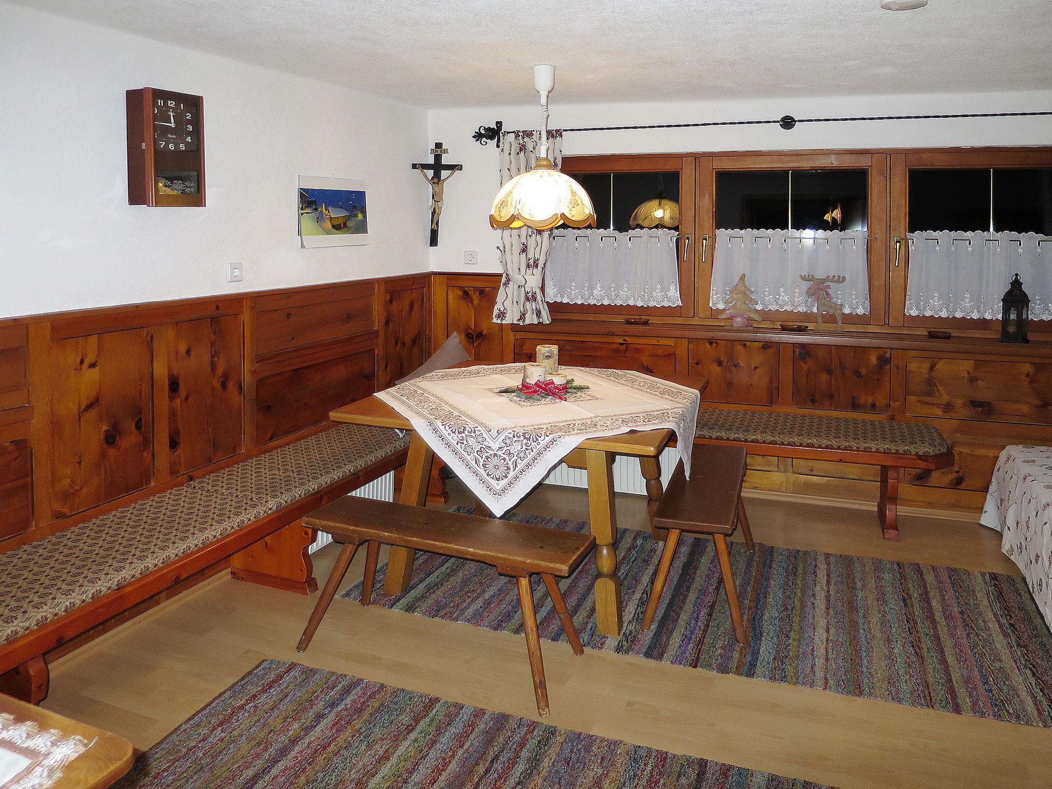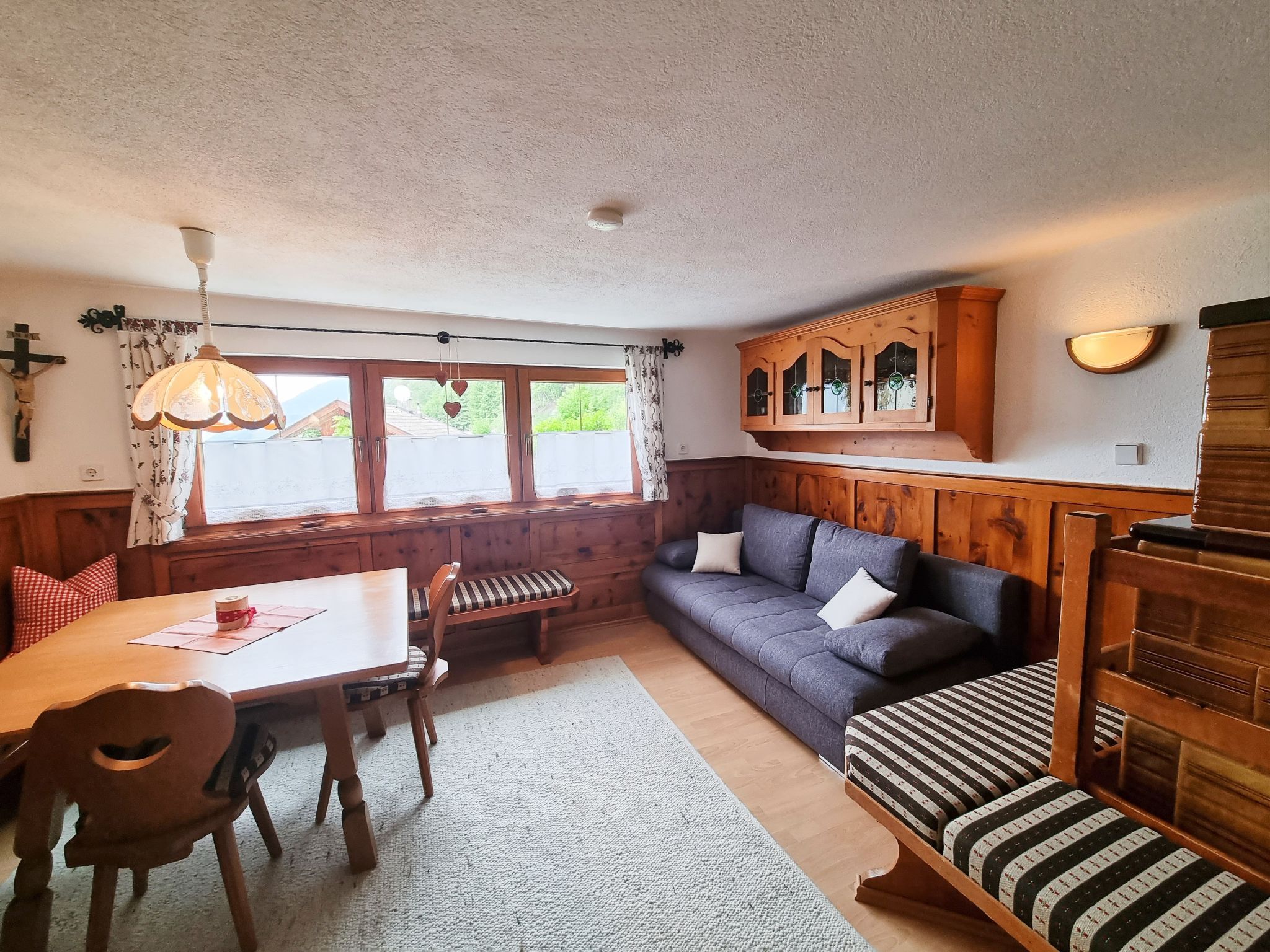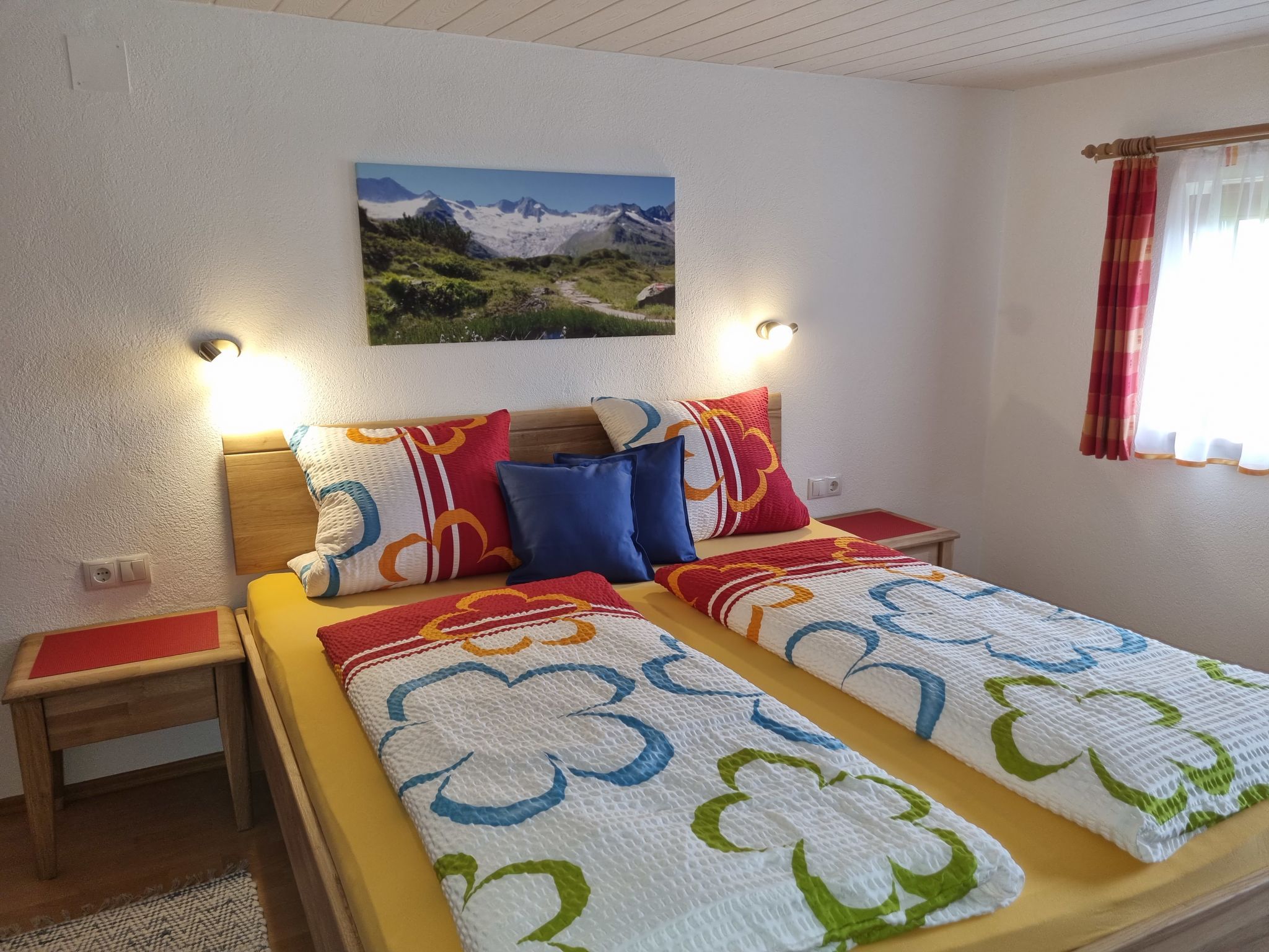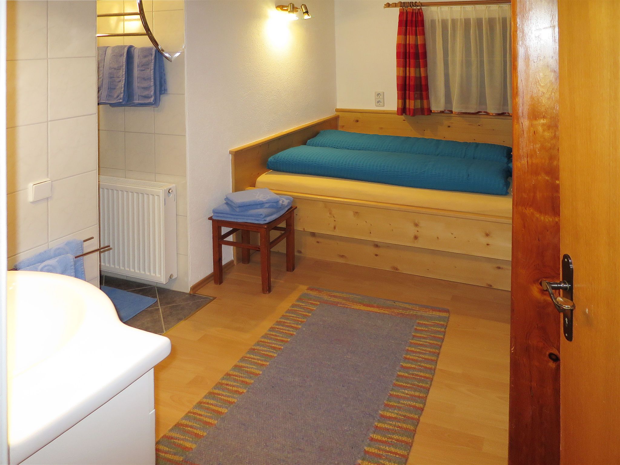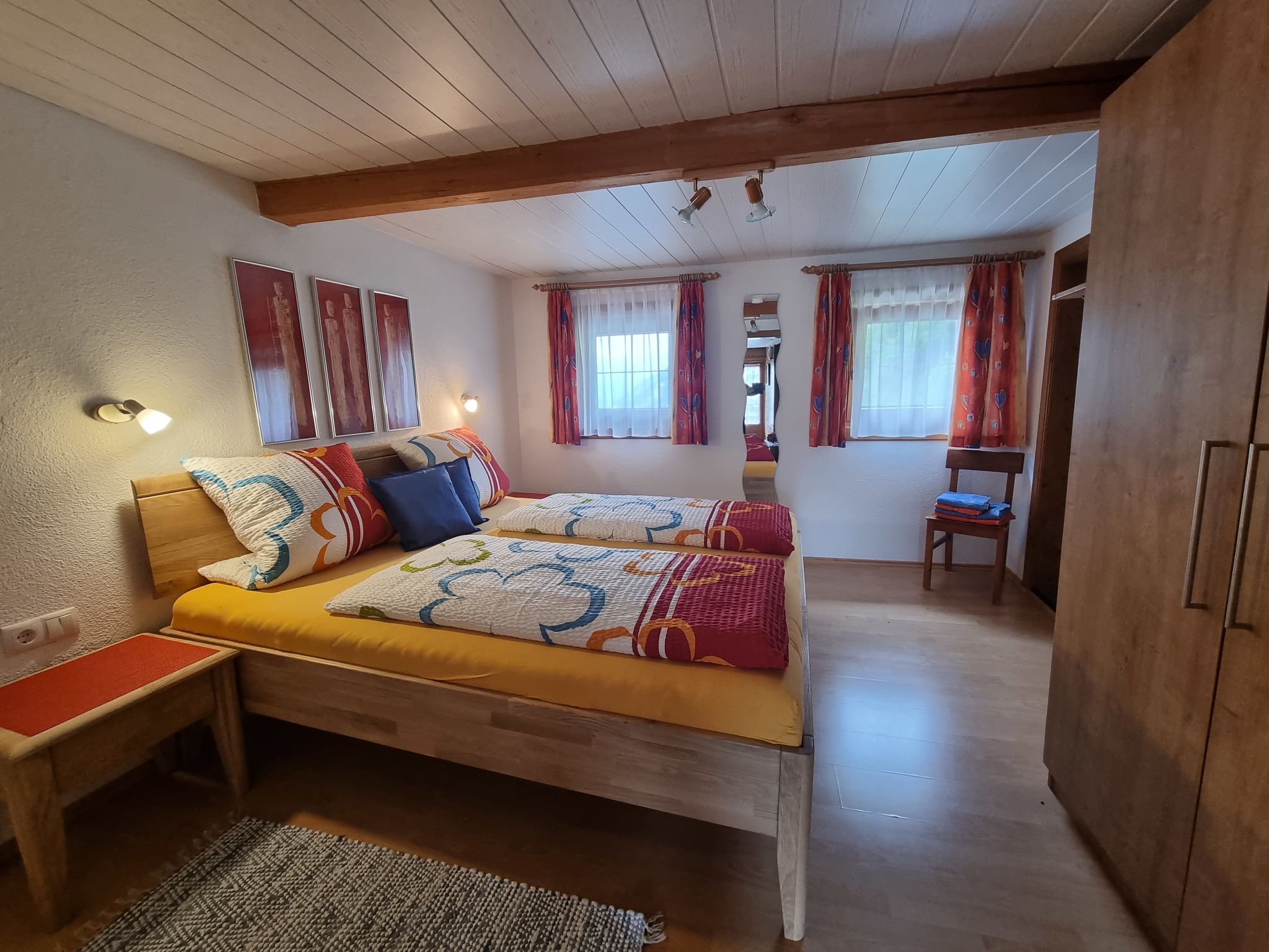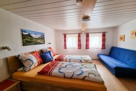 Egger, 4-Zimmer-Haus 110 m2 auf 2 Stockwerken. Gemütlich eingerichtet: Wohn-/Esszimmer mit 1 Diwanbett, Esstisch, Sat-TV und Kachelofen. Küche (Backofen, Geschirrspüler, 4 Glaskeramikplatten, Toaster, Wasserkocher, Mikrowelle, elektrische Kaffeemaschine) mit Essecke. Sep. WC. Obergeschoss: 1 Doppelzimmer mit Dusche und Sat-TV. Durchgangszimmer mit 1 Diwanbett, 1 Doppelbett und Waschbecken. 1 kleines Zimmer mit 1 franz. Bett und Dusche. Ausgang zum Balkon. Sep. WC. Balkon, Terrasse, Gartensitzplatz. Terrassenmöbel, Balkonmöbel, Gartengrill, Liegestühle (6). Herrliche Panoramasicht auf die Berge. Zur Verfügung: Waschmaschine, Haartrockner. Internet (Wireless LAN, gratis). E-Ladestation. Bitte beachten: Nichtraucher-Unterkunft. Eigener Eingang, Rauchmelder, Feuerlöscher. Bei Belegung mit weniger Personen als der maximalen Personenzahl stehen nicht alle Schlafzimmer zur Verfügung.