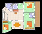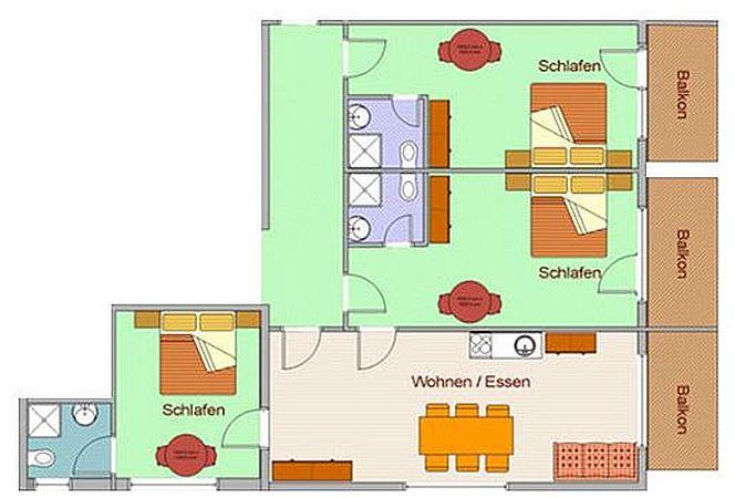 XL-Appartement mit ca. 100 m ² Wohlfühlfläche: 3 Doppelzimmer (1 Schlafzimmer mit Badezimmer liegt außerhalb vom Appartement, gleich nebenan mit separatem Eingang) mit Kabel Flat-TV, Safe; 3 Badezimmer mit Dusche/WC, Kosmetikspiegel, Föhn, vollausgestattete Wohnküche mit großzügigen Essbereich und gemütliches Sofa (Schlafmöglichkeit für 2 weitere Personen), Flat-TV; Balkon mit herrlicher Aussicht (teilweise auch zusätzlich mit Wintergarten).