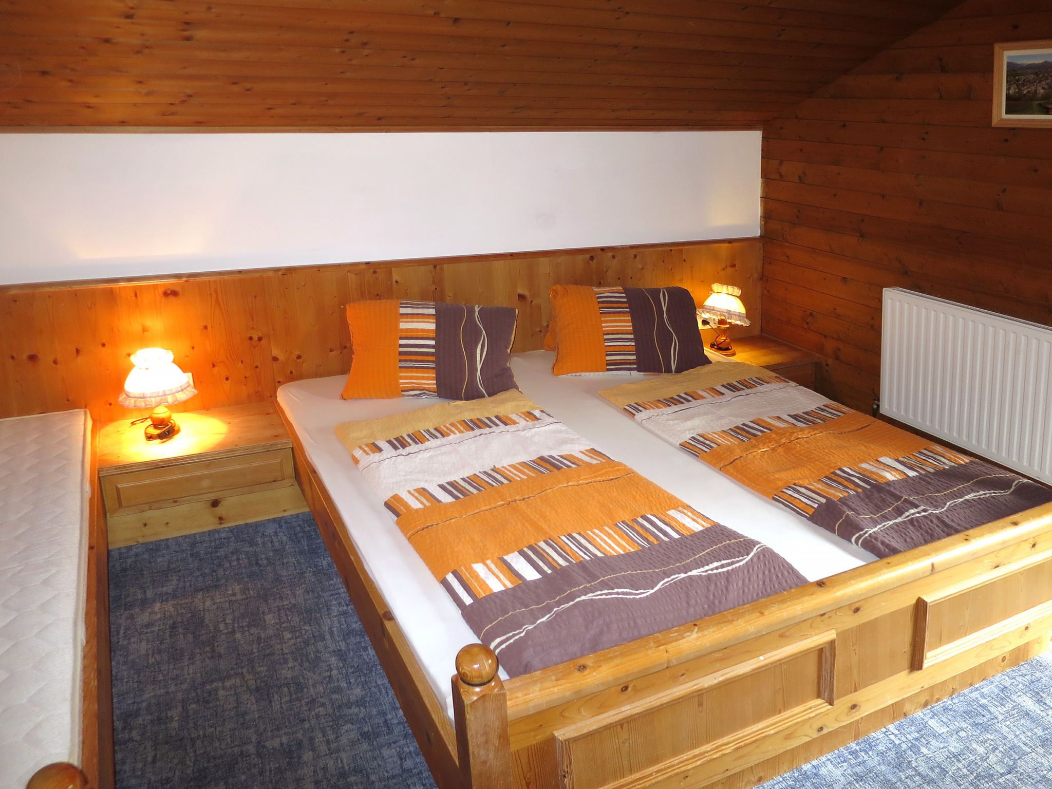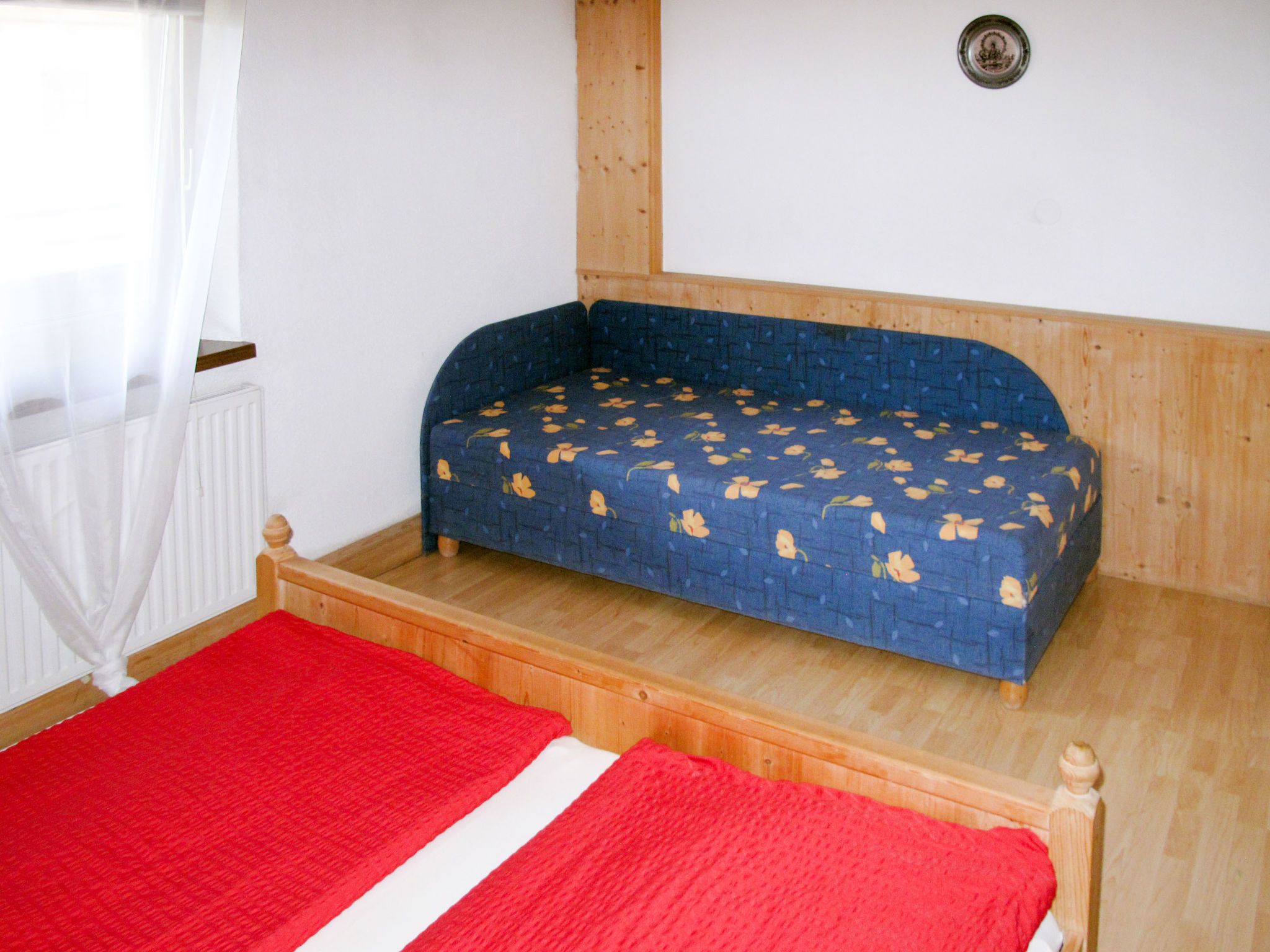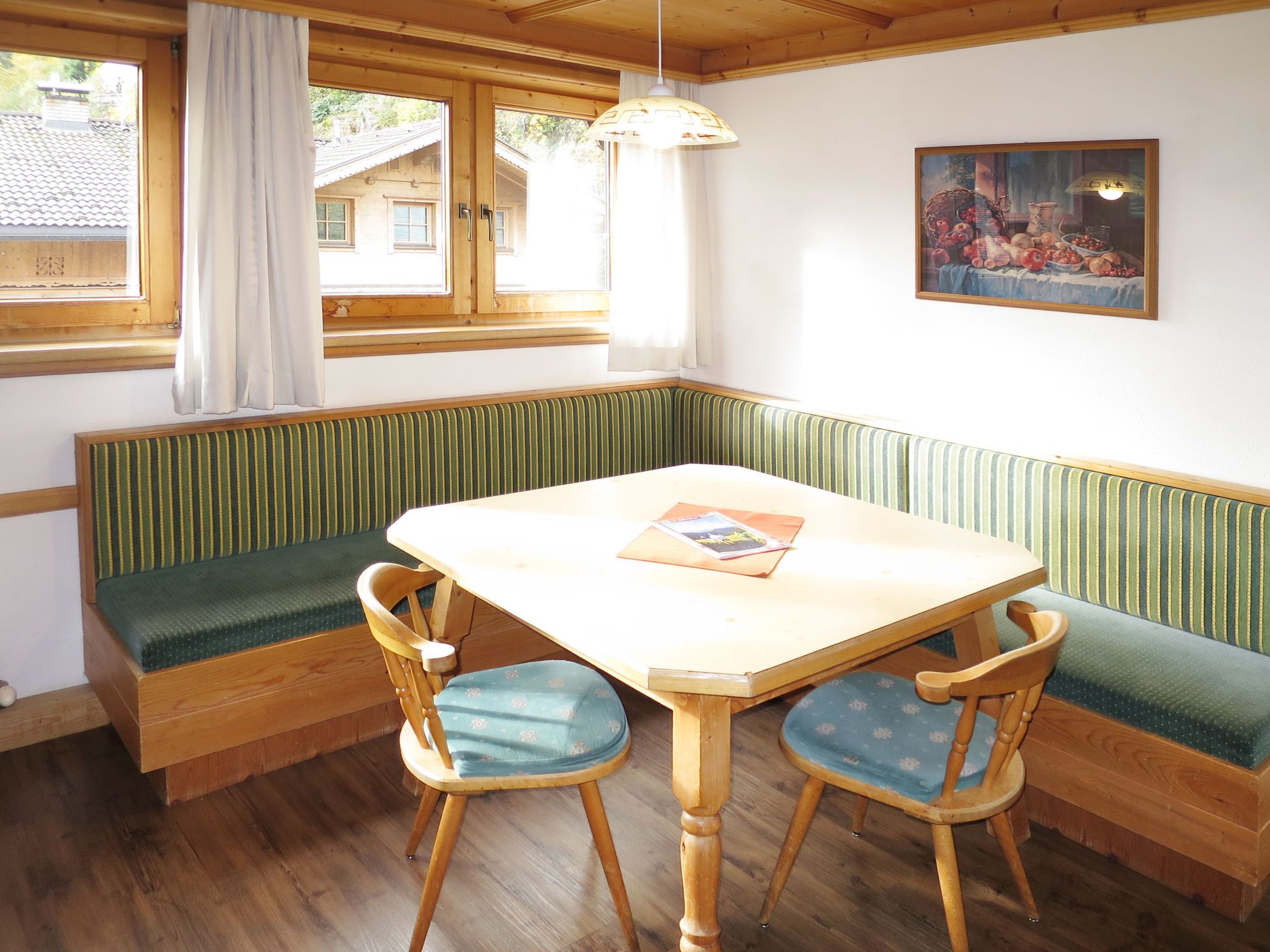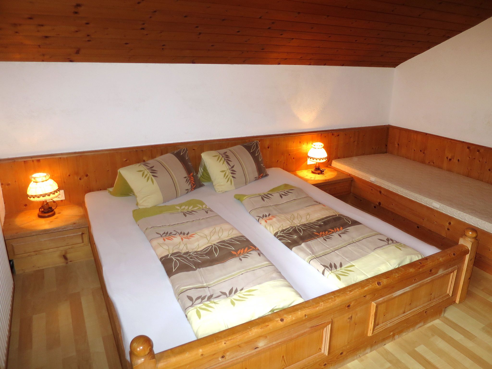 Eberharter, 7-Zimmer-Wohnung 150 m2 auf 2 Stockwerken. Gemütlich und mit viel Holz eingerichtet: Obergeschoss: Wohnzimmer mit Esstisch, Sat-TV, DVD und Kachelofen. 1 Doppelzimmer. 1 Zimmer mit 1 Bett und 1 Doppelbett. Küche (Backofen, Geschirrspüler, 4 Glaskeramikplatten, Wasserkocher, elektrische Kaffeemaschine) mit Esstisch. Bad/WC, sep. WC, Doppelwaschbecken. 2. Obergeschoss: 2 Zimmer, jedes Zimmer mit 1 Bett und 1 Doppelbett. Ausgang zum Balkon. 1 abgeschrägtes kleines Zimmer mit 1 franz. Bett. Wohnküche (4 Kochplatten, Backofen, Geschirrspüler, Toaster, Wasserkocher, elektrische Kaffeemaschine) mit Esstisch, Sat-TV und DVD. Dusche, sep. WC. Teppichboden. Balkon 10 m2, Balkon 20 m2. Balkonmöbel. Zur Verfügung: Internet (Wireless LAN, gratis). Bitte beachten: ein Doppelzimmer liegt außerhalb der Wohnung. Nichtraucher-Unterkunft. Feuerlöscher. Keine interne Verbindung zwischen den Etagen.