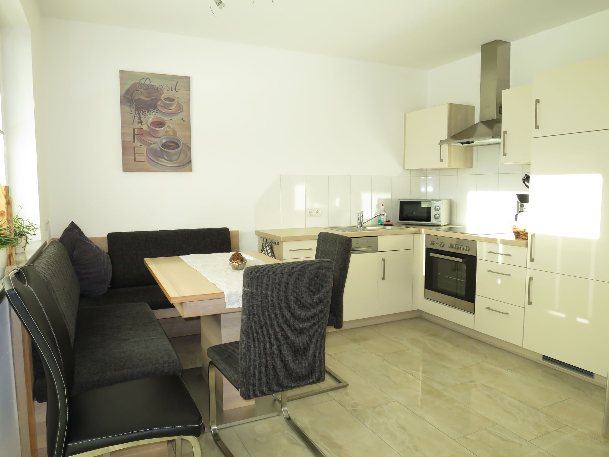 Hanser, 3-Zimmer-Wohnung 55 m2, im Erdgeschoss. Geschmackvoll eingerichtet: 1 Zimmer mit 1 Doppelbett und Sat-TV. 1 Zimmer mit 1 Doppelbett. Wohnküche (Backofen, Geschirrspüler, 4 Glaskeramikplatten, Toaster, Wasserkocher, Mikrowelle, Tiefkühler, elektrische Kaffeemaschine) mit Essecke und Sat-TV. Ausgang zur Terrasse. Dusche/WC, sep. WC. Heizung. Terrasse teilweise überdacht. Terrassenmöbel, Gartengrill (mobil), Liegestühle (4). Zur Verfügung: Kinderhochstuhl, Babybett. Internet (Wireless LAN, gratis). Bitte beachten: Nichtraucher-Unterkunft. Eigener Eingang, Rauchmelder.