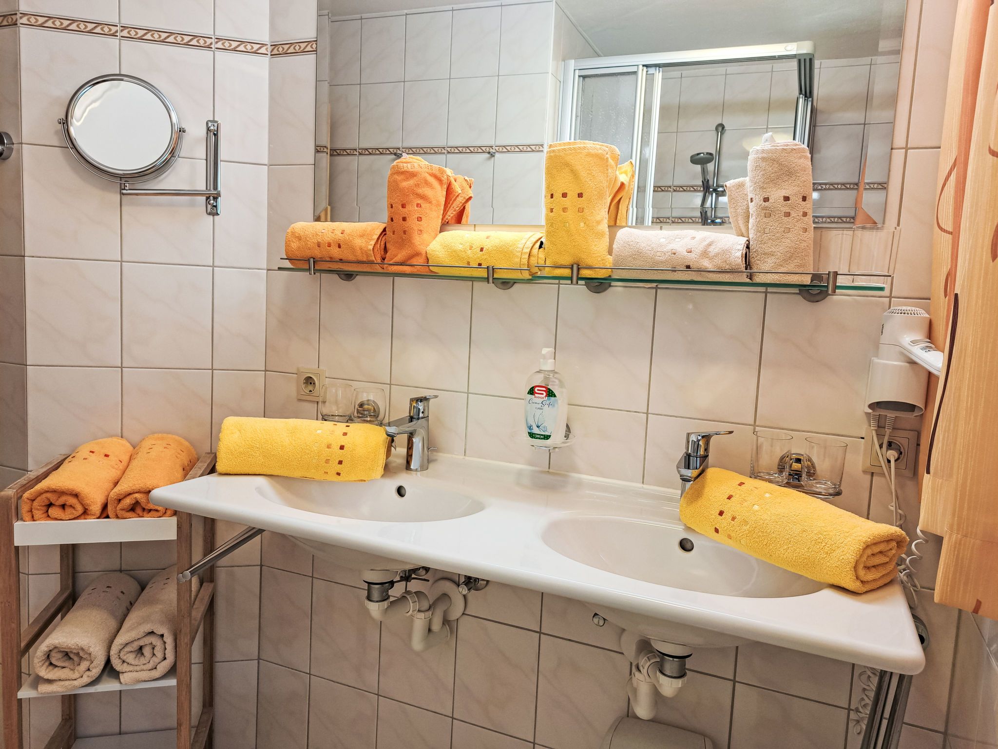 Rosa, 4-Zimmer-Wohnung 60 m2, im erhöhten Erdgeschoss. Objekt geeignet für 6 Erwachsene. Hell, gemütlich eingerichtet: Eingang mit Esstisch und Sat-TV. Ausgang zur Terrasse. 1 Doppelzimmer. 2 Doppelzimmer. Ausgang zur Terrasse. Küche (Geschirrspüler, 4 Glaskeramikplatten, Toaster, Wasserkocher, Mikrowelle, Grill, elektrische Kaffeemaschine). Dusche, sep. WC, Doppelwaschbecken. Terrasse 25 m2 teilweise überdacht. Terrassenmöbel. Sicht auf die Berge. Zur Verfügung: Safe. Internet (WLAN, gratis). Bitte beachten: Nichtraucher-Unterkunft. 1 kleines Haustier/Hund erlaubt. Rauchmelder, Feuerlöscher. Der Fahrstuhl stoppt im Zwischenstock, 5 Stufen bis zur Wohnung!