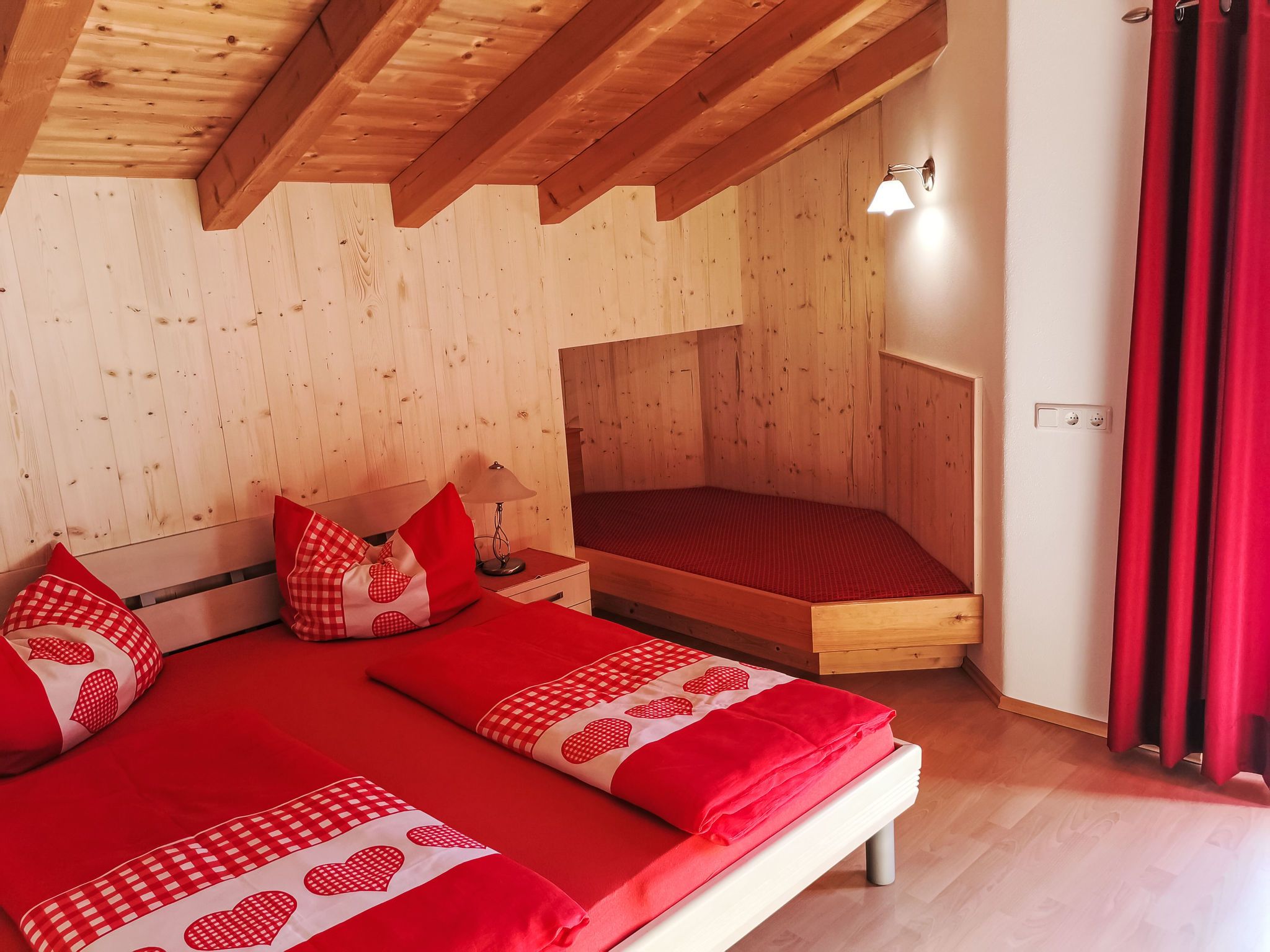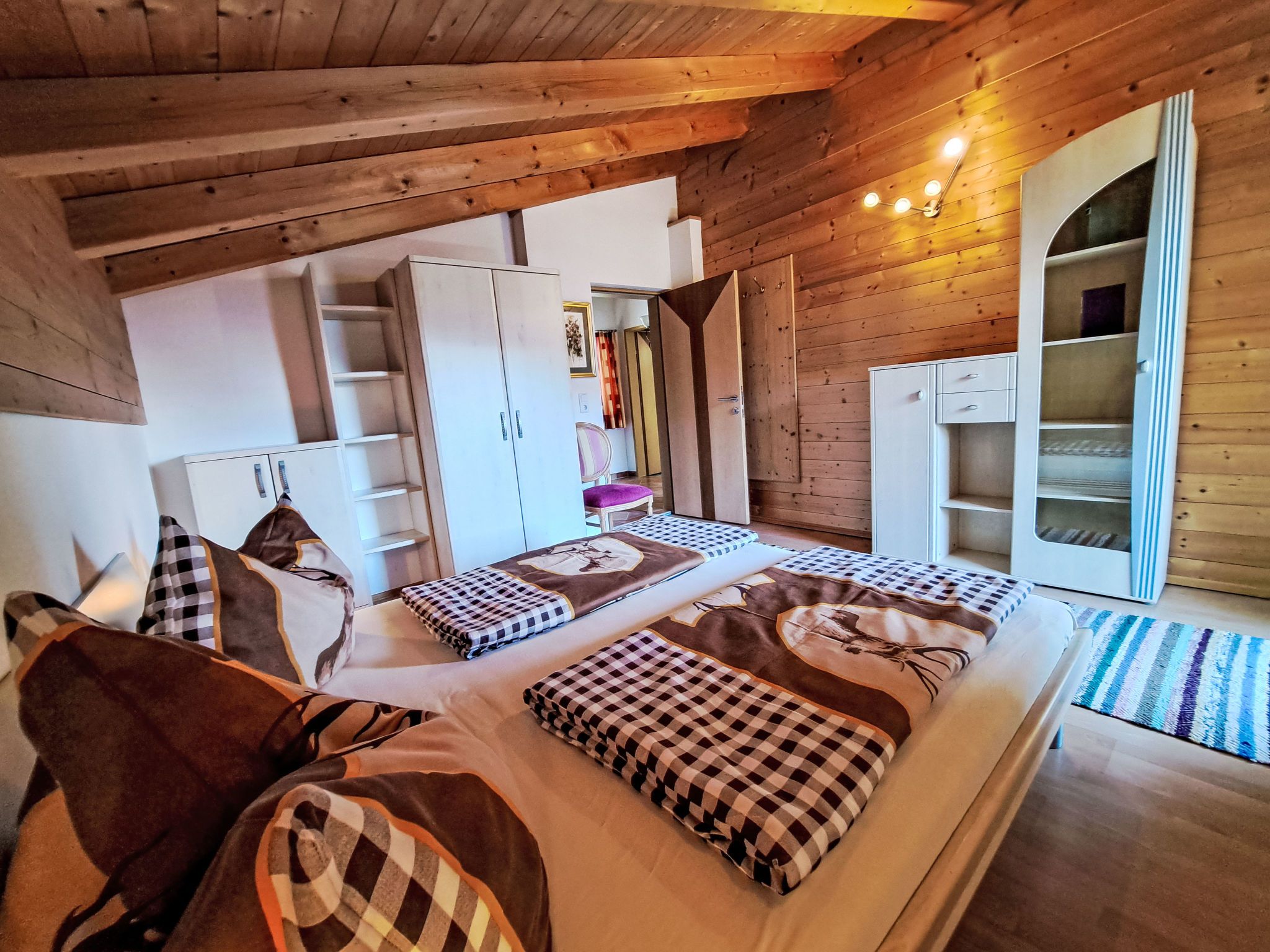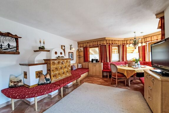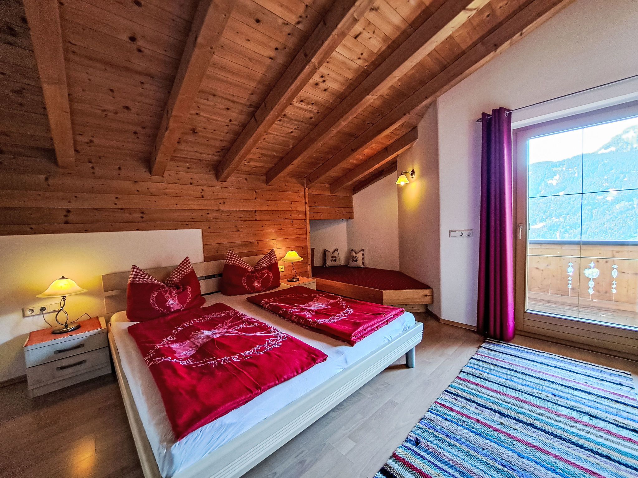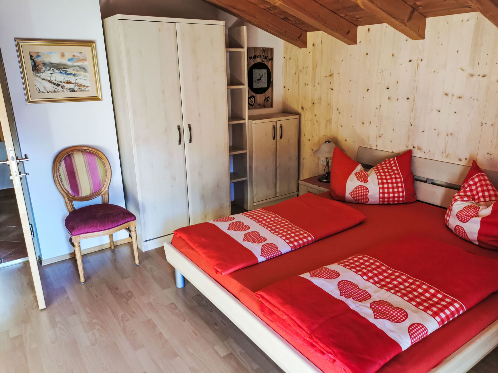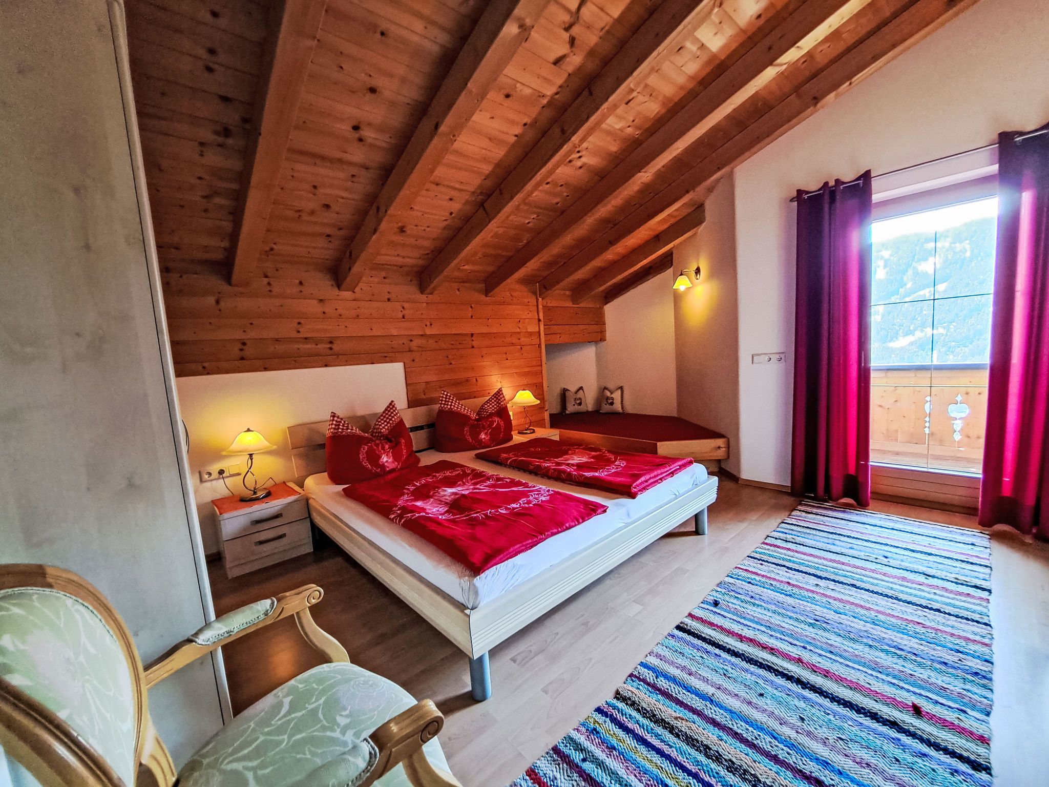 Reichegger, 3-Zimmer-Haus. Wohn-/Esszimmer mit Essecke, Sat-TV und Radio. Ausgang zum Balkon, zur Terrasse. Offene Küche (Backofen, Geschirrspüler, 4 Glaskeramikplatten, Toaster, Wasserkocher, Mikrowelle, Tiefkühler, elektrische Kaffeemaschine). Sep. WC. Fussbodenheizung. Obergeschoss: 1 Zimmer mit 1 Bett (97 cm, Länge 195 cm), 1 Doppelbett. Ausgang zum Balkon. 1 Doppelzimmer. Ausgang zum Balkon. Dusche/WC. Ölheizung, Fussbodenheizung. Balkon 15 m2, Terrasse. Terrassenmöbel, Balkonmöbel. Herrliche Panoramasicht. Zur Verfügung: Sauna (extra). Internet (WLAN, gratis). Bitte beachten: Nichtraucher-Haus. Rauchmelder, Feuerlöscher. Beide Zimmer im Obergeschoss haben eine Dachschräge mit sichtbaren Holzdachstuhl für Wohlfühlatmosphäre! Die Kaution ist in Bar am Anreisetag zu begleichen!